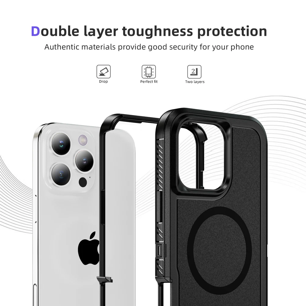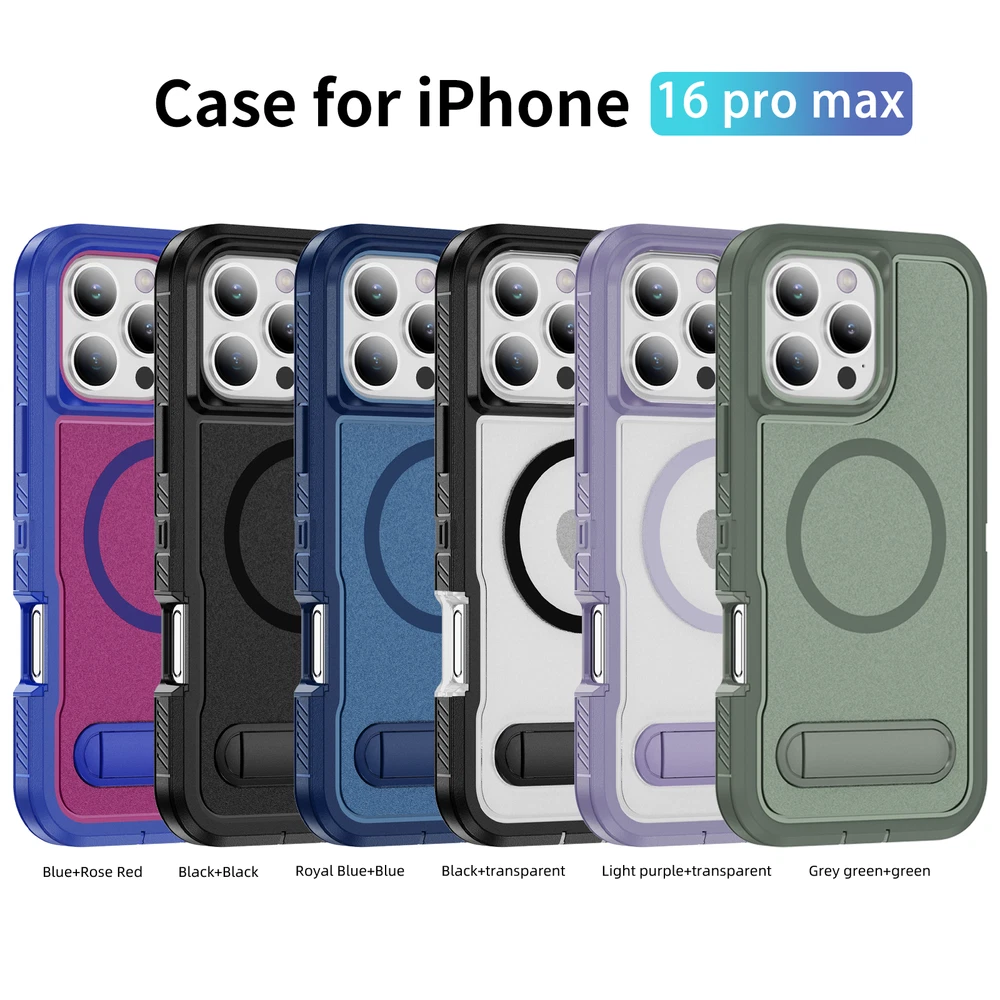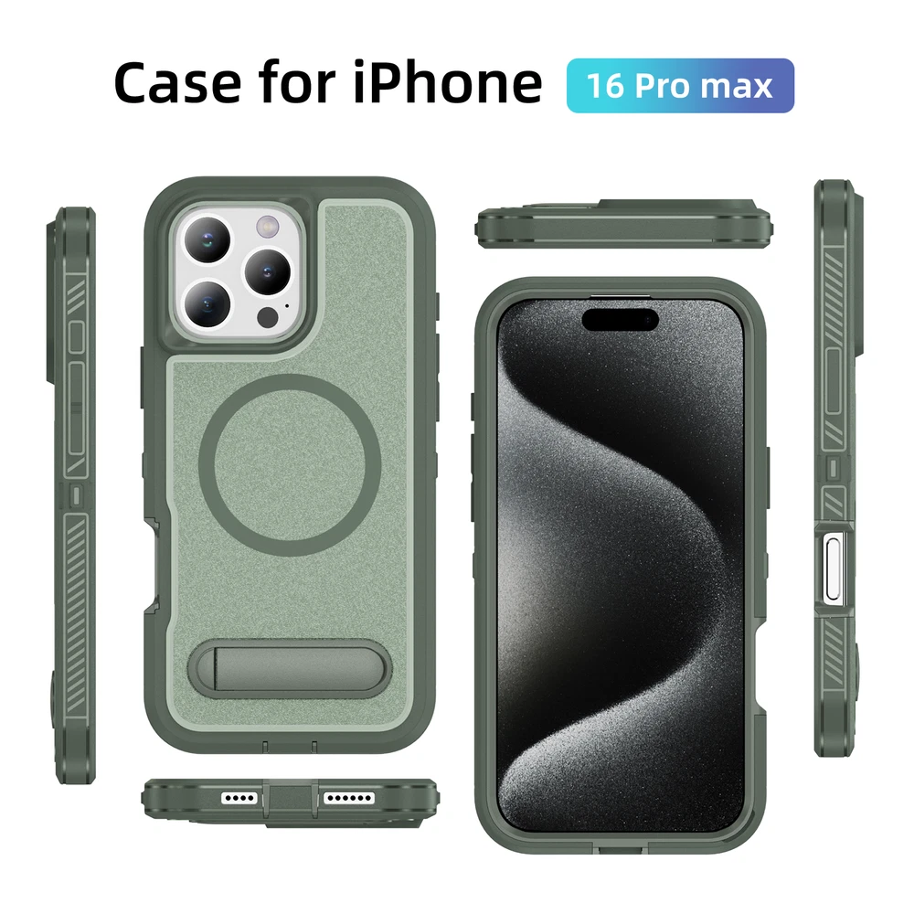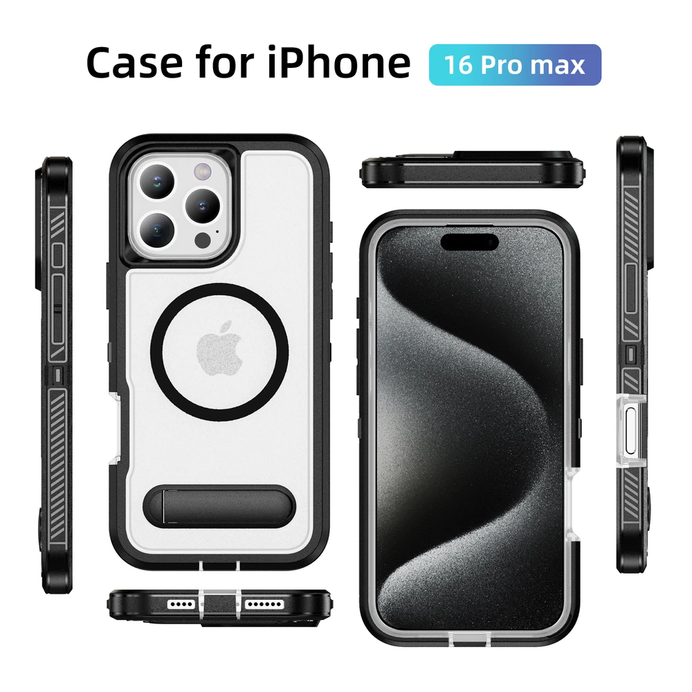 Fr iPhone 16 Pro Max 15 14 13 11 Mag Safe Case Built-in Stand + Screen Protector Key Features: Military-Grade Drop Protection: Advanced shockproof technology on all four corners and a 3-ply cushioning TPU bumper provide superior protection.Raised bezels around the screen and camera offer extra defense against dust and scratches. Enhanced Magnetic Compatibility: Compatible with Mag Safe accessories including Magnetic wallets, Car Mounts, etc, this case aligns perfectly with Magnetic chargers for a secure connection and faster wireless charging. Built-in Hidden Kickstand: The phone case is built in a hidden stand, which can hold your phone up vertically or horizontally as you wish to release your hands. Whether you're watching TV shows or video-chatting, this case with stand offers the perfect viewing angle based on ergonomic considerations to ensure optimal viewing comfort. Package: 1* Case Cover (Phone Is not included!) 1* Screen Protector