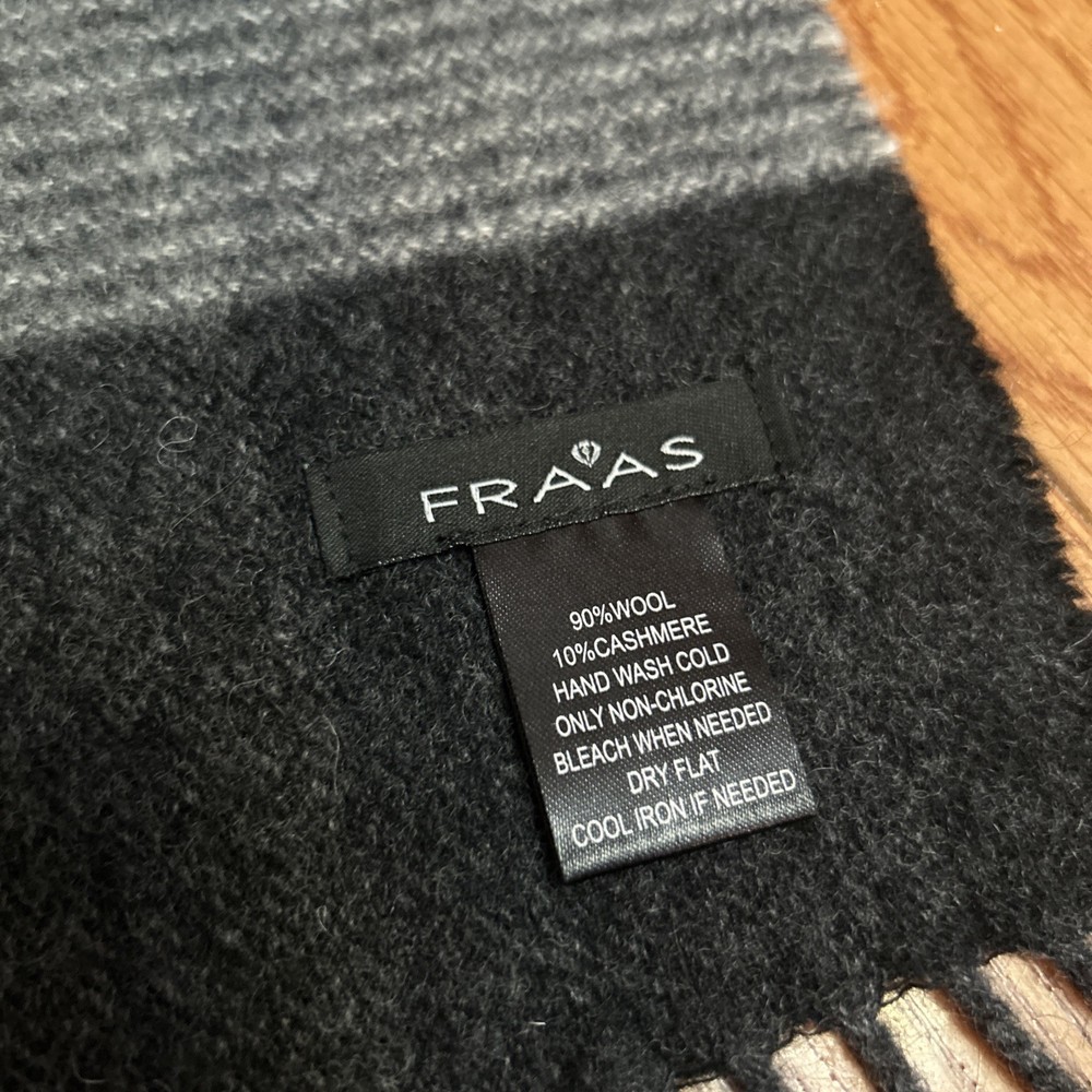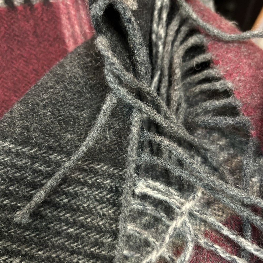cashmere and wool Fraas plaid scarf with fringe colorway: deep red, black, and gray 90% wool 10% cashmere length: 68 inches width: 13 inches dry clean only
