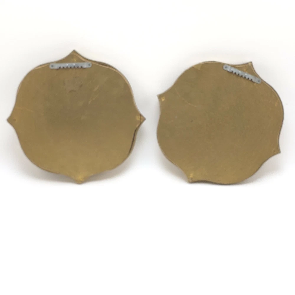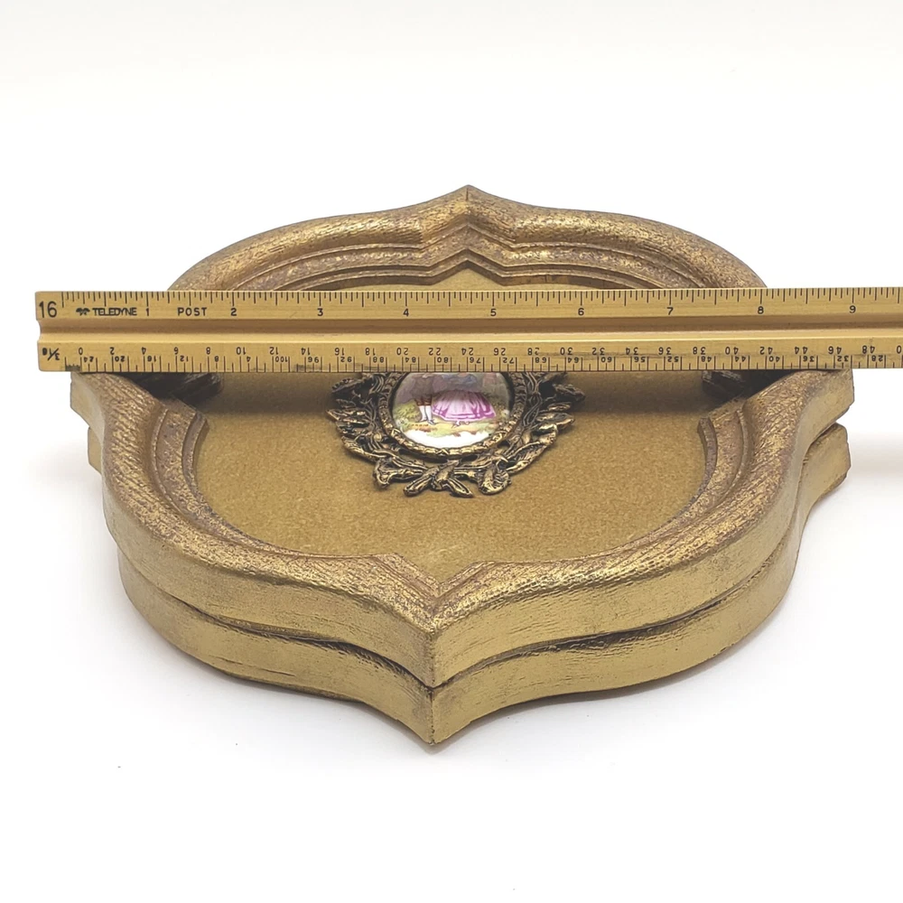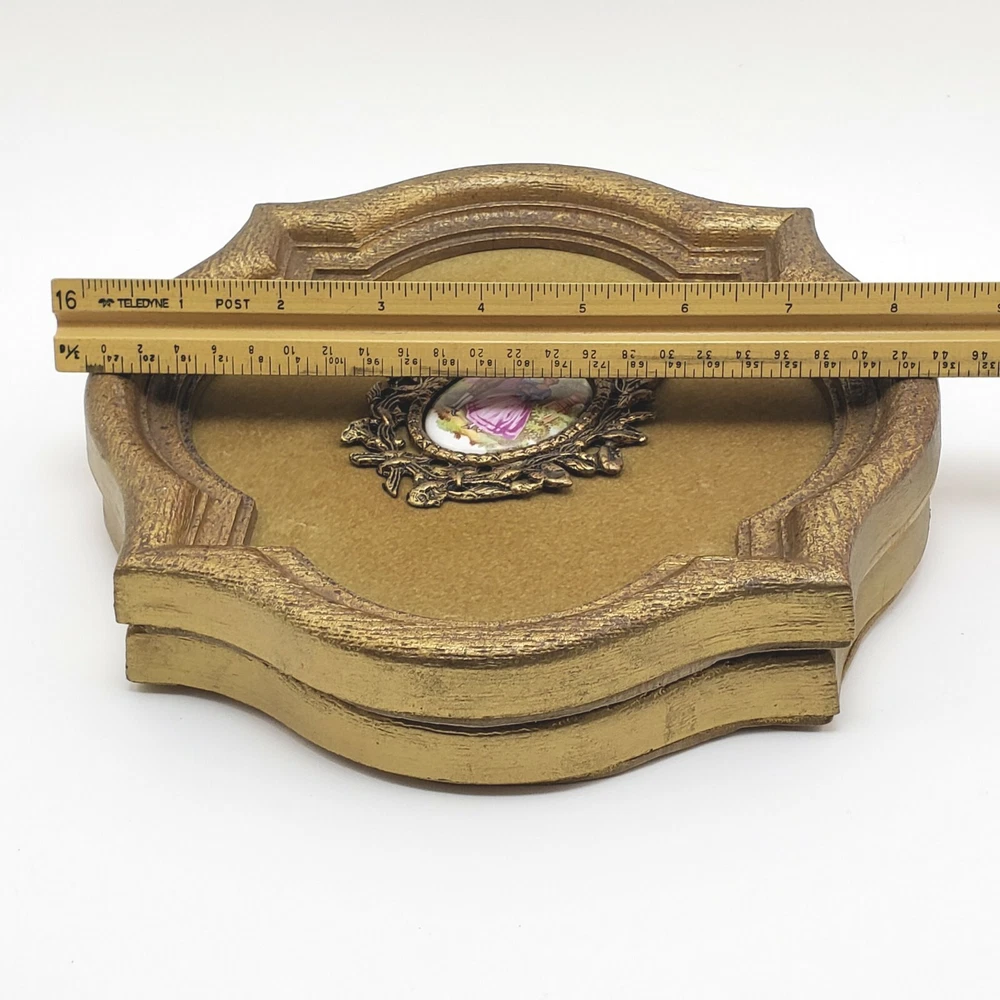 Vintage Porcelain Courting Couple Framed Medallion On Velvet. Lot of 2 both included Porcelain fragonard signed Courting Couple Medallions surrounded by ivy and floral setting. Backing is a light brown velvet and a gold tone plastic frame. Ready to be placed on a wall both are in very good condition with a couple of light scratches to the velvet. Porcelain Medallions measure 2" x 1 1/2" Overall measurements of frame is 9" x 9"