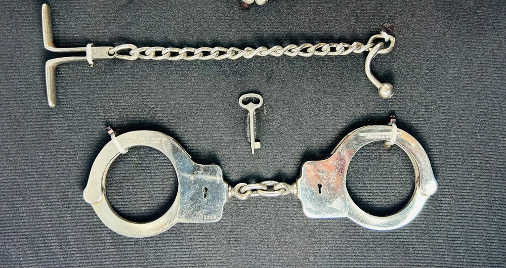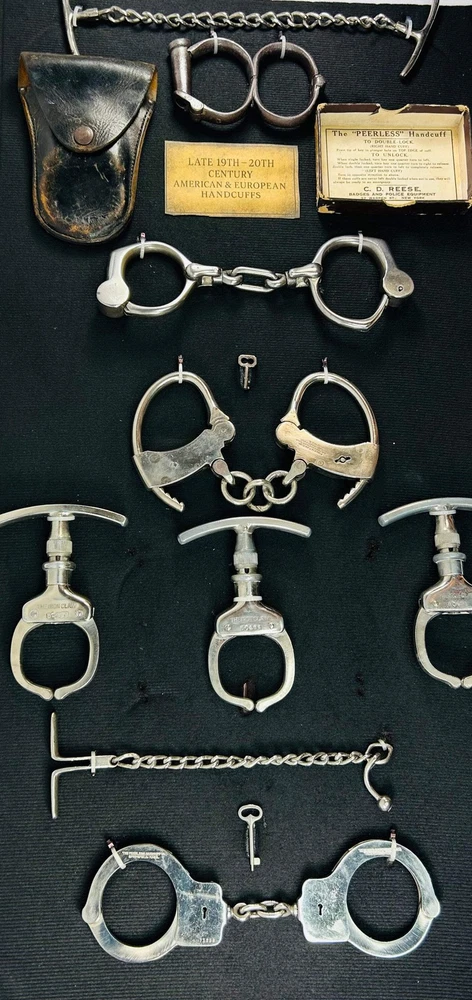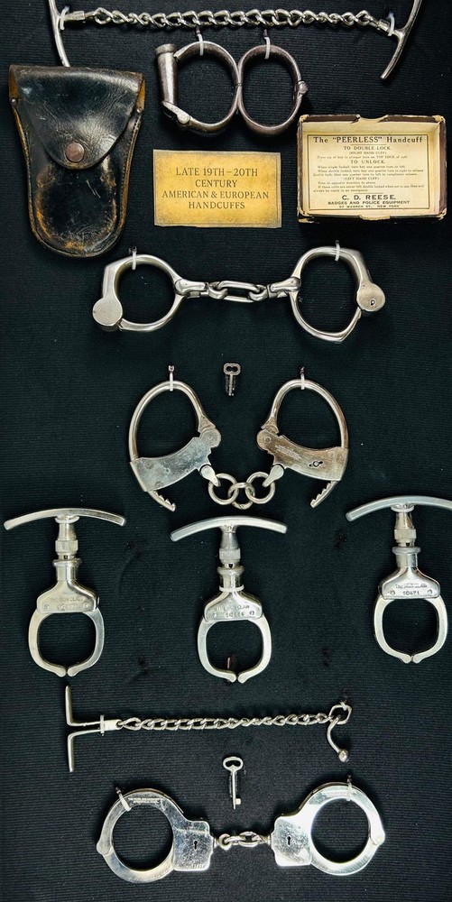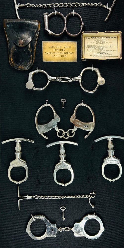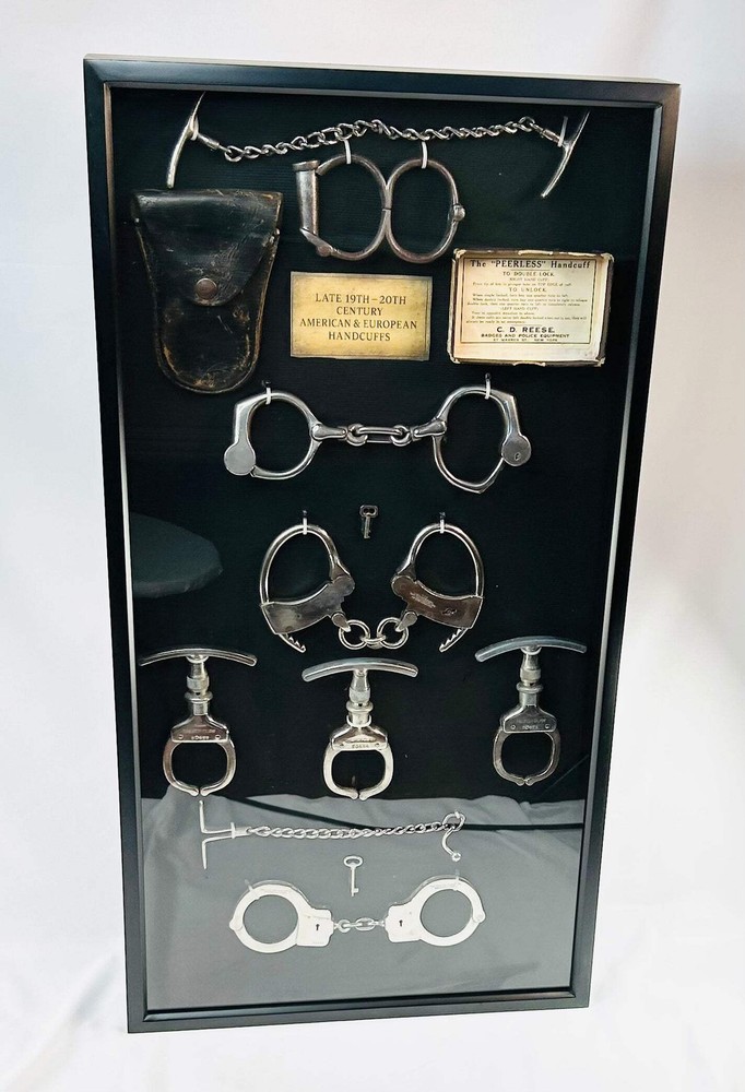 Framed Antique Handcuffs & Restraint Collection | 19th–20th Century Police Artifacts Historical Context & Origin Region: United States & EuropeMaterial: Steel, iron, leather, paper, synthetic plaquePeriod: Late 19th – Mid 20th Century DescriptionA rare, one-of-a-kind framed collection presenting a chronological survey of restraint devices spanning the late 1800s through the 1950s. Featuring both American and European innovations, it highlights the evolution of mechanical design, craftsmanship, and security technology. Professionally mounted in a black wood shadow box with glass front, each piece is secured against a deep black fabric backing to maximize visibility of form, mechanism, and historical detail. The display includes handcuffs, leg irons, mechanical nippers, chain restraints, keys, original leather pouches, and original packaging—several examples of which are extremely rare outside museum collections. Centered above the display is a synthetic plaque titled: "Late 19th–20th Century American & European Handcuffs." Collection Highlights (Top to Bottom) Chain-Handled Mechanical Nippers / T-Bar Nipper (USA, Late 19th Century) – Specialized control tool with T-bar handles connected by twisted steel chains; designed for simultaneous control of both wrists or arms. British Steel Figure 8 Handcuffs (England, Early 20th Century) – Rigid Figure 8 form limiting wrist movement; classic British design. Original Leather Pouch for Iron Claw / Mechanical Nipper – Vintage leather pouch with snap closure; includes handwritten officer’s name. Instruction Box for Peerless Handcuffs (USA, Early 20th Century) – Original cardboard box with printed instructions. Tower Bean’s Pattern Handcuffs with Key (USA, Early 20th Century) – Short-link chain and smooth oval cuffs; transitional American design. Mattatuck Manufacturing Co. Handcuffs (USA, Mid 20th Century) – Durable double-lock handcuffs with original key. Argus Iron Claw Mechanical Nippers – Hook Variant (USA, Late 19th Century, Set of 3) – Hooked ends with linked chains for wrist or arm restraint. Peerless Standard Handcuffs with Key (USA, Mid 20th Century) – Classic dual-sided locking mechanism; includes key. Features - Comprehensive historical display of restraint devices spanning 70+ years of American and European innovation. - Includes rare mechanical nippers (T-bar variant), iron claws, original leather storage pouch, original packaging, and multiple keys. - Mounted on a deep black fabric backing within a black wood shadow box for optimal visibility. - Each piece highlights intricate mechanisms, authentic wear, and patina. - Shadow box and glass front in excellent, museum-quality condition. Cultural SignificanceThis collection provides a tangible representation of the evolution of restraint technology, from late 19th-century iron claws to refined mid-20th-century locking handcuffs. It illustrates advances in security design, mechanical ingenuity, and the historical practices of law enforcement in both the United States and Europe. The display is significant both as a scholarly resource and as a museum-quality presentation of restraint device history. ConditionAll items display age-appropriate wear, patina, and minor surface rust. Each piece is securely affixed within the shadow box. Dimensions (approximate)Framed: Height: 32 inWidth: 17 in AgeCirca 1880s – 1950s Learn More Read from Our Blog: Locked in Time – A Collection of Historical Handcuffs Discover The Evolution of Handcuffs: A History of Handcuffs To View More Restraint Artifacts Visit The Lock Museum of America Framed Antique Handcuffs & Restraint Collection | 19th–20th Century Police Artifacts Historical Context & Origin Region: United States & Europe Material: Steel, iron, leather, paper, synthetic plaque Period: Late 19th – Mid 20th Century Description A rare, one-of-a-kind framed collection presenting a chronological survey of restraint devices spanning the late 1800s through the 1950s. Featuring both American and European innovations, it highlights the evolution of mechanical design, craftsmanship, and security technology. Professionally mounted in a black wood shadow box with glass front, each piece is secured against a deep black fabric backing to maximize visibility of form, mechanism, and historical detail. The display includes handcuffs, leg irons, mechanical nippers, chain restraints, keys, original leather pouches, and original packaging—several examples of which are extremely rare outside museum collections. Centered above the display is a synthetic plaque titled: "Late 19th–20th Century American & European Handcuffs." Collection Highlights (Top to Bottom) Chain-Handled Mechanical Nippers / T-Bar Nipper (USA, Late 19th Century) – Specialized control tool with T-bar handles connected by twisted steel chains; designed for simultaneous control of both wrists or arms. British Steel Figure 8 Handcuffs (England, Early 20th Century) – Rigid Figure 8 form limiting wrist movement; classic British design. Original Leather Pouch for Iron Claw / Mechanical Nipper – Vintage leather pouch with snap closure; includes handwritten officer’s name. Instruction Box for Peerless Handcuffs (USA, Early 20th Century) – Original cardboard box with printed instructions. Tower Bean’s Pattern Handcuffs with Key (USA, Early 20th Century) – Short-link chain and smooth oval cuffs; transitional American design. Mattatuck Manufacturing Co. Handcuffs (USA, Mid 20th Century) – Durable double-lock handcuffs with original key. Argus Iron Claw Mechanical Nippers – Hook Variant (USA, Late 19th Century, Set of 3) – Hooked ends with linked chains for wrist or arm restraint. Peerless Standard Handcuffs with Key (USA, Mid 20th Century) – Classic dual-sided locking mechanism; includes key. Features - Comprehensive historical display of restraint devices spanning 70+ years of American and European innovation. - Includes rare mechanical nippers (T-bar var
