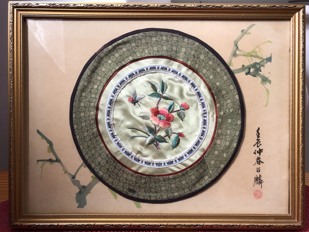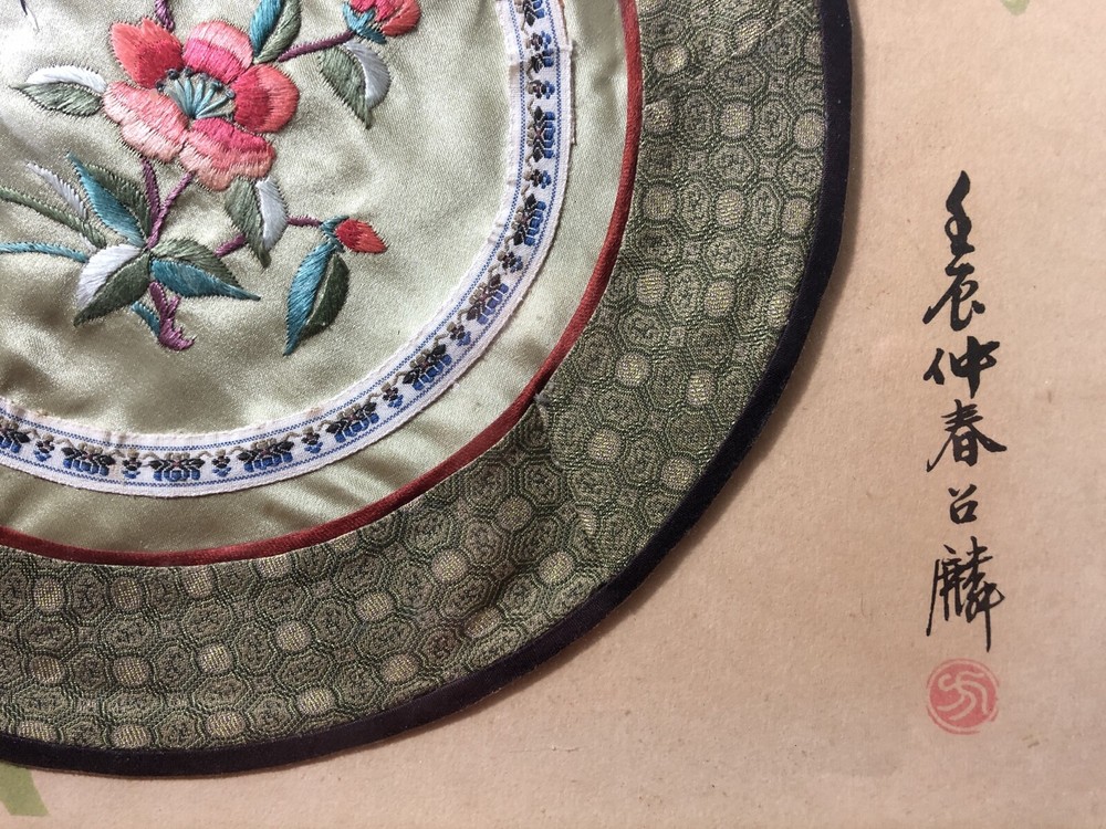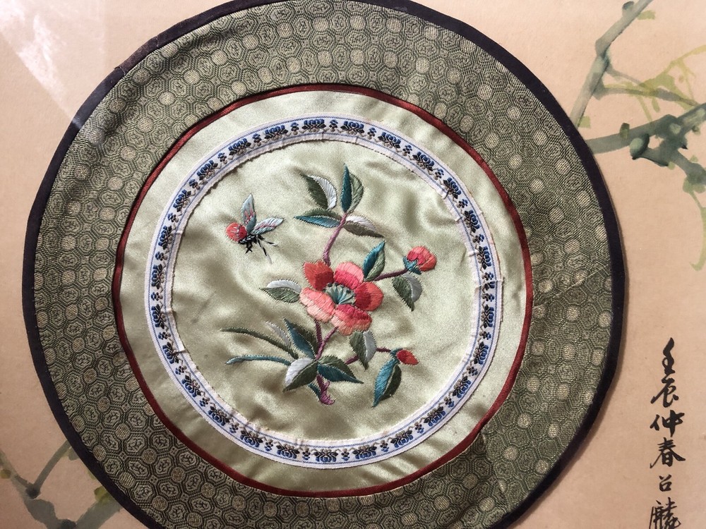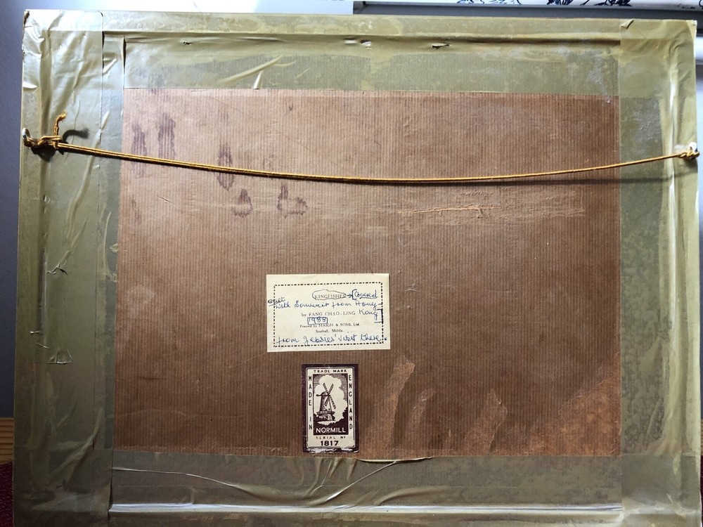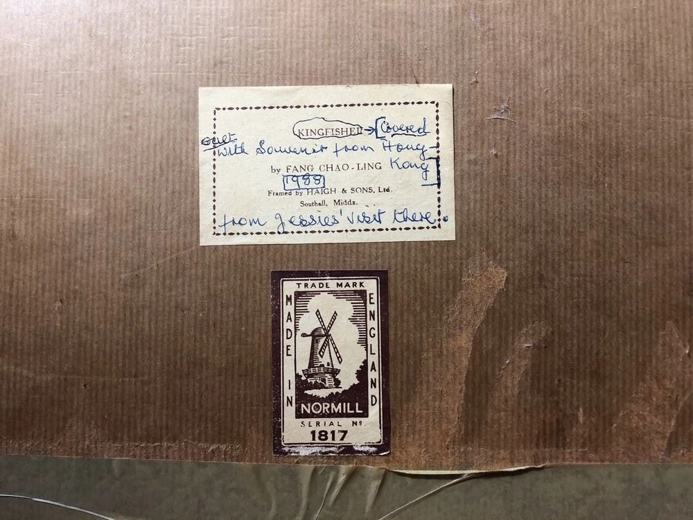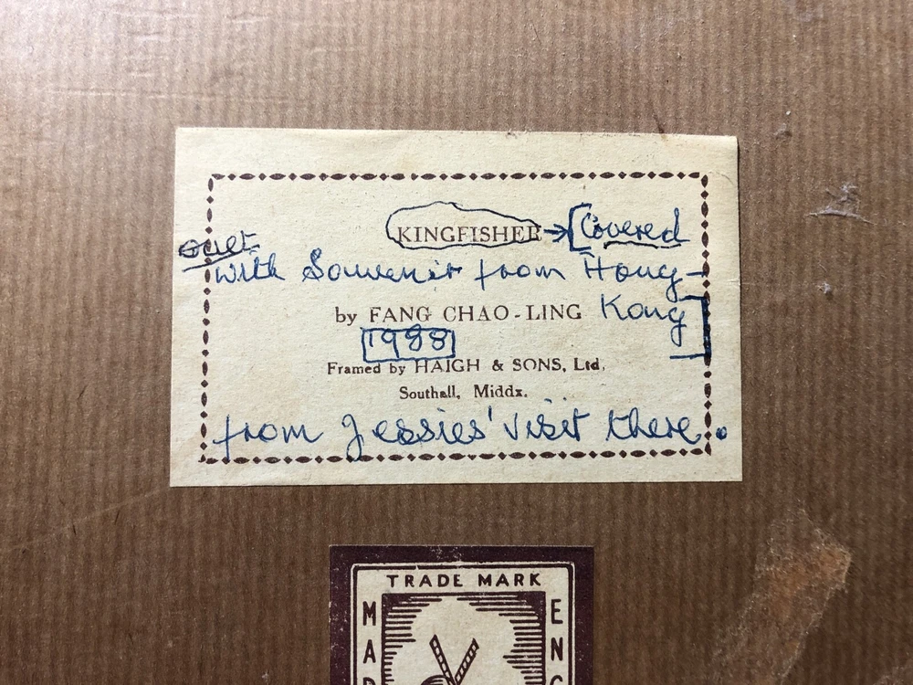 Framed picture & circular woven Souvenir from Hong Kong - Kingfisher by Fang Chao Ling covered over by Circular Woven Tapestry