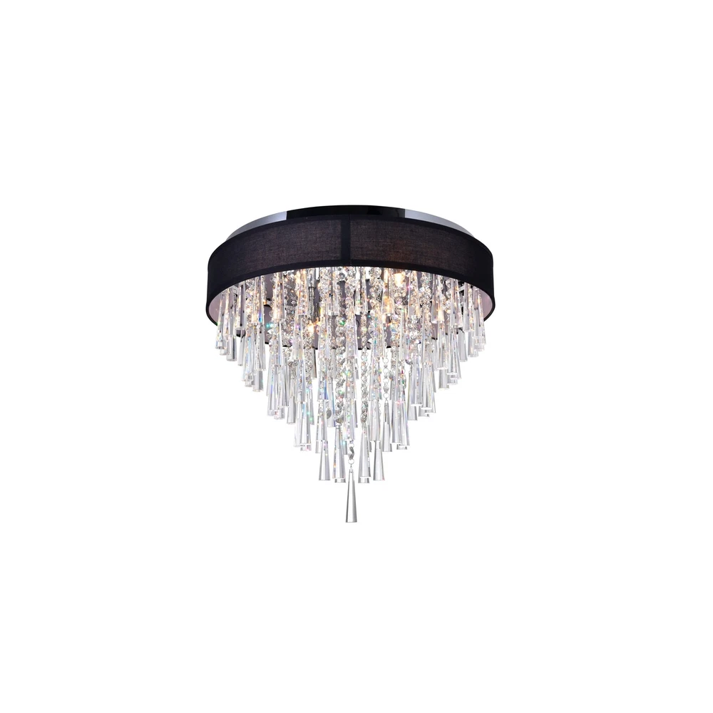 A light fixture and a décor statement in one. The Franca 8 Light Flush Mount displays its brilliance when turned on, and even when turned off. Hanging from a 22 inch circular shade, in black or off white, are tiered pieces of conical glass tubes and clear crystal strands. Light is emitted by eight bulbs and reflected beautifully by the crystal drops. Lighting is jewelry for the home, and there is the perfect piece for every room. This fixture is done in a beautiful chrome finish which could be the missing piece to lighten up and fall in love with your space all over again.Feel confident with your purchase and rest assured. This fixture comes with a one year warranty against manufacturers defects to give you peace of mind that your product will be in perfect condition.Dimensions: H 19" x W Free Shipping Over $49.99* Details Franca 8 Light Drum Shade Flush Mount With Chrome Finish Product Description: A light fixture and a décor statement in one. The Franca 8 Light Flush Mount displays its brilliance when turned on, and even when turned off. Hanging from a 22 inch circular shade, in black or off white, are tiered pieces of conical glass tubes and clear crystal strands. Light is emitted by eight bulbs and reflected beautifully by the crystal drops. Lighting is jewelry for the home, and there is the perfect piece for every room. This fixture is done in a beautiful chrome finish which could be the missing piece to lighten up and fall in love with your space all over again. Feel confident with your purchase and rest assured. This fixture comes with a one year warranty against manufacturers defects to give you peace of mind that your product will be in perfect condition. DimensionsH 19" x W 22" x L 22" Chrome Finish - G9 Bulb Not Included - Indoor (Dry Location) cETLus Approved Includes Assembly Instructions and Hardware Compatible With Standard Low Voltage Dimmer Comes With 6" of wire