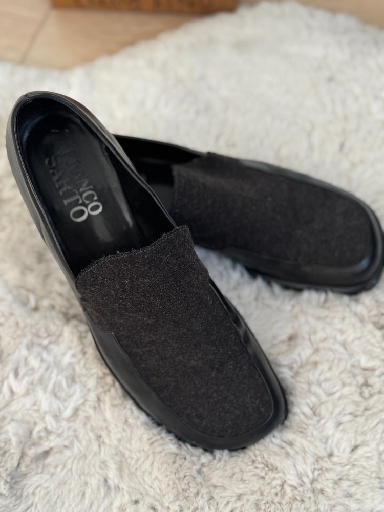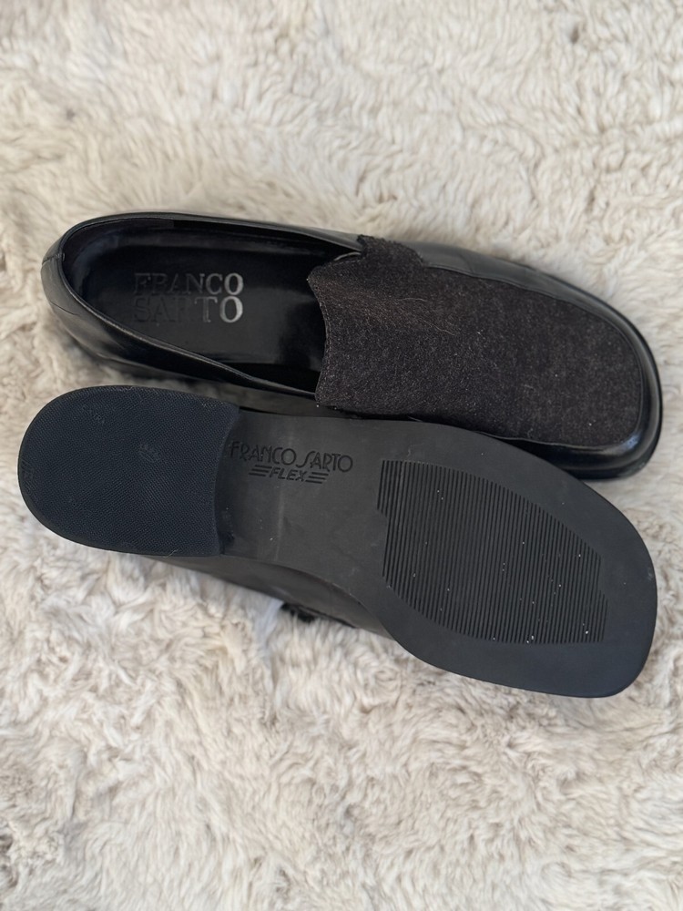 The product is a pair of Franco Sarto women's shoes in size 9. They are brown loafers made of leather with a felt fabric type on top. The shoes feature a calf lining and have a classic flat style. Perfect for adding a touch of sophistication to any outfit, these shoes are versatile and comfortable for everyday wear. The pair has brand new heels. Great shoe!