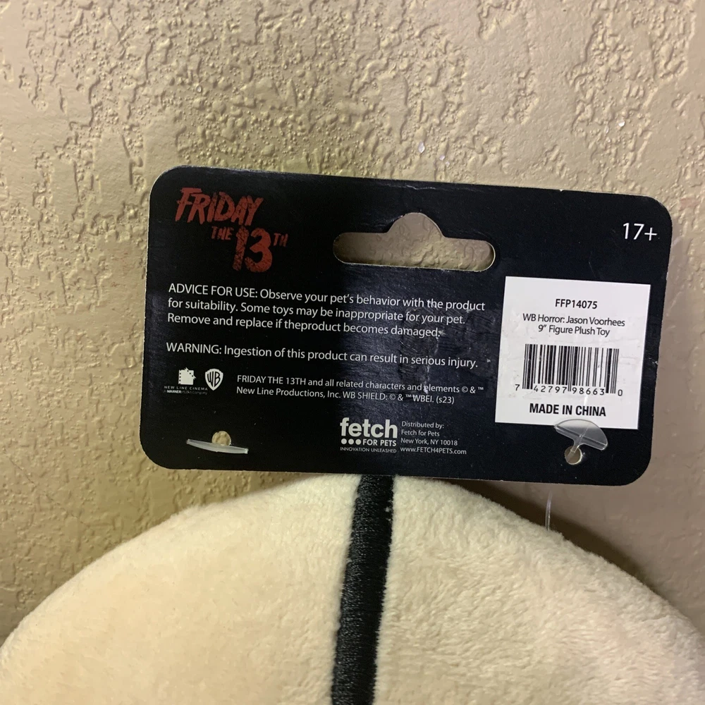 Freddy Krueger & Jason Vorhees 9" plush pet toys, new with tags, Fetch for Pets Not sure what the thinking is behind these, but to make these as pet toys and not as plush for humans is just insane to me. Jason is the only one that squeaks when you press his belly. Would have been better if Jason was carrying a machete, but they are adorable nonetheless. They are approximately 9" long, 6" wide, and 3.5" thick. Slight damage to the back of the Freddy doll's tag, but nothing major. Find it hilarious that they are labeled as 17+ as a pet toy. Please make sure your pet is age 17 or older before purchasing.