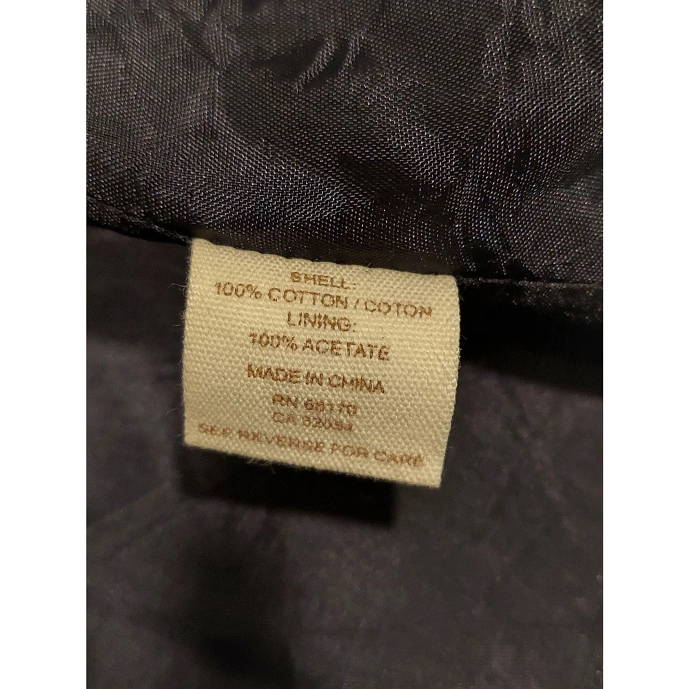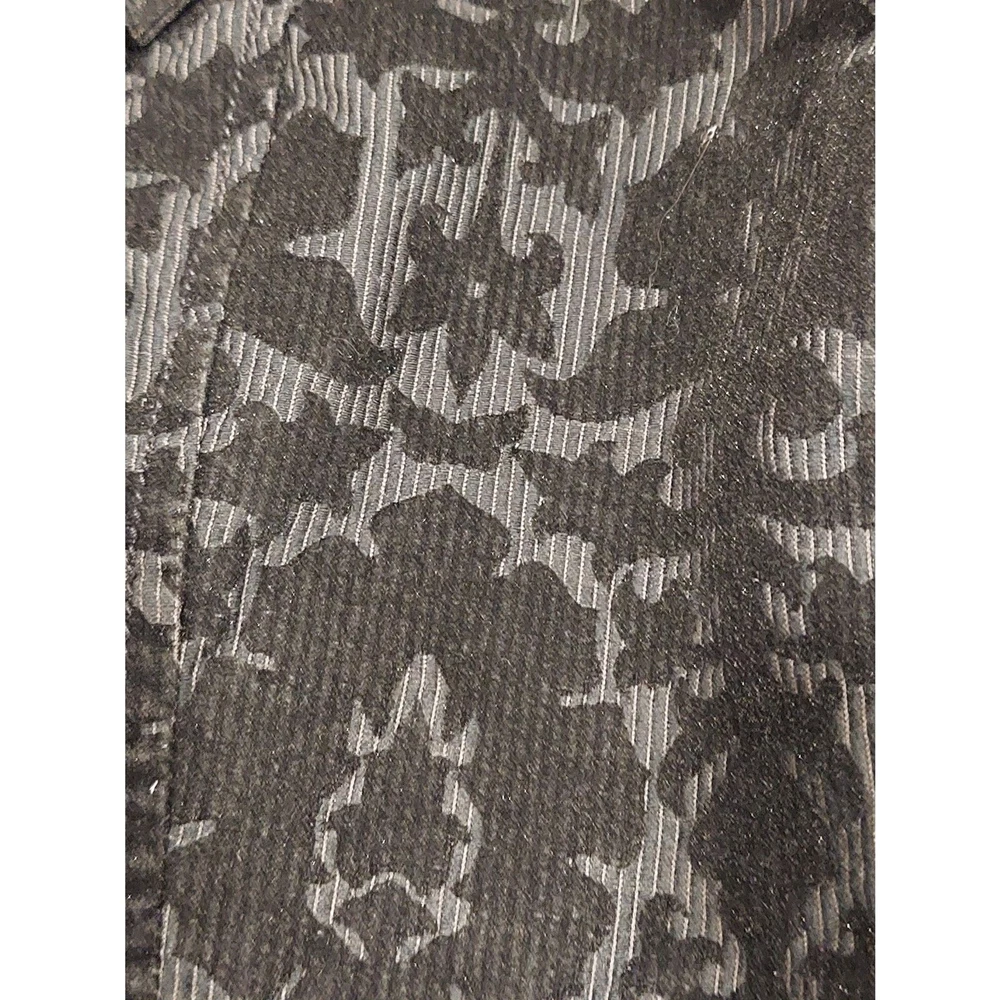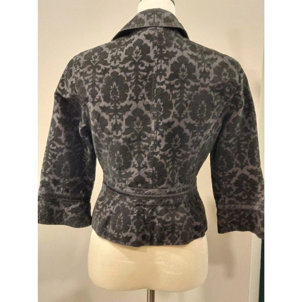 Black corduroy, brocade, cropped blazer Ruffled lapel Cinched at waist with a satin ribbon Three hook closures in front