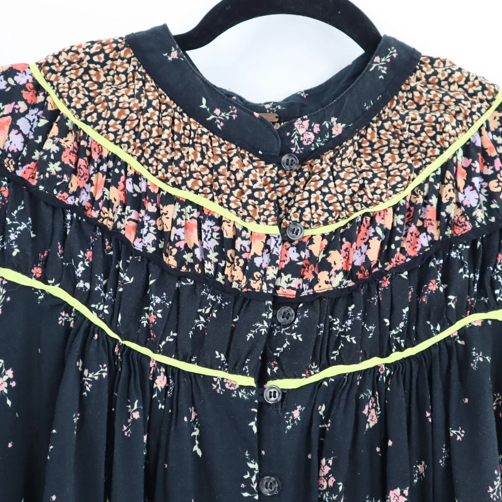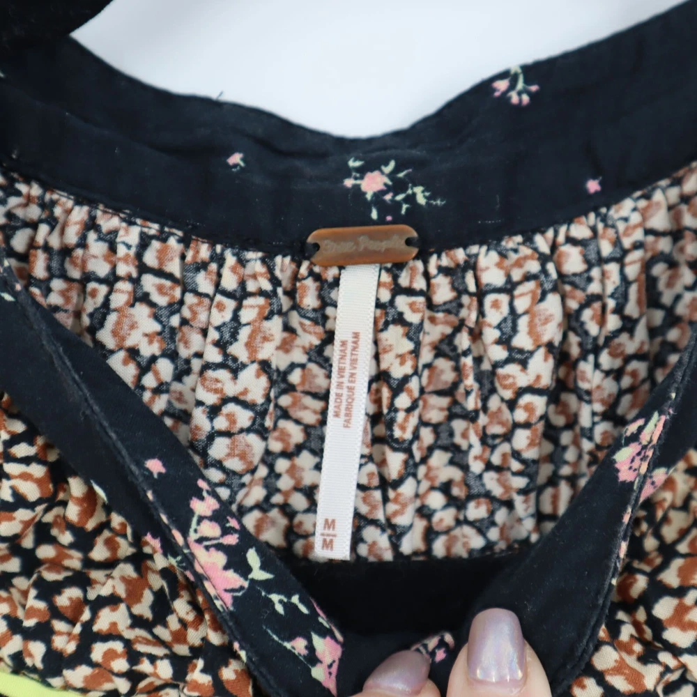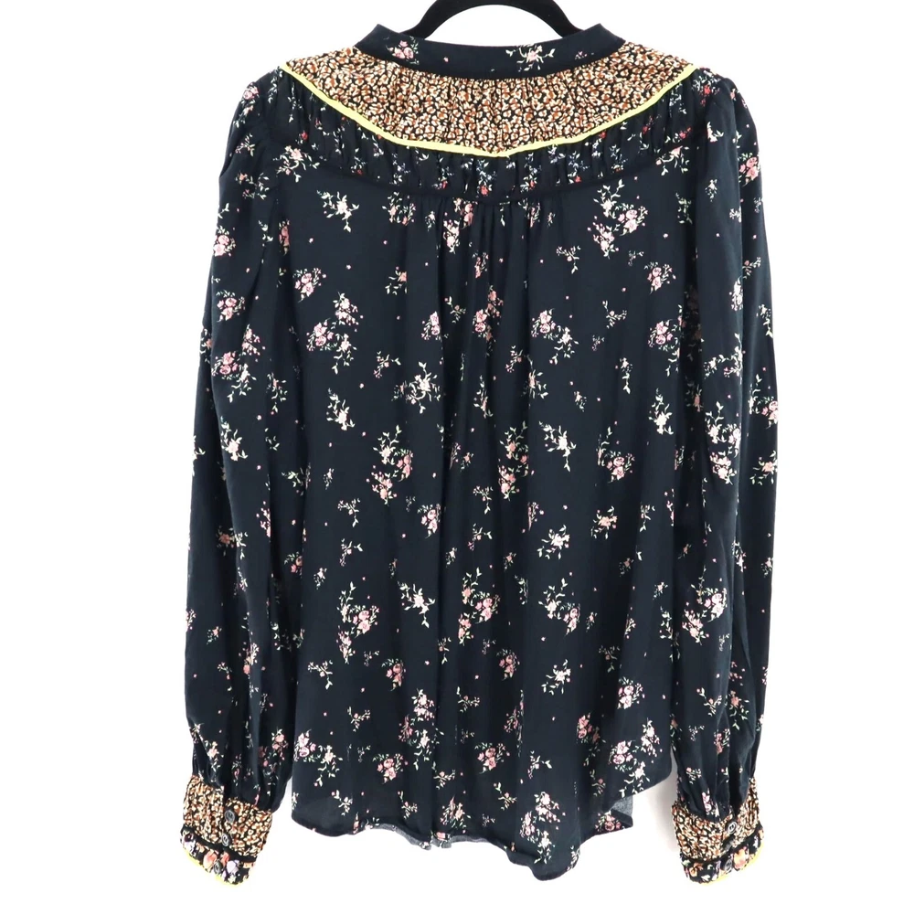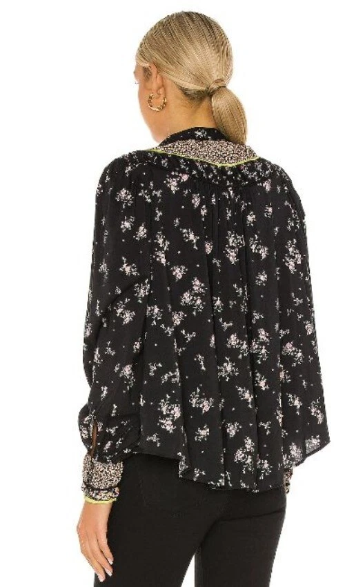 Free People Paloma Blouse Women's M Black Witchy Gypsy Prairie Bohemian Cottage If this blouse had a personality, it would be your quirky aunt who reads tarot cards and always smells like lavender. With its bohemian flair and contrast trims, it's like wearing a garden party on your torso—a party where the floral prints are the guests of honor. • Long sleeves with button cuffs • Contrast trim detailing • Floral print • Button-down front • Flowy silhouette Features: • witchy, gypsy, prairie, dark cottage, grannycore, bohemian, boho, flowy, hi low hem Size: Womens M Condition: Pre-Owned Good Has a small hole near a button, as seen in photo. Can be mended.