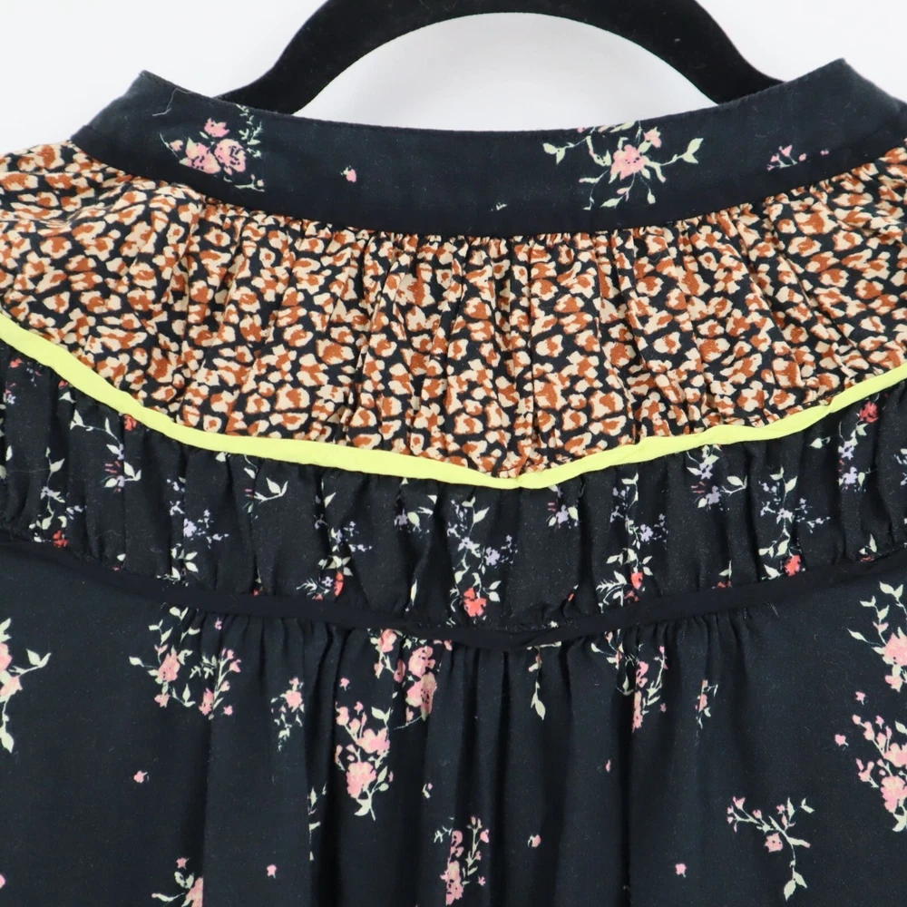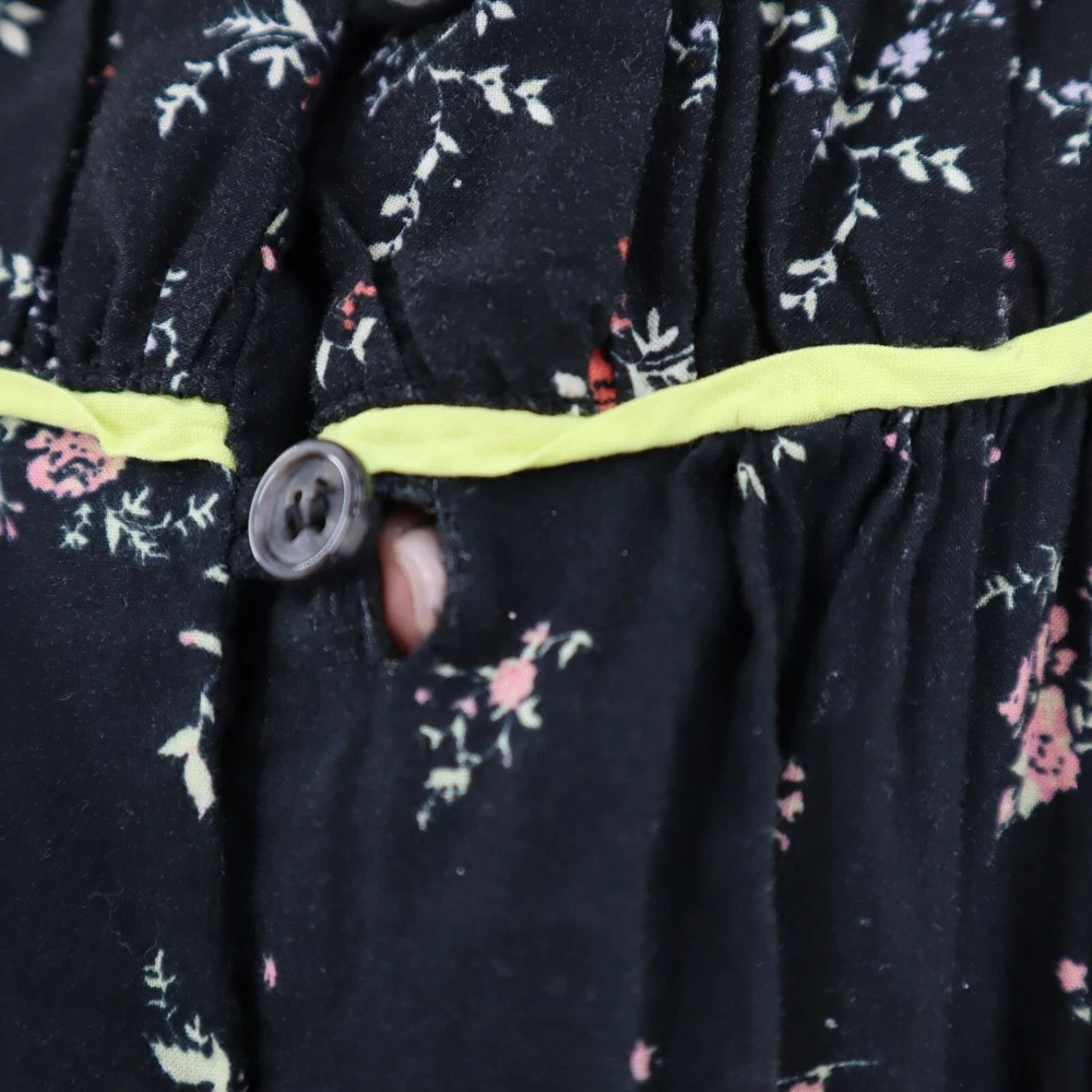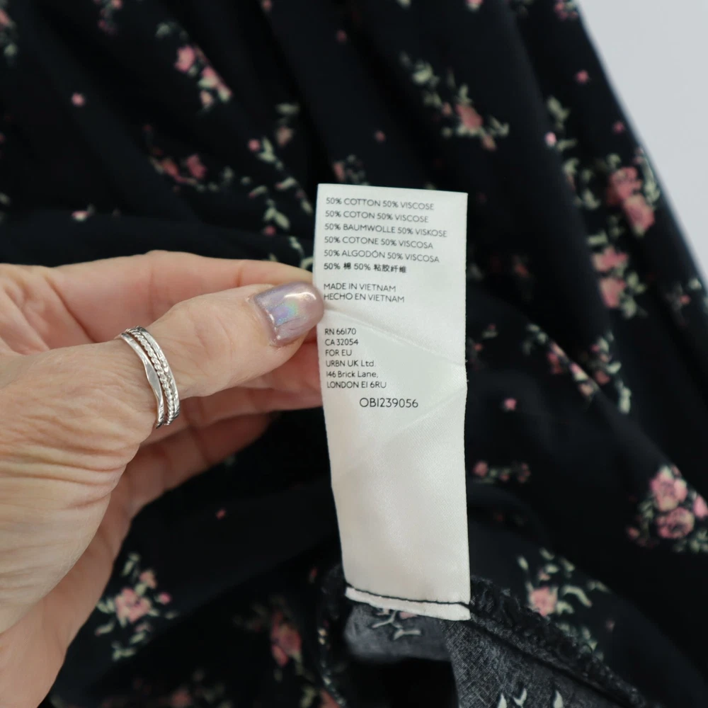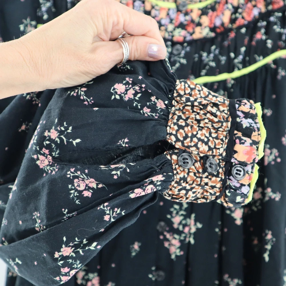 Free People Paloma Blouse Women's M Black Witchy Gypsy Prairie Bohemian Cottage If this blouse had a personality, it would be your quirky aunt who reads tarot cards and always smells like lavender. With its bohemian flair and contrast trims, it's like wearing a garden party on your torso—a party where the floral prints are the guests of honor. • Long sleeves with button cuffs • Contrast trim detailing • Floral print • Button-down front • Flowy silhouette Features: • witchy, gypsy, prairie, dark cottage, grannycore, bohemian, boho, flowy, hi low hem Size: Womens M Condition: Pre-Owned Good Has a small hole near a button, as seen in photo. Can be mended.