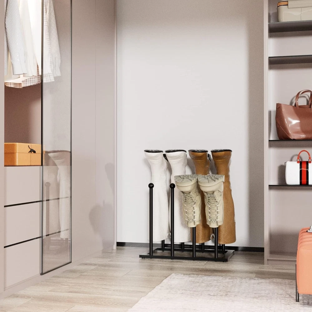 This shoe rack is a game-changer for boot lovers! The sturdy metal frame keeps tall boots upright and crease-free while the open design allows air circulation. No more toppling piles—it holds everything from knee-highs to work boots securely. The sleek black finish blends into any closet, and the wide base prevents tipping. My boots stay dust-free and perfectly shaped—worth every penny for the organization and protection it provides!