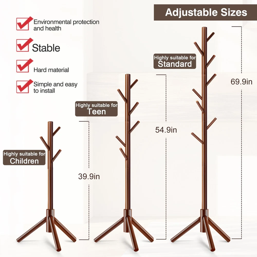 【PREMIUM WOODEN MATERIAL】- wooden coat rack is made of high-quality New Zealand pinewood screw-on pieces and 3 prong legs for optimal stability that supports multiple garments and outerwear. 【ADJUSTABLE HEIGHT for USAGE】- 4 sections design and you can customize the rack height and hooks as you like. 2-section heigth (39.5”) can be put at beside, 3 sections height (54.2”) is for for a kid use, 4-section height (68.8”) is for adult use. 【EASY TO ASSEMBLE】- No Tools Required. The coat rack is equipped with metal screw holes. You can assemble it with our assembly instruction manual in just a few minutes. 【ECONOMICAL and PRACTICAL】- It is so practical with cheap price. Its 8 sturdy hooks allow you to hang hats, scarves, backpacks, ties, and umbrellas or any other things you want. 【SPACE SAVING】- The free standing coat rack takes up little space in entryway, living rooms, bedroom, office and any other places. With it you can make your room much more neat and clean.
