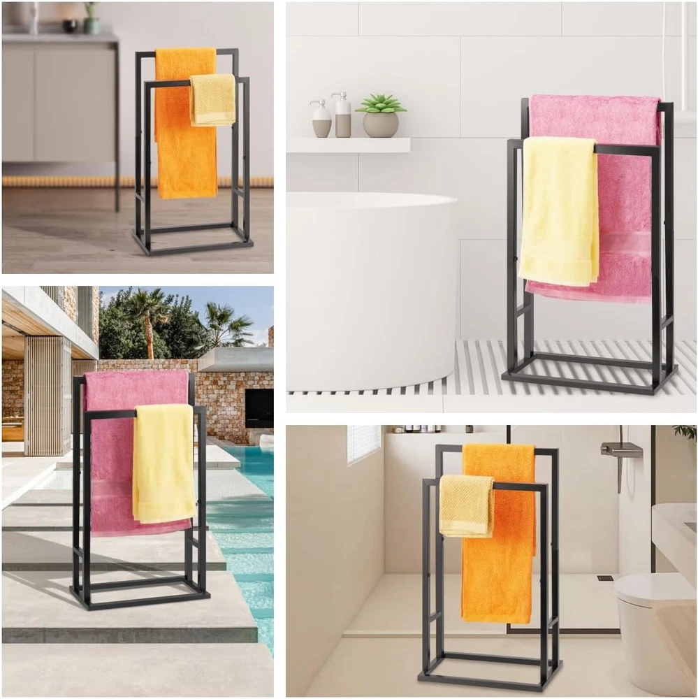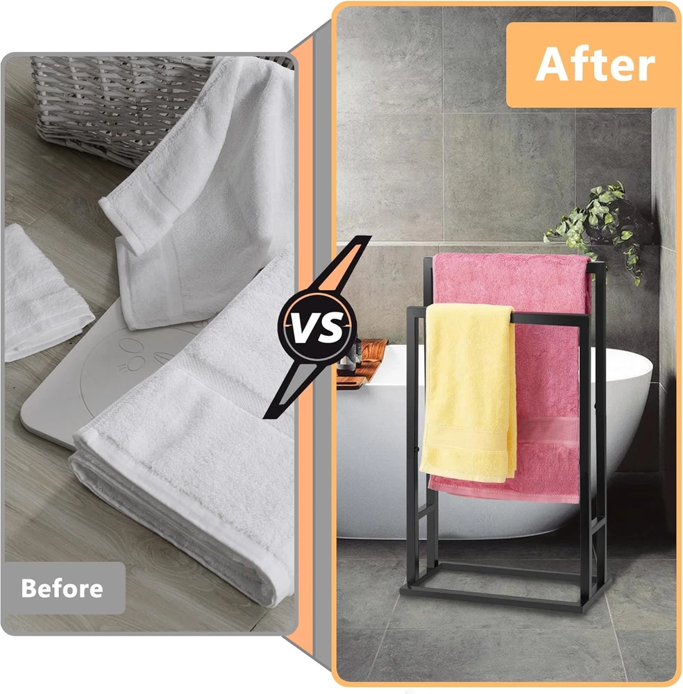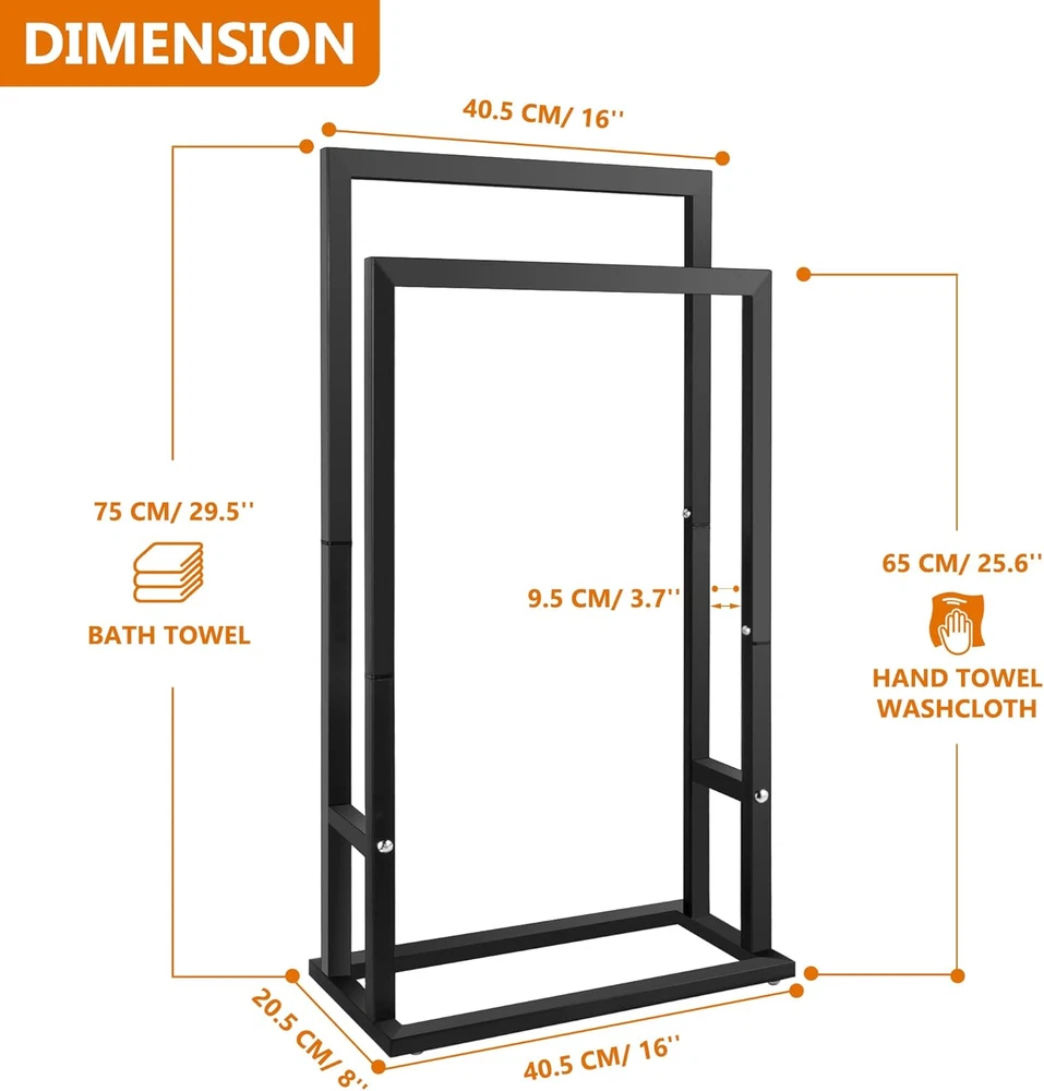 Store New Arrivals Add to Favorite View Feedback Contact Freestanding Towel/Blanket Rack,2 Tier Stainless Steel Towel Rack for Bathroom,Easy Install,Hand and Floor Free Standing Drying Stand Holder for Outdoor and Hot Tub, Blanket Holder, Description Product Dimensions 16"L x 8"W x 29.5"H Item Weight 2.04 Kilograms Installation Type Freestanding Shape Rectangular Finish Type Painted Product Description NOTED: There are 4 pcs '' D'' screws pre-assembled in the end of the black square pipe. Other 4 pcs '' D'' screws are included in the accessory kit. Please check when you received the towel rack package. Any question, please feel free to share with us. TOWEL RACKS for BATHROOM: Freestanding towel rack, 2 tiers in height from the taller in the back to the shorter in the front for different size towels. DURABLE STAINLESS STEEL: Made of quality stainless steel, this bathroom towel rack is rust-resistant, long service life, rectangle base with antislip pads keeps it stable on the floor. MULTIFUNCTIONAL TOWEL RACK STAND: Perfect for master and guest bathroom, poolside, beach, drying clothing in a laundry room or storing blankets in a bedroom. MODERN BLACK TOWEL HOLDER: The modern and stylish black color of the standing towel rack will accent your bathroom or home with decorative design. SPACE SAVING & NO DRIILING: There is no need to drill holes in apartment or house, and it offers convenience for you or your guests. This towel rack is also perfect for baby clothes, face towels, full bath sheets or beach towel. Say Goodbye to The Messy Bathroom Made with rust-resistant finished, that will sure the towel rack will has long service life ABOUT US Explore our handpicked range of top-quality items at fantastic prices. Our goal is to make your shopping experience as smooth and enjoyable as possible. Thanks for visiting! Warm regards, The FerroWarehouse Team SHIPPING We are always working hard to ensure your package arrives as soon as possible. Please understand that some factors like weather, high postal traffic, and the performance of shipping companies are outside of our control. We offer free shipping to the lower 48 states and Canada, with orders processed within 2 business days of payment—often sooner. Please provide a physical address; we do not ship to P.O. Boxes. For shipping outside the U.S. and Canada, delivery time, cost, and processing may vary. International customers are responsible for all duties and taxes. To estimate shipping costs, please proceed to checkout. Thank you for shopping with us! RETURNS We want you to be completely satisfied with your purchase. If you need to return an item We accept returns within 30 days of receipt. Items must be unused and in original packaging. Please contact us first if you have any problems/questions/concerns to initiate a return and get instructions.. We will be happy to resolve any issues you may have in a cordial and friendly manner. We appreciate your Postive Feedback, and will do the same in return. PAYMENT We accept PayPal. CONTACT US This page content is yet to come Please ad us to your favorite seller and visit again later Thank You CUSTOMER SATISFACTION We try our very best to make sure every customer is completely satisfied. If there's a problem, message us! We're happy to help.