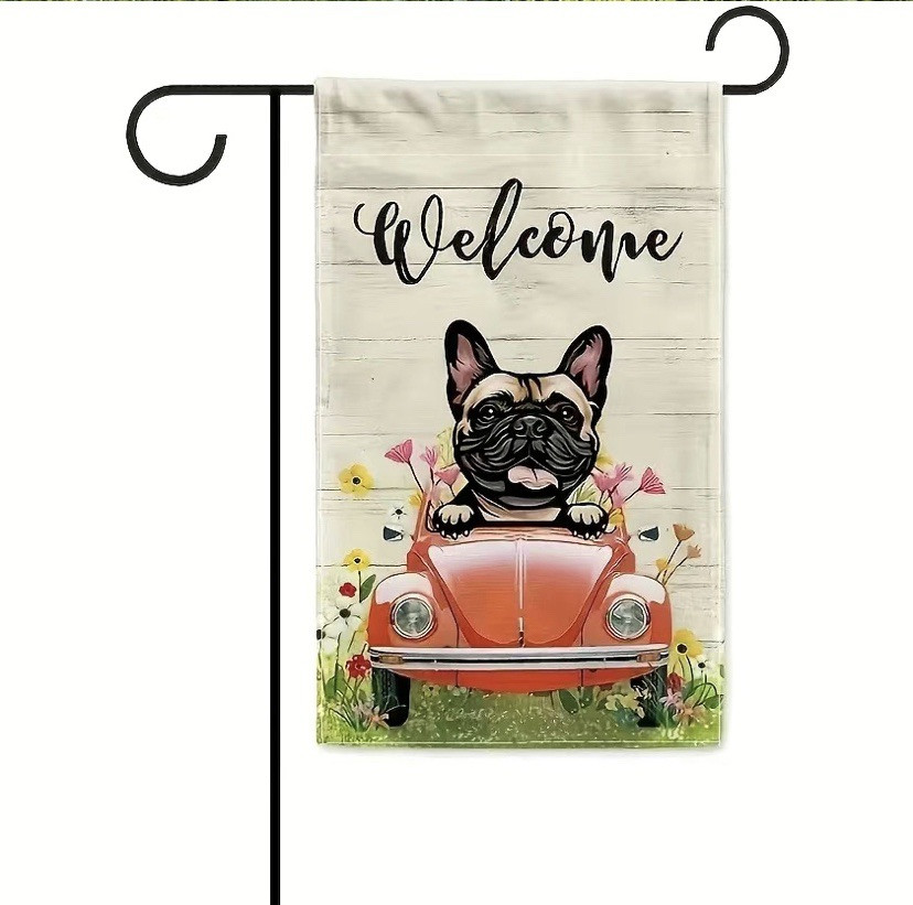 French Bulldog Welcome Garden Flag, 18x12 Inches, All-Weather Safe, Cute Design This French Bulldog Welcome Garden Flag is made of durable canvas material and is all weather safe. It features a cute French Bulldog in a bug car, with the words "Welcome" on the bottom. The flag is 18x12 inches in size and does NOT include a flagpole. It is perfect for adding a cute and colorful touch to your garden or yard. Cute French Bulldog Welcome Garden Flag, Durable Canvas Material. All Weather Safe. French Bulldog in a Bug Car, Welcome. 18x12 Inches, Flagpole is NOT Included. Perfect for your front porch, patio or yard to welcome your friends and family. Made of high quality polyester canvas, which is weather resistant and fade resistant. The vivid colors and detailed design will make your yard or garden more attractive. Double sided design! Weather proof, durable.