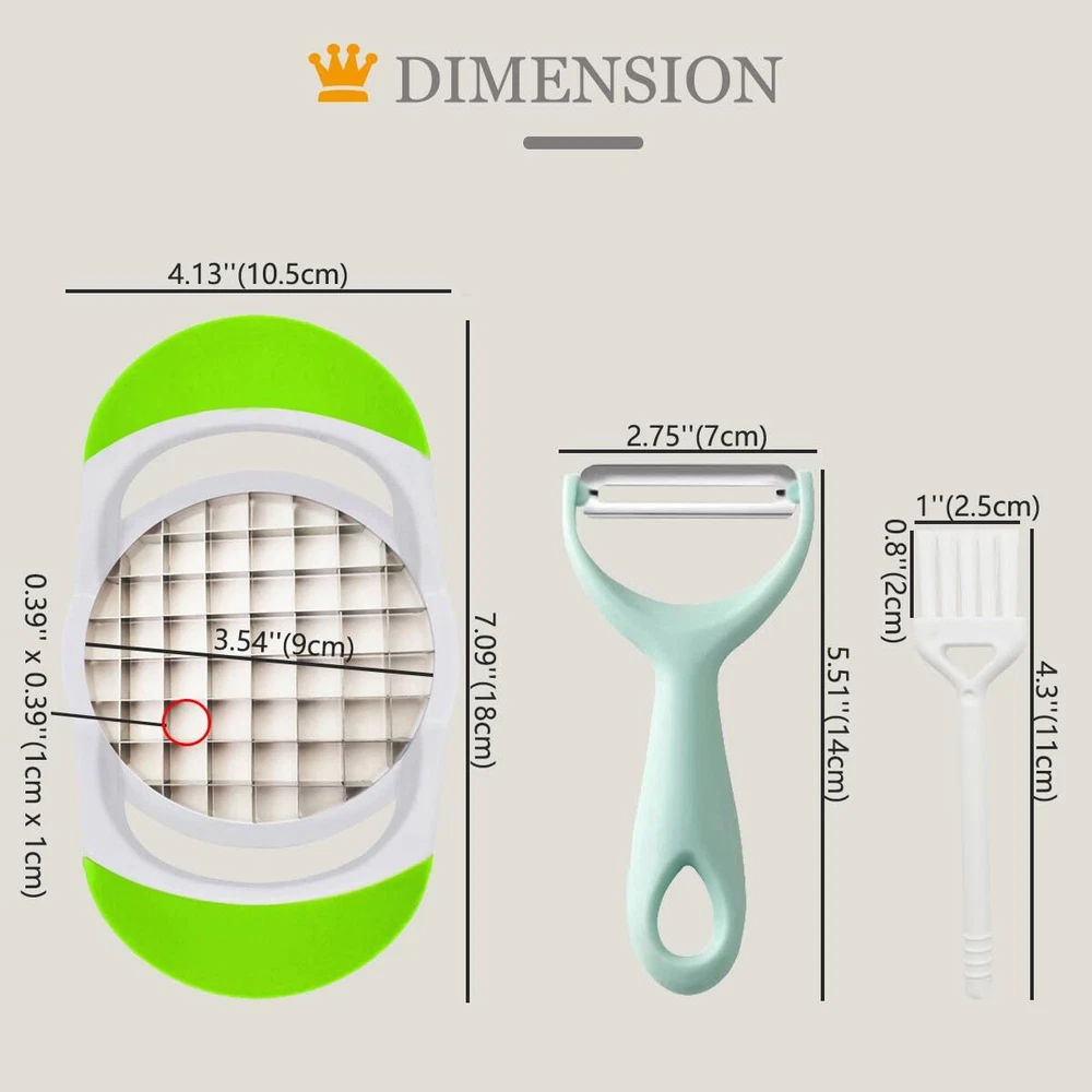 🎖️【Be Worth Having】This device is specially designed to make French fries and is perfect for everyday use in home life. In addition to the french fry cutter, it also comes with a potato peeler and a white cleaning brush, which is more cost-effective. Almost the same functions, for less money, get a three-piece set, what are you waiting for? Having them will bring more convenience and fun to your life. Small tool, big changes. As long as you use it, you will know its advantages 🎖️【Saves Space & Easy To Store】 The overall length of this potato Chopper is 7.09''(18cm), its overall width is 4.13''(10.5cm) and the circular inside diameter of the cutter section is approximately 3.54''(9cm); The length of the peeler is 5.51''(14cm) and its width is 2.75"(7cm); The total length of cleaning brush is 4.3"(11cm), the size of the bristle is approximately 1"(2.5cm) X 0.8''(2cm). Small size, can be stored in any spare place in your kitchen 🎖️【Beautiful Appearance & More Advantages】The lines of the fuselage are smooth and shiny; A good color match; The handle is wrapped with frosted textured TPR material, non-slip while giving you a comfortable grip; The white main part of the device is made of ABS material, which is strong and durable; The blade is made of high quality food grade thickened stainless steel material with double-sided cutting edge, which does not rust and is sharper, and has a longer service life. In short, let you look at it happy and use it comfortable 🎖️【Easy To Use & Cutting Efficient】 Are you getting tired of pulling out the cutting board and knife to try and cut perfectly shaped fries? With this device, you can perfectly prepare delicious French fries in just a few steps by following the instructions shown on the left. Simple operation. Save effort, save your time. It will be easy to prepare a delicious meal of French fries for family or friends. Warm tip: For better use, please slowly and firmly press down when cutting potatoes 🎖️【Multi-purpose & Easy To Clean】 This handheld French fries cutter is designed for Making fries, it can also be used to cut other fruits and vegetables such as cucumbers, onions, to meet your daily needs. Compared with other equipment with similar functions and complex structures, the more complex the structure, the more likely it is to cause food residues. This one has a simple structure, no other parts, a one-piece design, and almost no dead corners, so it is easier to clean (Clean with water and equipped brush, or in the dishwasher) 🎖️【Quality & After-sales Guarantee】 International standard production process, every French fry Maker has passed strict quality inspection and testing before being delivery. 24-hour online after-sales service, as long as you have any questions about the product, please feel free to contact us and give you a satisfactory solution(Refund or replacement). This is our promise to you. Your satisfaction is our concern
