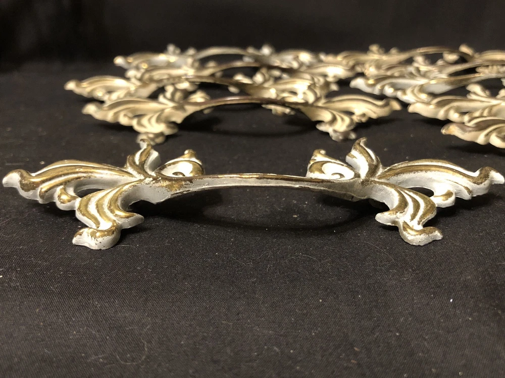 Add a touch of vintage French country style to your drawers and cabinets with these French Provincial handles. These handles are made of durable metal and have a beautiful brushed finish that comes in burnished finish with white paint. The center-to-center measurement of these handles is 3 inches and they are 6 inches in length. I have 10 individual handles. Buy as many as you need . The price is per handle. French Provincial style Marked with a “B” in a shield, SP1751A 6” L x 2” W No fasteners or screws provided. Please feel free to ask any questions before purchasing, thanks