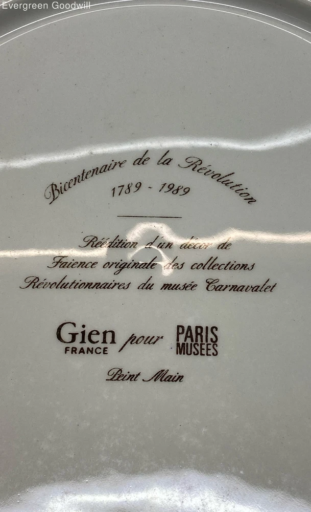 Collector Plate Gien France White/Yellow/Green Pottery French Revolution Bicenntial Plate Brand: Gien France Style: Collector Plate Type: French Revolution Bicenntial Plate Color: White/Yellow/Green Material: Pottery Condition: Good - shows some sign of wear Evergreen Goodwill helps people get jobs across Northwest Washington by offering high-quality free job training, education and job placement. We empower individuals to overcome barriers to working by providing comprehensive support and connecting them with life-changing job opportunities, ensuring they are career-ready and can support themselves and their families. ***Disclaimer*** All items were donated to Evergreen Goodwill of Northwest Washington with no history or provenance. The auction is for all items pictured. Items may need servicing and/or benefit from a cleaning upon arrival. Please see photos for additional details and feel free to ask questions. PAYMENTS Please note that your entire order will be canceled by eBay if the oldest item exceeds 7 days without payment. Once an order is canceled, we are unable to re-invoice and the item will be relisted. For a combined shipping invoice, please send us one request within 5 days of winning the first item to avoid cancelation of your entire order. Once a combined invoice has been sent, we are unable to add additional items to the invoice. SHIPPING Local pickup only available to items listed as Local Pickup at this time. Interntaional shipping is not available at this time. We offer combined shipping as long as items will ship safely together. Auctions must end within 5 days of each other to be eligible for combined shipping. Please hold off on payment until all auctions have ended then proceed to checkout. Please do not pay for any items individually if you wish to have them combined - they must be paid at the same time. Items listed for flat-rate shipping are not eligible for combined shipping. PO Box addresses will require USPS shipments as FedEx Ground will not deliver. If FedEx is selected we may need to invoice for additional shipping costs.