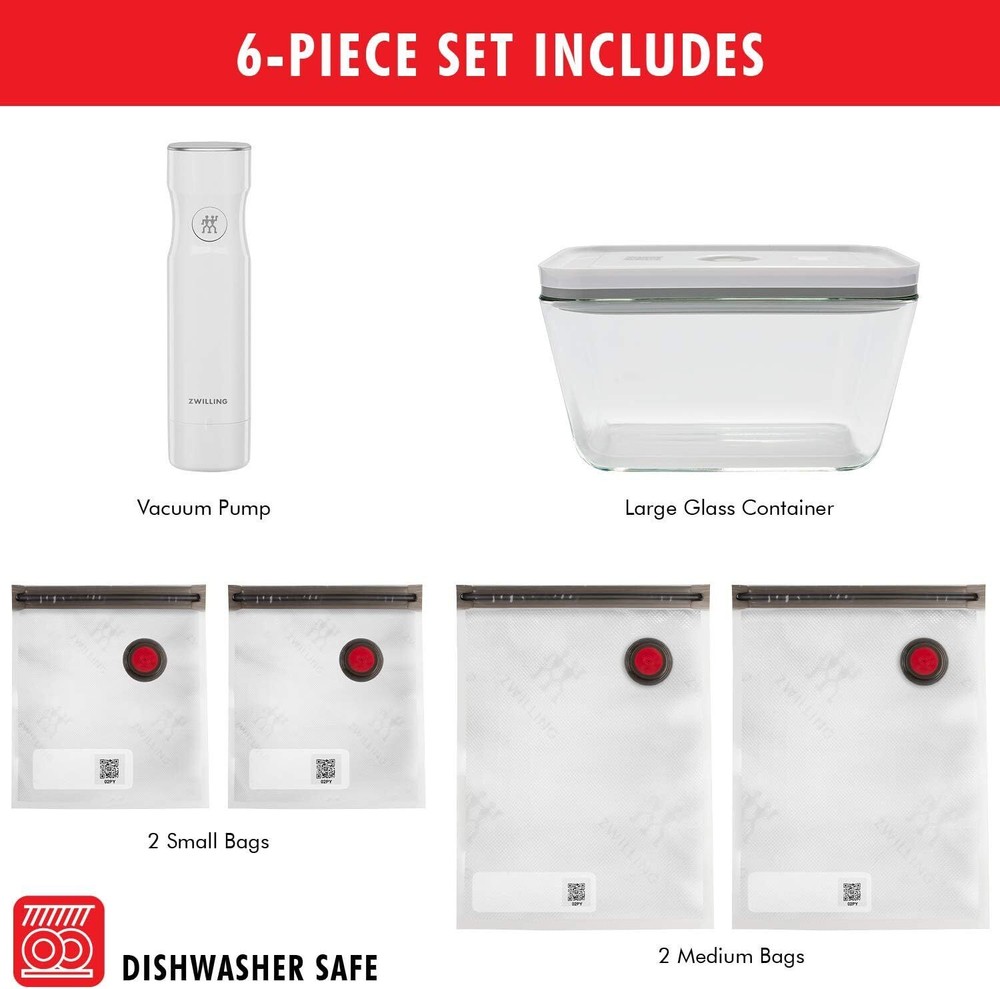 Material Glass, Plastic Number of Items 1 Special Feature Manual Color Glass Item Weight 2.5 Pounds Model Name Fresh & Save Number of Pieces 6 Size 6-pc About this item SET INCLUDES: 1 large vacuum food storage container, 2 small and 2 medium vacuum sealer bags for food, 1 rechargeable vacuum sealer machine SAVE TIME AND MONEY: Keeps food fresh up to five times longer than non-vacuum storage methods EASY MEAL PREP: The easy-zip closure makes meal prep simple so you can save time and make healthy choices. TAKE YOUR FAVORITE SNACKS EVERYWHERE: These reusable snack bags are perfect for every occasion. Pack them with your favorite snack for school, work, or even at the pool. CONVENIENT: Reusable, resealable food storage bags feature easy-zip closures to create a perfect seal and are freezer safe, and microwave safe (without vacuum seal). PROTECTIVE BAGS: Reusable food storage bags feature easy-zip closures to create a perfect seal and are freezer safe, microwave safe (without vacuum seal), and dishwasher safe. REDUCE FOOD WASTE: ZWILLING Culinary World app tracks food storage and when it will spoil