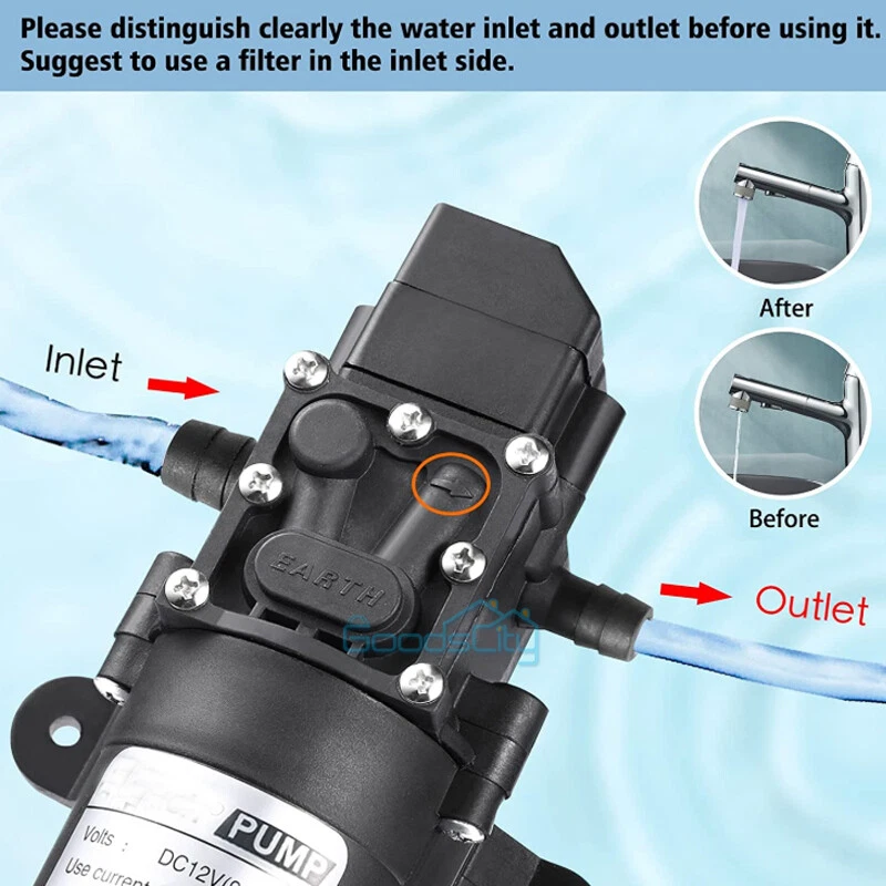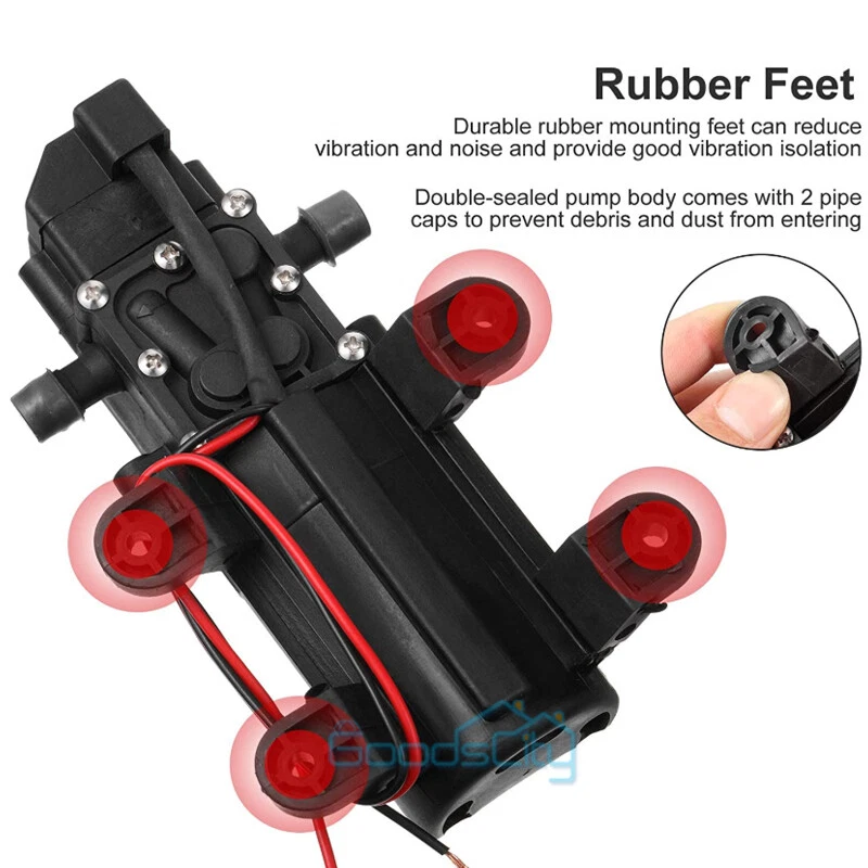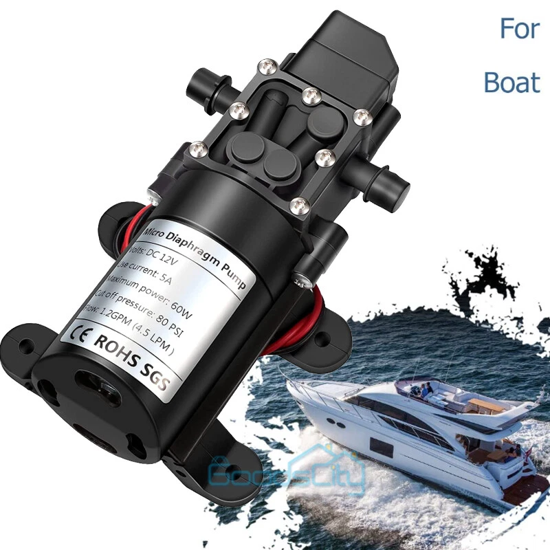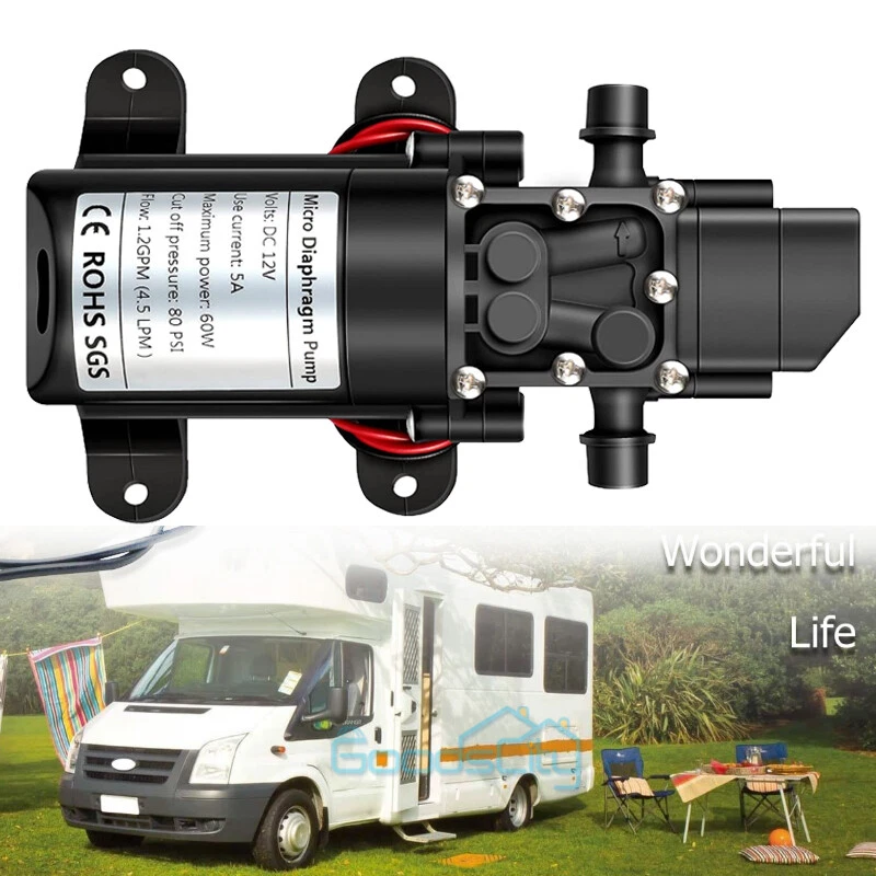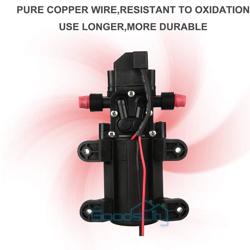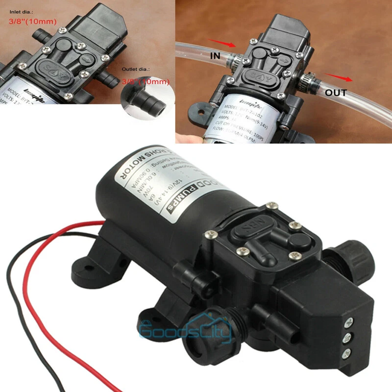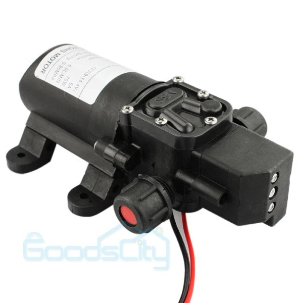 Fresh Water Pump 12V DC 70W 130 PSI Self Priming Pump for Boat/Marine/RV/Yacht Ship within 24 hours. 100% New & Excellent Quality Strictly QC, Each item was fully checked before shipping FREE & FAST Shipping delivery with Tracking Number This 12 volt DC diaphragm self-priming sprayer is a multi-purpose water pump, can be used for Garden and sprinklers, showers, water taps in the boat, caravan, travel trailers, RV or home motor. It is great for a Caravan, Camper, RV, Boat, Marine, Home Garden and Camping. Description: Easy to install. Runs dry without system. Easy connecting system. Totally sealed, high stable pressure. Self priming, silent running, low power consumption. Motor duty cycle will vary with load and ambient temperature. Applications: Car washing machine, the solar energy water, remote control water equipment, some place need to control the switch frequently, somewhere energy saving, etc. Note: This item has built-in test water pressure switch. Water pressure is generally adjusted by the size of the nozzle flow. The adjustable range is 0 to 0.9 mpa. In front of the pump head, there are two lines, which can connect a micro switch to control the water pressure. You need to install this switch by yourself according to your requirements. Connected water inlet pipe length: on the ground 3.5 meters, height 2 meters. This has much to do with your operation. Specification: Volts: DC12V Power (max): 70W Input water pressure: 0.2Mpa Max Output water pressure: 0.9Mpa Pressure setting: 130PSI(Max)(can be adjusted from 75PSI to 130PSI if needed) Largest Flow: 6L/min Protection Valve Type: intelligent valve (with Pressure switch) The absorption process: 2.5 meters Head: 90 meters (water diversion length of pipe) Range: 9 meters Dimension: 16.5cm(L) x 9.6cm(W) x 6cm(H) Package including: 1 x Diaphragm Water Self Priming Pump Return Delivery details Payment FAQ's Contact us Return If you found that the item was damaged when you get it, pls contact us firstly Delivery details We Ship to Payment address ONLY. Payment PayPal accepted. FAQ's None Contact us Welcome to contact us for any question.