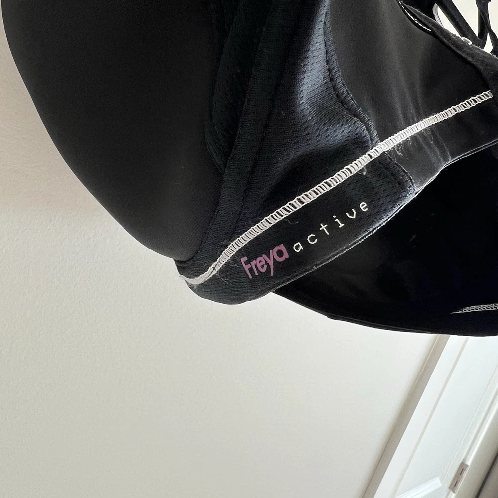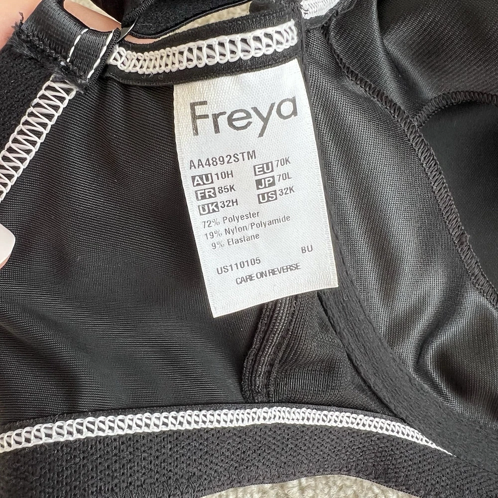 Freya moulded sonic adjustable convertible sports bra black white size 32K Workout in confidence with Freya Active's Sonic Moulded Sports Bra in a versatile Storm colourway. Showcasing moulded cups in a breathable spacer fabric, the specially designed sports bra features mesh panels, built up padded straps and a firm bottom band for good anchorage, comfort and support. While an additional J-hook enables racerback styling Features & Benefits Designed for low intensity sports Breathable spacer moulded cups Wide curvature wires for a supportive fit Mesh panels for cool comfort Firm banding for anchorage Adjustable straps with J-hook fastening for a racer back option Soft hook and eye Firm-rated support