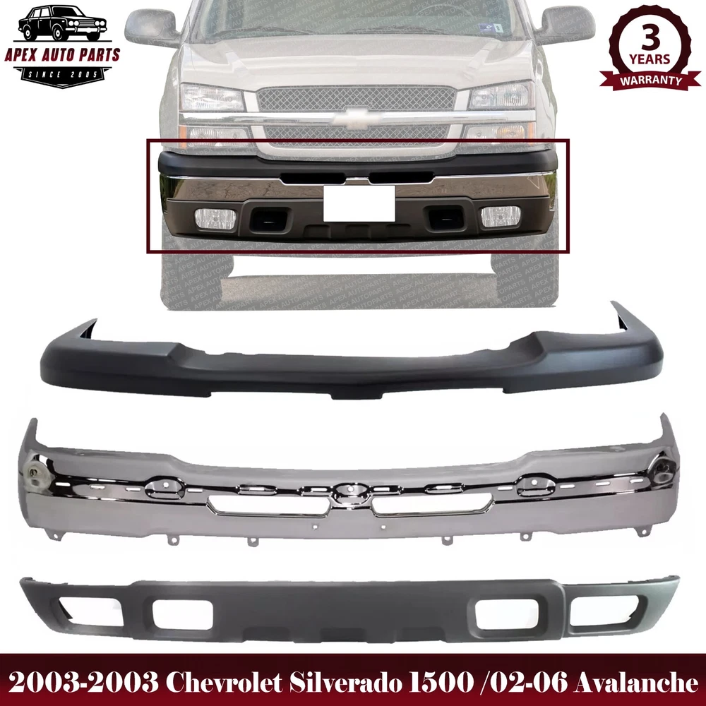 eBay Welcome to APEX AUTO PARTS Store Home About Us Feedback Add To Favorites New Arrivals Ending Soon Contact Us Front Chrome Steel Bumper + Upper Cover and Lower Valance with Fog Light and Tow Hook Holes Textured For 2003-2006 Chevrolet Silverado 1500 and 2002-2006 Avalanche Product Description WARNING : This product can expose you to chemical which is known to the State of California to cause cancer and birth defects or other reproductive harm. For more information go to www.P65Warnings.ca.gov. Specifics and Features : Quantity Sold : Set of 3 Product Fit : Direct Fit Recommended Use : OE Replacement Replaces OE Number : 10397999 19150310 15139805 Replaces Parts link Number : GM1051110 GM1002416 GM1092204 Includes : 1 x Front Bumper Cover Upper Textured Plastic 1 x Front Bumper Face Bar Chrome Steel Without Brackets 1 x Front Lower Valance Air Deflector Textured Gray with Fog Light and Tow Hook Holes Notes : Compatible with : 2003 Chevrolet Avalanche 1500 2003 Chevrolet Avalanche 2500 2003 Chevrolet Silverado 1500 2003 Chevrolet Silverado 2500 2004 Chevrolet Avalanche 1500 2004 Chevrolet Avalanche 2500 2004 Chevrolet Silverado 1500 2005 Chevrolet Avalanche 1500 2005 Chevrolet Avalanche 2500 2005 Chevrolet Silverado 1500 2006 Chevrolet Avalanche 1500 2006 Chevrolet Avalanche 2500 2006 Chevrolet Silverado 1500 2007 Chevrolet Silverado 1500 Classic Shipping Payment Returns Terms & Conditions Feedback Contact Us DOMESTIC LOWER 48 US STATES: FREE SALES TAX: CA ONLY VERY IMPORTANT: Double check shipping address. We are not responsible for incorrect or undeliverable addresses. Please use Shipping & Payments tab on top of page for shipping details for your location. Shipping to PR, HI, AK and PO Box addresses will be charged the same as shipping to Canada. GU, VI, SAIPAN will be charged the same as international shipping rate. For Canada shipping please select the lowest price. We do not offer expedited shipping. US Territories such as GU, VI, SAIPAN will be charged the same as CANADA shipping rate. Transaction will be held until a full shipping amount received. Some of the packages cannot be delivered to a PO Box. Customer is responsible to ensure PO Box address given is deliverable by the shipping company. Package will be held until a valid physical address is provided. Customer assumes shipping charges incurred in shipping to undeliverable address. International buyers are responsible for all customs duties, taxes, and other applicable fees incurred by the country's customs/border regulations. Please contact customs for more information. We ship 98% of all orders the same or next business day after payment received/cleared. Please understand that once orders are shipped, we cannot control the transit times thereafter. Most orders will ship via USPS First Class/Priority Mail or FedEx/UPS or the best suitable carrier for the specific size of the product. We are not responsible for any changes to address after item has been shipped. Item will be shipped out within 24-48 hours after payment cleared, except for weekends and holidays. PayPal e-check takes 3-7 business days to be processed. We will not ship until an e-check has been cleared. We do not accept returns. However, if there is an issue with your package, please contact us within 5 days of delivery. If we are not contacted within this period, we will be unable to process any claims. For emissions related items, please check with your local jurisdiction for emission specific requirements before purchasing. All items do not come with installation instruction unless otherwise specified. If item is questionable, please consult your local professional/mechanic before making purchase. Shipping DOMESTIC LOWER 48 US STATES: FREE SALES TAX: CA ONLY VERY IMPORTANT: Double check shipping address. We are not responsible for incorrect or undeliverable addresses. Please use Shipping & Payments tab on top of page for shipping details for your location. Shipping to PR, HI, AK and PO Box addresses will be charged the same as shipping to Canada. GU, VI, SAIPAN will be charged the same as international shipping rate. For Canada shipping please select the lowest price. We do not offer expedited shipping. US Territories such as GU, VI, SAIPAN will be charged the same as CANADA shipping rate. Transaction will be held until a full shipping amount received. Some of the packages cannot be delivered to a PO Box. Customer is responsible to ensure PO Box address given is deliverable by the shipping company. Package will be held until a valid physical address is provided. Customer assumes shipping charges incurred in shipping to undeliverable address. International buyers are responsible for all customs duties, taxes, and other applicable fees incurred by the country's customs/border regulations. Please contact customs for more information. We ship 98% of all orders the same or next business day after payment received/cleared. Please understand that once orders are shipped, we cannot control the transit times thereafter. Most orders will ship via USPS First Class/Priority Mail or FedEx/UPS or the best suitable carrier for the specific size of the product. We are not responsible for any changes to address after item has been shipped. Payment Item will be shipped out within 24 hours after payment cleared, except for weekends and holidays. PayPal e-check takes 3-7 business days to be processed. We will not ship until an e-check has been cleared. Returns 30 Days money back, please notify us within 30 days after you've received your purchased item. All return requests must be submitted through your eBay account. You have to obtain a RMA (Return Merchandise Authorization) number from us, and have the RMA number written on the return package. Buyers pay for return shipping fee. Items to be returned must be in resalable condition. All returns are for refund ONLY. No exchange accepted. Returns for refund are subject to a 20% restocking fee. Terms & Conditions For emissions 