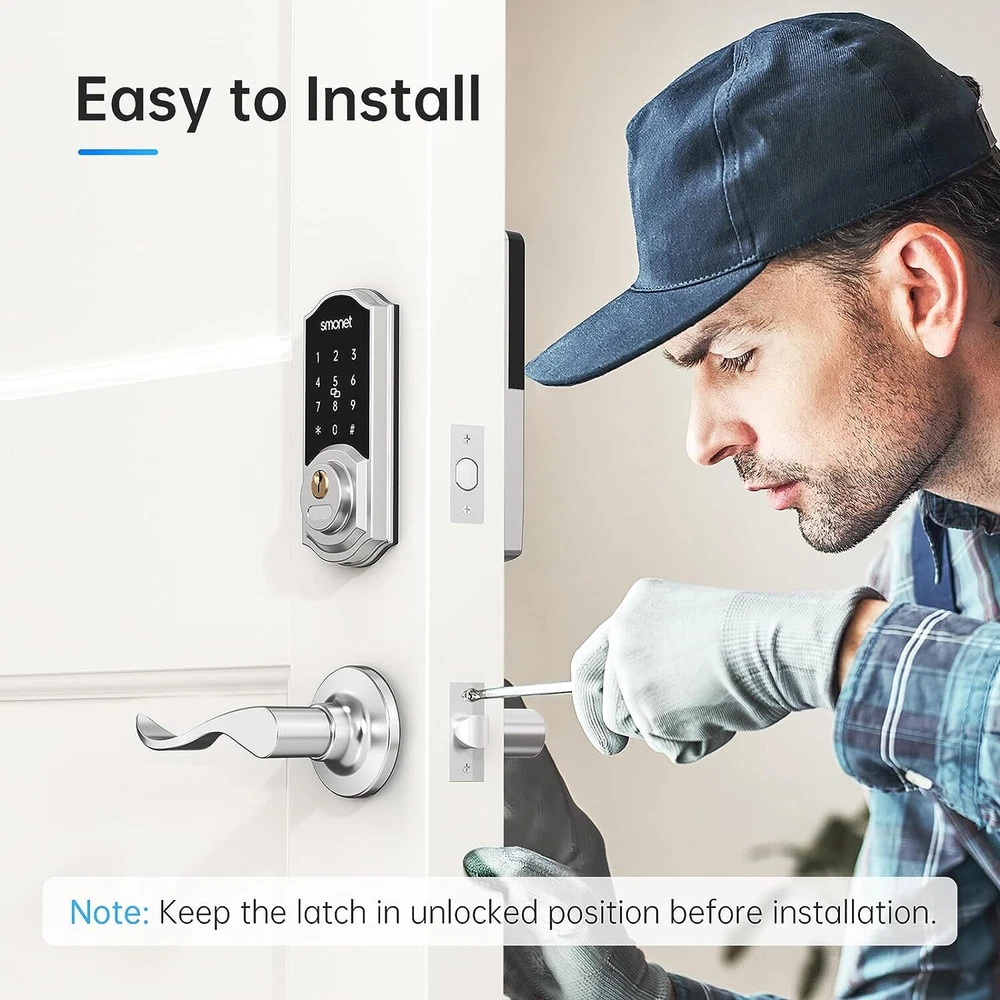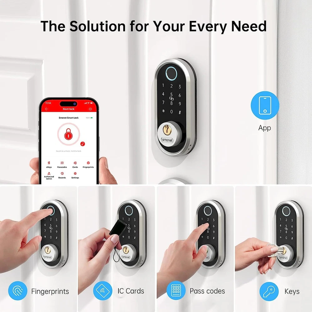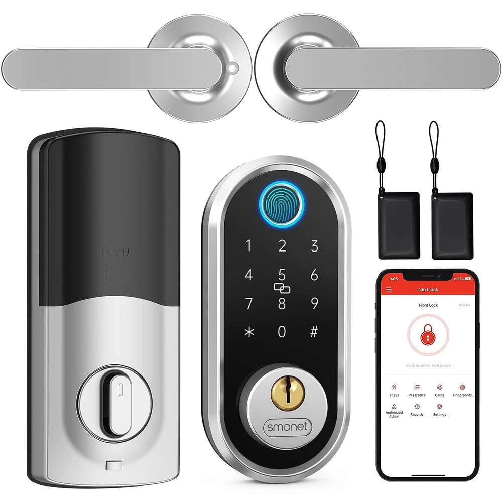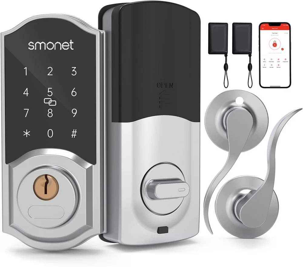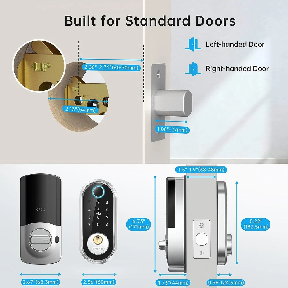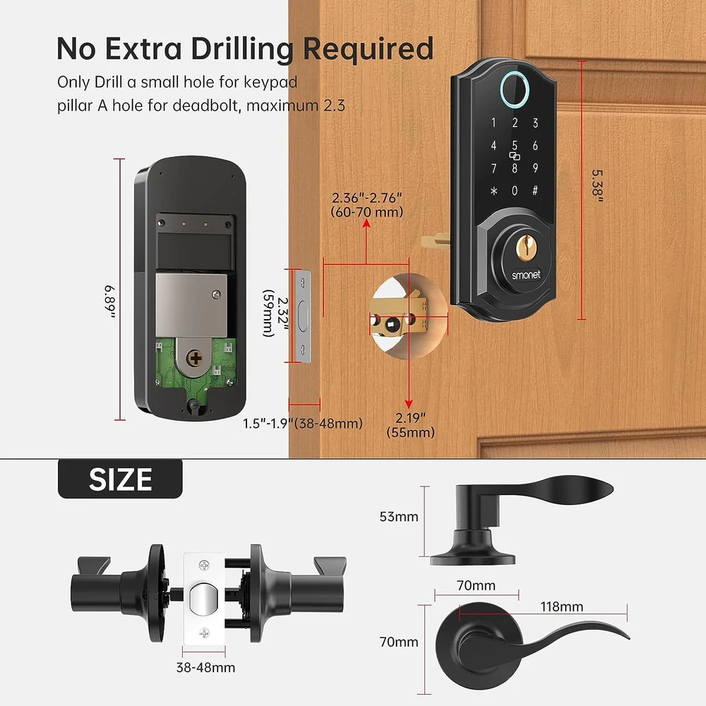 Options with "NO FP " means this model has NO fingerprint function, please kindly notice it About this item: 【 Keyless E ntry 】Front door handle set with 150 password code + 2 spare keys + 3 fobs + 250 fingerprints and bluetooth smartphone control, experience a revolutionary biometric technology with touch and go 360° fingerprint ID. Smart deadbolt supports working with Alexa & Google Home Assistant and remote controlling with your lock if paired with G2 Gateway (Optional, sold separately). 【 Automatic L ock 】With anti peeping function when entering passwords, set up auto lock function for the fingerprint door lock in 1-900 seconds, or long press '#' for manually locking. One-time password for temporary visitors, ekey or permanent code to your family, make it more flexible for children, guests, service people or others who wants to entry. 【 Keypad Door Lock with Hand le 】A digital deadbolt combined with 2 mating lever handles, built-in backlight. Solid alloy body and long battery life, 4pcs AA batteries providing 10,000 openings(approx. 12 months). Adding an equal touch of elegance to both traditional and modern homes, perfect for your smart home. 【 Easy to Ins tall 】Follow the steps and tips showing in the video, replace an existing deadbolt door lock in minutes with just a phillips screwdriver. Compatible with standard wooden, left and right handed doors, great solution for Airbnb rental apartment. Kindly noted that L/R side doors have different install method. 【 Professional Customer Su pport 】We provides at least 1 year warranty and free life-time technical support available to smart lock deadbolt. Any questions(such as installation or App problems or more information about G2 gateway) please feel free to reach out to us. Specifications: Brand: SMONET Model: A1 / M1 / Y1 Color: Black / Silver Material: Alloy Shape: Camelot / Rectangle / Oval Style: Modern Door Direction: Universal / Reversible (Both left & right, inswing & outswing) Connectivity Protocol: Bluetooth Ways to Unlock: Fingerprint / Keypad Passcode / Key Fobs / Physical Keys Control Method: App Phone APP: TT Lock / Next Lock (Totally FREE) Remotely / Voice Control: Alexa or Google Home (WiFi Gateway Needed) Lock Type: Keypad Finish: Painted Controller Type: Hand Control Control Method: Touch Power Supply: 4x AA Battery (NOT Included) IP Rating: IP63 What's in the box: 1x Front Door Lock Keypad 1x Rear Door Lock Panel 2x Knob or Lever Handle (Depends on your choice) 1x Latch 2x Key Fobs (IC Cards) 3x Physical Keys 1x Strike Pad 1x Strike Plate 1x Battery Cover 1x Drilling Template 1x Installation Screws Pack 1x User Manual Auto Lock Experience the convenience and peace of mind with smart deadbolt lock's automatic locking feature. Fingerprint Recognition Advanced fingerprint recognition technology enables the storage of up to 250 sets of fingerprints. Remote Share You have the ability to generate and share a one-time password remotely for guest. Easy to Install No extra drilling required. Can be completely installed by one person with just a Phillips screwdriver Voice Control Embrace the power of voice: Control your lock with effortless ease! (G2 Gateway Required) Widely compatibility to all kinds of weather SMONET Pro keyless entry door lock with handle provides IP63 waterproof and works from -4 °F to 158 °F temperatures. Smooth and stable in all kinds of weather, safeguard your home as always. Long battery life, Type C backup Intuitive touchscreen display, long battery life, up to 12 months of battery life. SMONET Pro front door lock with low battery alert and type C emergency backup, free you from battery worries.