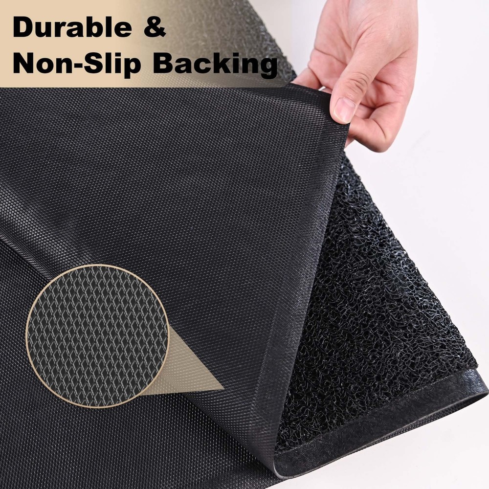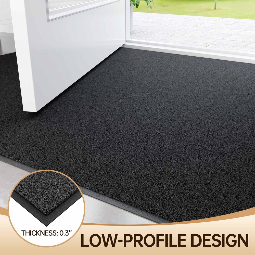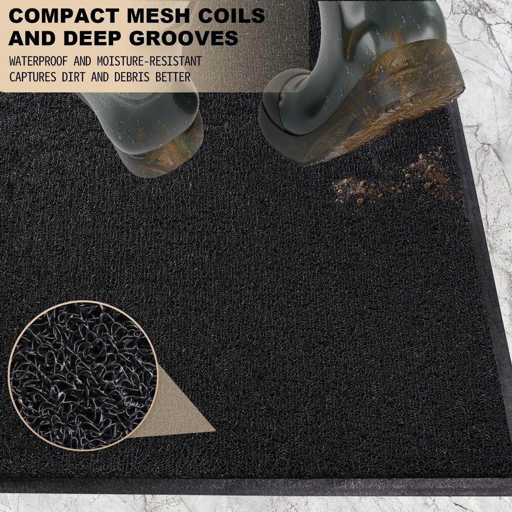 outdoor door mats for outside entry - the superhero of cleanliness for your home entrance! Made from top-quality PVC material, this entrance mat is tougher than average indoor door mat. It swiftly absorbs dirt, dust and moisture, keeping your floors clean and dry. With its non-slip backing, it stays securely in place, providing outstanding slip resistance. Cleaning is a breeze - just tap, shake, or use a vacuum or hose. Outside door mats for front door comes in versatile sizes to fit any high-traffic area. It’s low-profile design adds warmth and charm to your doorstep. Elevate your entryway with our front door mat outdoor entrance and make a lasting impression from the moment guests arrive. Specifications: Product Name: Doormat indoor entrance Size: 36" x 48" Color: Black Material: Premium Quality PVC Thickness: 0.3 inch Weight:7.53 LB Occasion: Our indoor door mats for entryway widely used for all weather, works as commercial door mat, industrial rugs for entryway, outdoor welcome mat, industrial mats for floor, shoe mat, Muddy Mat, dog doormats, commercial rugs, commercial floor mat ect. It can scrap off dirt, water, dust,grit, sand,mud, slush, sleet, grass or retain, snow. Effectively Capture Dirt: With an ultra-dense bristle topside, our outdoor mat effectively traps dust, mud, dirt or snow from shoes or pet paws. Ensuring your home floors stay clean and dry Easy to Clean: Simply tap and shake the back of the front door mat, use a vacuum or hose quickly removing dust and debris. For deep clean, rinsing the outdoor doormat with hose to remove stubborn dirt and air dry to restore its shine and freshness. Ready to warmly welcome your guests Extra Large and Versatile Use: Our outdoor mats for front door are extra large and multiple sizes suitable for various outdoor or indoor use: commercial industrial areas, shopping mall entrances, outdoor patios, garages, garden entrances and other high-traffic areas Durable for High Traffic: The door mat indoor entrance is made of premium PVC material, with higher tensile strength and tear resistance, the entryway rug stain and fade resistant, soft and flexible design can withstand a variety of weather conditions for years Non Slip Backing: Our welcome mats for front door features a textured rubber backing that adhere tightly to the floor and provide excellent non-slip performance. Please keep the floor dry and the front door rug laid flat before placing it, it is more safe and cozy