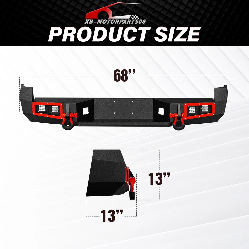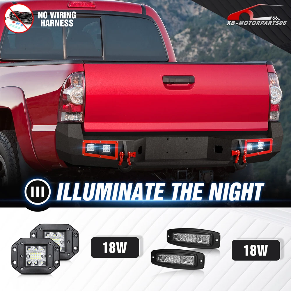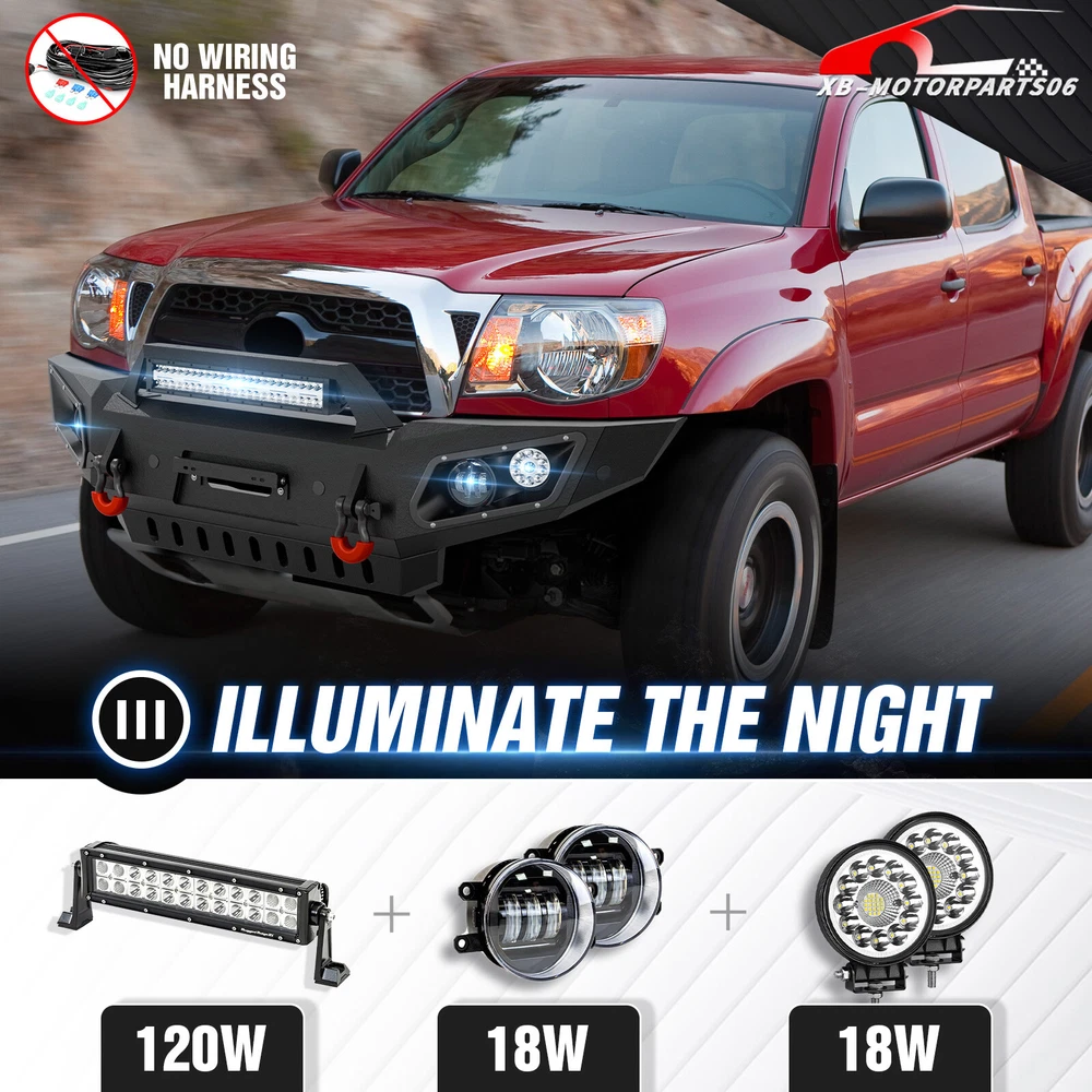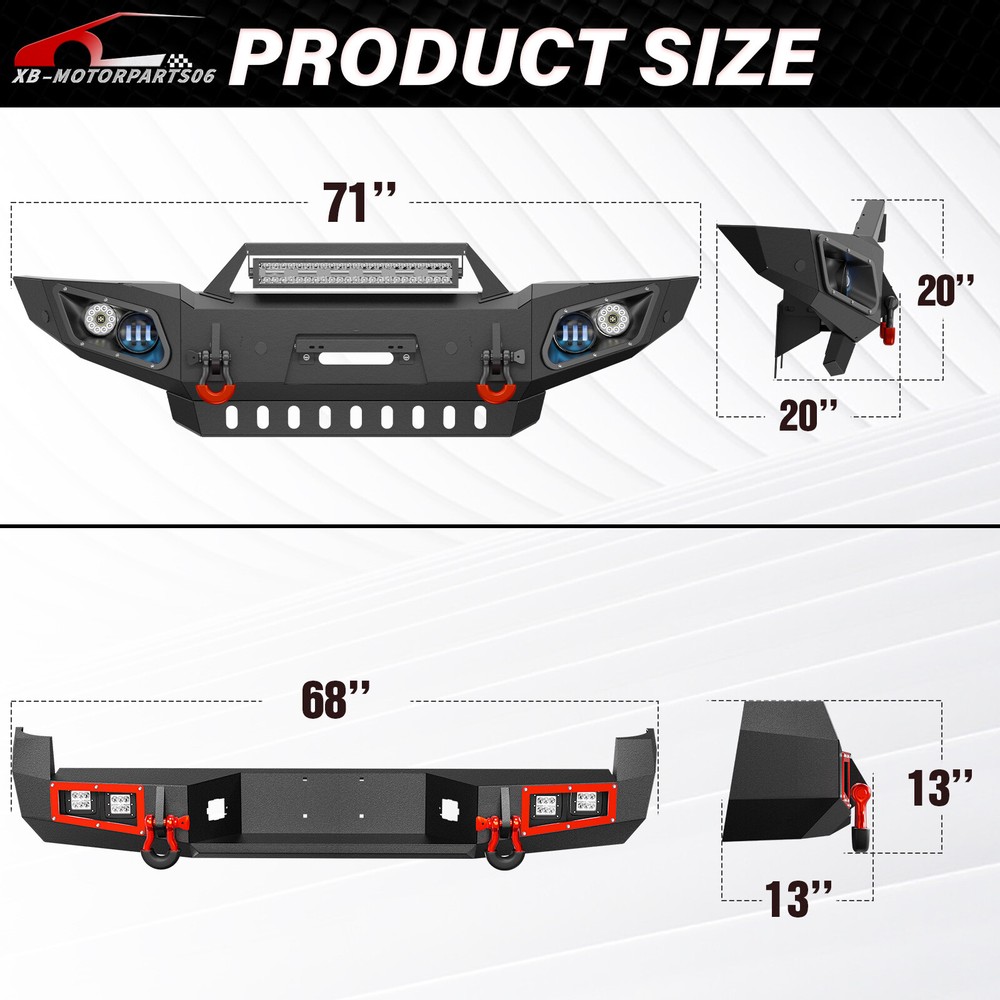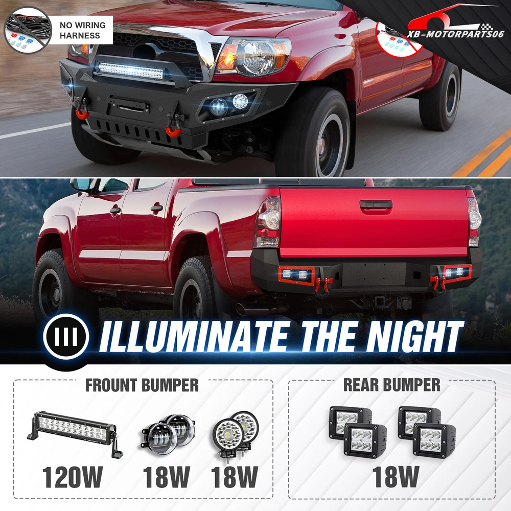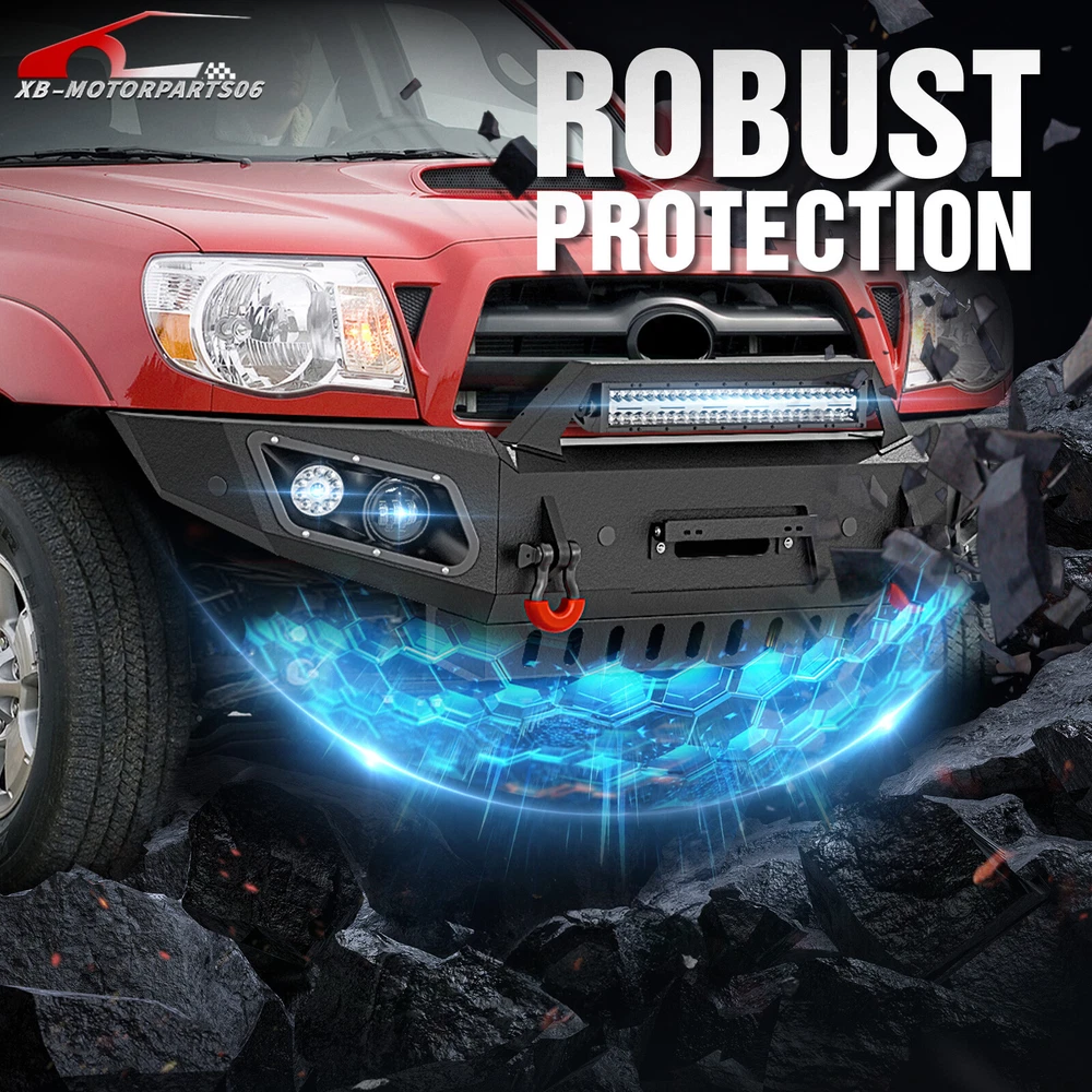 Front /Rear Bumper W/ LED Lights & D-rings For 2005-2015 Toyota Tacoma 2nd Gen Please pay attention to the product options you select: If you choose Front & Rear Bumper,You can get 1 × Front Bumper, 1 × Rear Bumper and Mounting Hardware; If you choose Only Front Bumper,You can get 1 × Front Bumper and Mounting Hardware; If you choose Only Rear Bumper,You can get 1 × Rear Bumper and Mounting Hardware; Suitable Models : Compatible with 2005-2015 Toyota Tacoma 2nd Gen Package Includes : ① Front & Rear Bumper option : 1 x Front Bumper, 1 x Rear Bumper, 9 x LED Lights, 1 x License Plate Bracket , 1 x Winch Plate , Paintable Armor , 4 x D-rings, Skid Plate, 2 x manual, screw fittings ② Fro nt Bumper option : 1 x Front Bumper, 1 x License Plate Bracket, 1 x Winch Plate , 5 x LED Lights, 2 x D-rings, Skid Plate, 1 x manual, screw fittings ③ Rear Bumper option : 1 x Rear Bumper, Paintable Armor, 2 x D-rings, 4 x LED Lights, 1 x manual, screw fittings Product Information : Package Dimensions : 70.08"D x 24.8"W x 24.8"H Installation mode: Bolt-On With Sensor Holes: Yes ( Only Front Bumper Have, and not fit for original sensor ) Steel thickness: 3mm Placement on Vehicle: Front/Rear Item Weight: Front Bumper: 121 Pounds; Rear Bumper: 67 Pounds Material: Carbon Steel Color: Black (hand measurements may have an error of 2-3 mm/0.078-0.118 in) Feature : Front bumper : ① A durable skid plate for underbody protection, a winch plate capable of supporting up to 12,000 pounds, two 4.75-ton D-rings, a license plate bracket, sensor holes, a powerful 120W LED light bar, and four brilliant 18W LED spotlights ; ② Our front bumper is made from strong high-strength steel with a durable textured black powder coating. This combination ensures both toughness and style while offering protection. It's also resistant to rust, ensuring long-lasting performance and appearance, even if the powder coating gets scratched; ③ Our front bumper has a user-friendly bolt-on design for easy, modification-free installation; ④Powder Coated, Durability, Waterproof; Rear Bumper : ① Our rear bumper comes equipped with a stainless steel skid prevention plate, two 4.75-ton D-rings, and four powerful 18W LED spotlights. It's tailored with pre-drilled holes for License Plate lights and the license plate; ② Our rear bumper, made from strong high-strength steel with a textured black powder coating, delivers both durability and style; ③ Our rear bumper has a user-friendly bolt-on design for easy, modification-free installation; ④ Durability, Waterproof, Rust-proof; Warranty Period :2 year Standard Shipping (FedEx Ground or FedEx Home Delivery) Will usually ship within 3 business days of receiving cleared payment Please pay attention to the product options you select: If you choose Front & Rear Bumper,You can get 1 × Front Bumper, 1 × Rear Bumper and Mounting Hardware; If you choose Only Front Bumper,You can get 1 × Front Bumper and Mounting Hardware; If you choose Only Rear Bumper,You can get 1 × Rear Bumper and Mounting Hardware; Suitable Models : Compatible with 2005-2015 Toyota Tacoma 2nd Gen Package Includes : ① Front & Rear Bumper option : 1 x Front Bumper, 1 x Rear Bumper, 9 x LED Lights, 1 x License Plate Bracket , 1 x Winch Plate , Paintable Armor , 4 x D-rings, Skid Plate, 2 x manual, screw fittings ② Fro nt Bumper option : 1 x Front Bumper, 1 x License Plate Bracket, 1 x Winch Plate , 5 x LED Lights, 2 x D-rings, Skid Plate, 1 x manual, screw fittings ③ Rear Bumper option : 1 x Rear Bumper, Paintable Armor, 2 x D-rings, 4 x LED Lights, 1 x manual, screw fittings Product Information : Package Dimensions : 70.08"D x 24.8"W x 24.8"H Installation mode: Bolt-On With Sensor Holes: Yes ( Only Front Bumper Have, and not fit for original sensor ) Steel thickness: 3mm Placement on Vehicle: Front/Rear Item Weight: Front Bumper: 121 Pounds; Rear Bumper: 67 Pounds Material: Carbon Steel Color: Black (hand measurements may have an error of 2-3 mm/0.078-0.118 in) Feature : Front bumper : ① A durable skid plate for underbody protection, a winch plate capable of supporting up to 12,000 pounds, two 4.75-ton D-rings, a license plate bracket, sensor holes, a powerful 120W LED light bar, and four brilliant 18W LED spotlights ; ② Our front bumper is made from strong high-strength steel with a durable textured black powder coating. This combination ensures both toughness and style while offering protection. It's also resistant to rust, ensuring long-lasting performance and appearance, even if the powder coating gets scratched; ③ Our front bumper has a user-friendly bolt-on design for easy, modification-free installation; ④Powder Coated, Durability, Waterproof; Rear Bumper : ① Our rear bumper comes equipped with a stainless steel skid prevention plate, two 4.75-ton D-rings, and four powerful 18W LED spotlights. It's tailored with pre-drilled holes for License Plate lights and the license plate; ② Our rear bumper, made from strong high-strength steel with a textured black powder coating, delivers both durability and style; ③ Our rear bumper has a user-friendly bolt-on design for easy, modification-free installation; ④ Durability, Waterproof, Rust-proof; Warranty Period :2 year