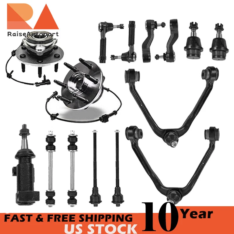 Store Categories Store Categories Brake rotor and pads Suspension Parts Trailer Parts Air Filter Other Details 15pc Front Wheel Bearing & Hub + Control Arms Assembly Kit Front Suspension Kit Fits Both Driver and Passenger Sides Kit Includes: 2x Front Wheel Bearing & Hub Assembly - Driver and Passenger Side - 515036 2x Front Upper Control Arm - Driver and Passenger Side - K80942 2x Front Lower Ball Joint - Driver and Passenger Side - K6541 2x Outer Tie Rod - Driver and Passenger Side - ES3493 2x Inner Tie Rod - ES3488 2x Front Sway Bar End Links - K 8987 1x Pitman Arm (4-Groove) - K6536 1x Idler Arm - K6534 1x Steering Idler Arm Bracket Assembly - K 6723 Hub Specifications Position: Front Lugs: 6 Bolt ABS on Hub: Yes MAKE MODEL YEAR RANGE SPECIFIC DETAILS CADILLAC ESCALADE 2002-2006 4WD/AWD w/Torsion Bar Suspension CADILLAC ESCALADE ESV 2003-2006 4WD/AWD w/Torsion Bar Suspension CADILLAC ESCALADE EXT 2002-2006 4WD/AWD w/Torsion Bar Suspension CHEVROLET AVALANCHE 1500 2002-2006 4WD Models w/Torsion Bar Suspension CHEVROLET SILVERADO 1500 1999-2000 4WD Models w/Torsion Bar Suspension CHEVROLET SILVERADO 1500 2001-2006 4WD Standard & Extended Cab Only; Models w/Torsion Bar Suspension CHEVROLET SUBURBAN 1500 2000-2006 4WD Models w/Torsion Bar Suspension CHEVROLET TAHOE 2000 4WD New Body Models w/Torsion Bar Suspension CHEVROLET TAHOE 2001-2006 4WD Models w/Torsion Bar Suspension GMC SIERRA 1500 1999-2000 4WD Models w/Torsion Bar Suspension GMC SIERRA 1500 2001-2006 4WD Standard & Extended Cab Pick-up Only, Including Denali; Models w/Torsion Bar Suspension GMC YUKON 2000-2006 New Body Style 4WD Models w/Torsion Bar Suspension; Including Denali GMC YUKON XL 1500 2000-2006 4WD Models w/Torsion Bar Suspension; Including Denali Warranty Warranty • All of our brand new items come with a 30-60 Days money-back guarantee. We define the item as defective only if it doesn't function as described. • It is the buyer's responsibility to understand the item description before bidding. We will replace the defective items, provided that they are in stock within the warranty period posted with the listing. We will refund the purchase price if the replacement is not available or buyer prefers a refund and send the original item back at his/her own cost. • The guarantee will be only for the cost of the item, we will not responsible for installation or other fees like labor expenses, towing expenses, additional repair expenses or other related expenses. Terms of sales Shipping Policy Payment Method Returns Policy Terms of sales • Please leave us a good rating after you have received the item and are happy with our transaction. If there are any issues, please contact me first before leaving a neutral, negative or 5 star rating. Customer Satisfaction is our top priority!! We promise we can make you happy if you give us a fair chance. Thanks and happy bidding! • Anyway, if you have any troubles,please feel free to contact us.We're willing to do anything resonable to help you out.Please do not leave any negative or neutral feedback before letting us know. Thanks! Shipping Policy • Items are usually shipped out within 24 hours during the business days after payment has been received. (except Saturday and Sunday).Delivery Time is about 4-7 business days to most of regions. We are not responsible for any wrong or undeliverable addresses. Please verify and update your shipping address on eBay during checkout. Payment Method • PayPal Preferred, Credit or debit card through PayPal. Returns Policy • All returned products (Replacements or Refund) need to be assigned an RMA # (Return Merchandise Authorization #) prior to return. Please contact us through eBay's messaging system to obtain an RMA# for the return. Any returned product without an RMA # on package will not be accepted or processed. About us About us • No matter what type of auto parts you need, when you choose us, you'll get the highest quality products and exceptional service for a reliable solution for your vehicle. We look forward to working with you and providing you with quality auto parts and a satisfying shopping experience.