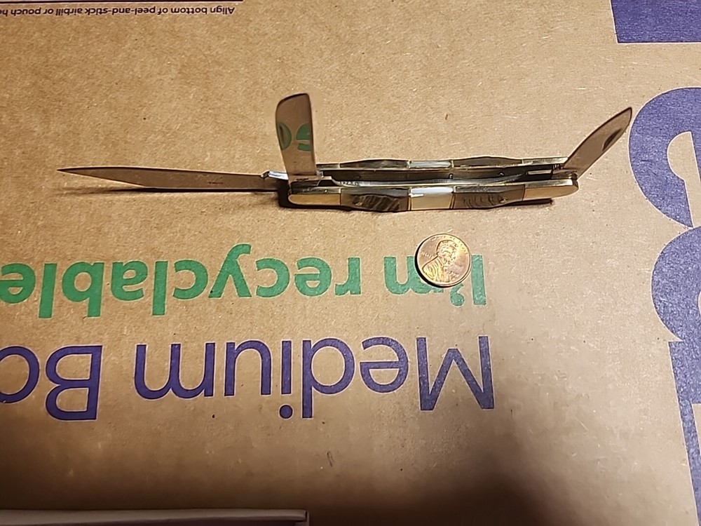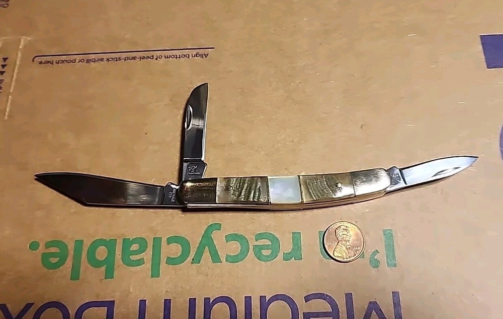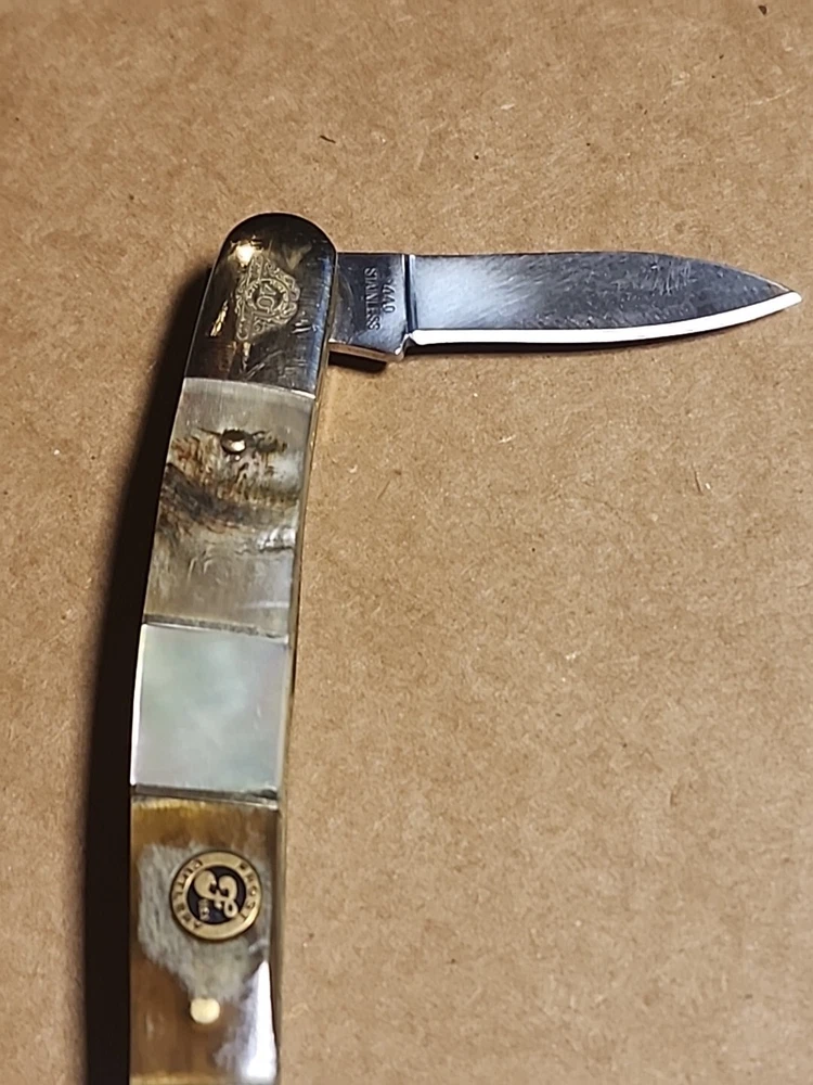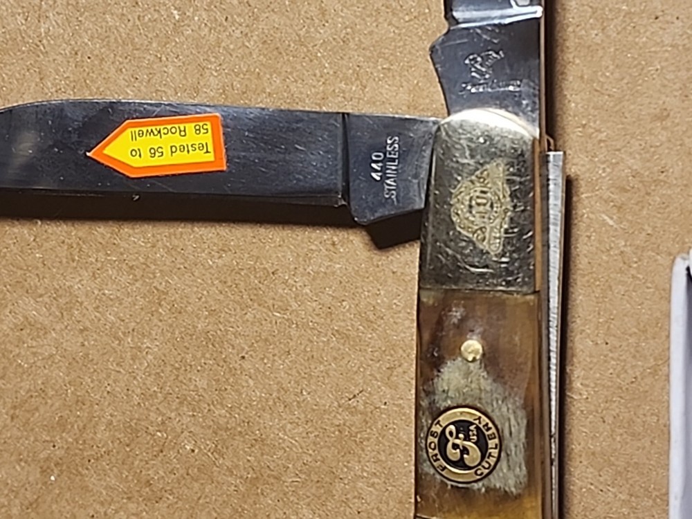 T his high quality Steel Warrior Wrangler Stockman is approximately 4 inches long (folded/closed) and weighs approximately 2.5 ounces. The handle is Ram Horn and Genuine Mother of Pearl with a Frost inlay. The Nickel Silver bolsters are stamped with Frost Cutlery 40th Anniversary. This knife utilizes a 2 7/8" Clip blade, 2 1/8" Sheepfoot Coping blade and 1 3/4" Pen blade. The blades are Polished 440 Stainless Steel and is tested to be 56-58 Rockwell hardness. The knife is presented in a Black, Frost Cutlery 40th Anniversary Box. This Wrangler Stockman is a professional-grade tool that comes with a Limited Lifetime Manufacturer's Warranty and is not designed nor intended to be used on or against humans. So, whether you're searching for authentic cutlery to collect, a top quality knife to give as a gift, or a superior tool to use, don't pass this one up! If you have questions about this 40-112RMR Wrangler Stockman feel free to ask. Frost Cutlery is a family-centered business that has been crafting traditional knives for over 40 years. Known in the industry for their unique designs and exceptional value, Frost Cutlery uses high-quality and legally-harvested natural materials such as Deer Stag, Buffalo Horn, Cattle Bone, or Exotic Hardwoods as well as durable and resilient synthetic materials like Celluloid or Delrin. Frost Cutlery has brought their dedication to workmanship and tradition to the many knife brands they now produce, including Steel Warrior and Frost Family.