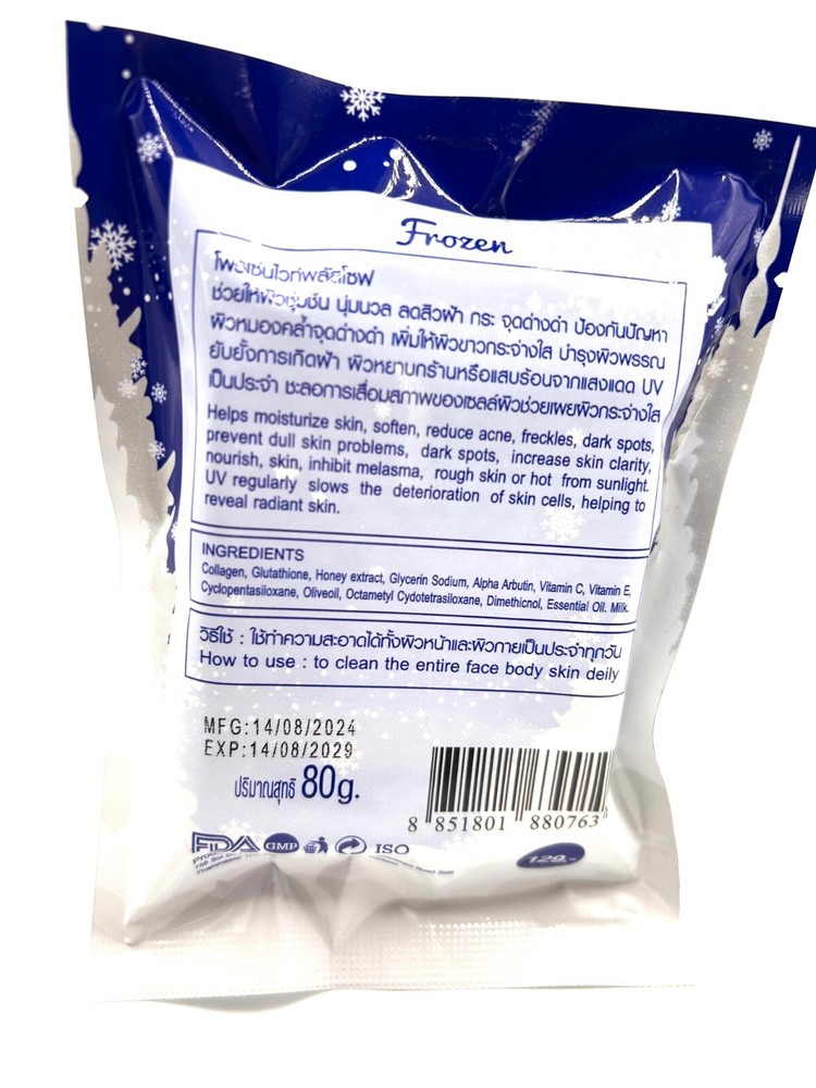 Frozen White Plus Soap - Skin Whitening and Brightening Soap for Radiant Skin Achieve a luminous, even complexion with Frozen White Plus Soap, specially formulated to brighten and even out skin tone. This soap combines powerful skin whitening ingredients with nourishing elements to provide you with a radiant glow. Perfect for daily use, it helps to reduce dark spots, blemishes, and pigmentation while keeping your skin soft and smooth. Key Features: Whitening & Brightening: Helps lighten skin, reduce dark spots, and create a smoother, more radiant complexion. Nourishing Formula: Enriched with ingredients that moisturize and protect your skin from dryness. Gentle on Skin: Suitable for all skin types, including sensitive skin, offering a gentle yet effective skincare solution. Natural Ingredients: Formulated with safe, natural extracts that support a healthy, glowing appearance. Long-lasting Results: Regular use can help improve skin tone and texture, leaving your skin looking youthful and fresh. How to Use: Wet your skin with water. Lather the soap and gently massage it onto your face and body. Leave it for a few minutes, then rinse thoroughly with lukewarm water. For best results, use daily. Package Includes: 1 Bar of Frozen White Plus Soap Important Notes: For external use only. Store in a cool, dry place. If irritation occurs, discontinue use and consult a dermatologist. Get glowing, flawless skin with Frozen White Plus Soap today!