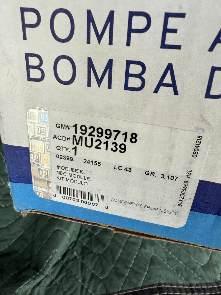 The Fuel Pump Module Assembly is manufactured by ACDelco with OEM Part Number 19299718. It operates on 12V voltage and features an electrical drive type. The Manufacturer Part Numbers are GM19299718 and MU1939. A California Prop 65 Warning is included due to potential exposure to chemicals such as lead. This item Is new(open box) it has never been used.