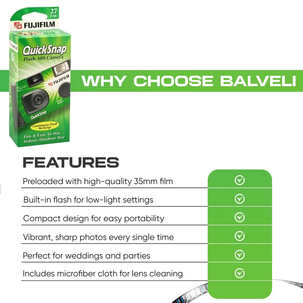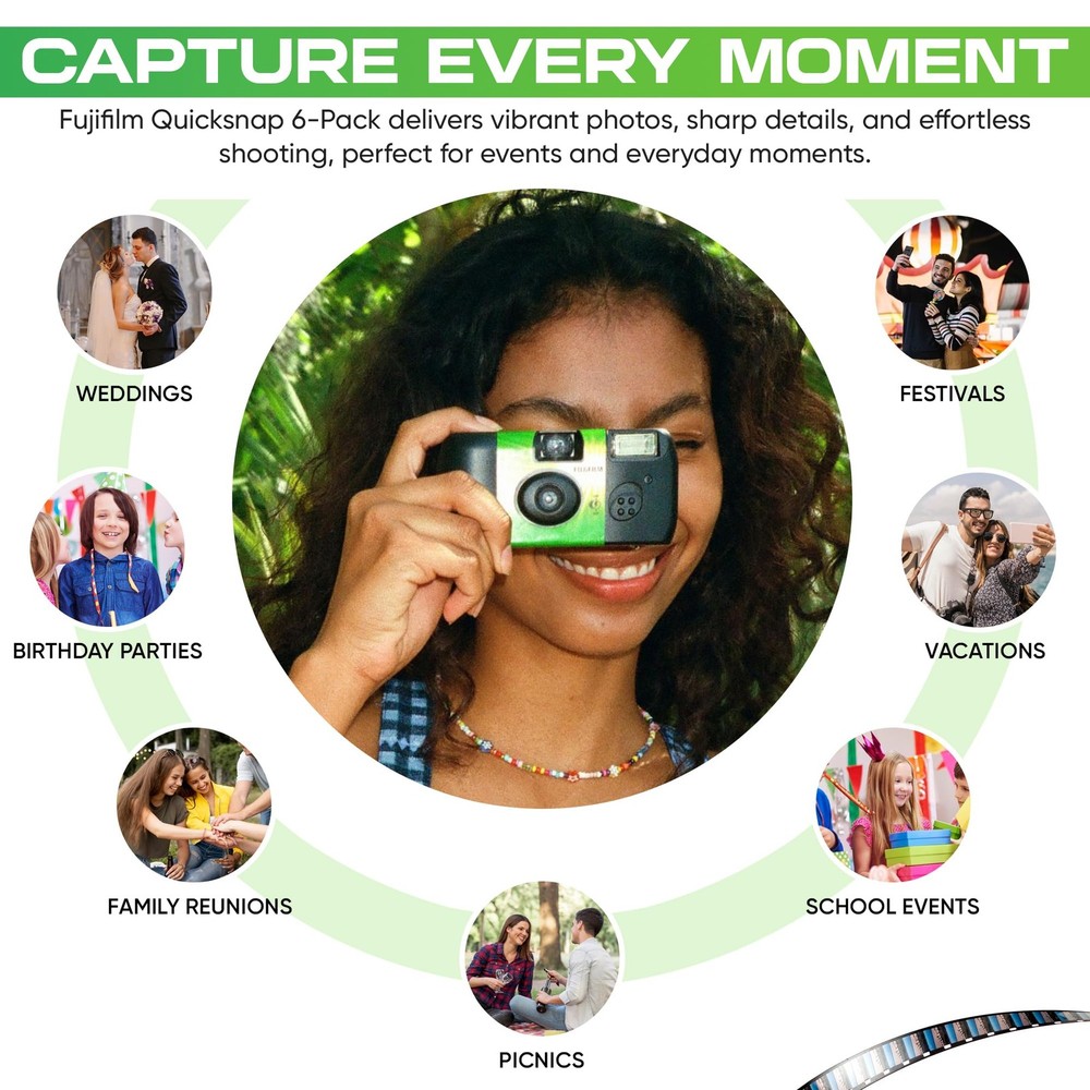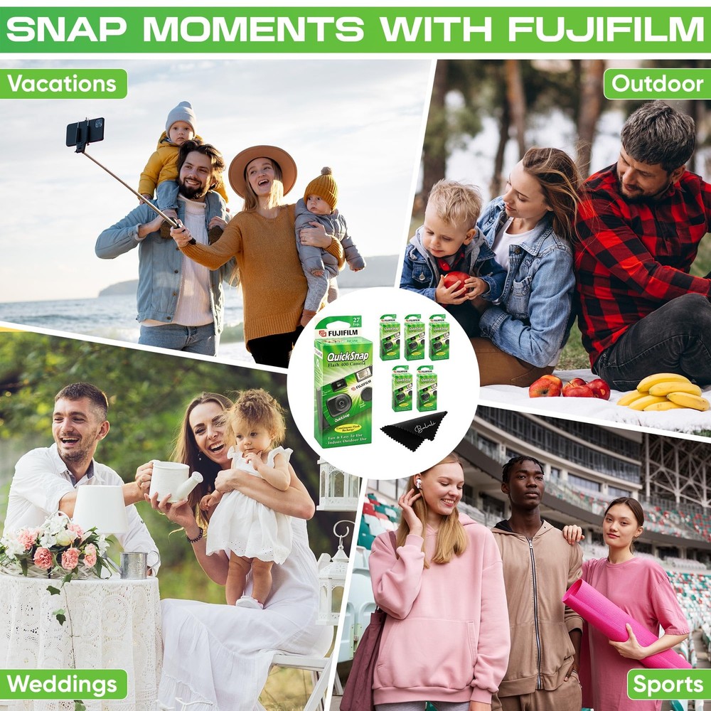 Ultimate Photography Pack: Get 8 Fujifilm Quicksnap disposable cameras, ready with 35mm film, alongside 's lens-care microfiber cloths and secure wrist straps. Snap in Style: Enjoy crystal-clear, vibrant photos with Fujifilm's quality. Each camera is equipped for the perfect shot, anytime, anywhere. Event-Ready Cameras: Supply guests with these easy-to-use cameras at your next event for a fun, interactive way to capture memories together. Travel Companion: Compact and pre-loaded, these cameras are ideal for travelers. Document your adventures without the bulk of traditional gear. No Moment Missed: With a built-in flash, these cameras perform under any light, ensuring your memories are captured perfectly, night or day. Hassle-Free Memories: Designed for single use, these cameras offer the simplicity of capturing moments without the worry of handling film. Bulk Benefits: This 8-pack not only offers value but ensures you have a camera ready for every occasion, from family outings to spontaneous adventures. Quality in Every Shot: Trust in Fujifilm's legacy to turn fleeting moments into lifelong memories with each snap from these disposable cameras. Simple And Convenient: The Fujifilm Quicksnap Flash 35mm Disposable Camera Offers A Fuss-Free Photography Experience. With Pre-Loaded Fujifilm Camera Film And A Built-In Flash, These Cameras Are Ready To Capture High-Quality Images In Any Lighting Condition. Ideal For Weddings, Parties, Or Everyday Moments, Enjoy The Classic Film Aesthetic With The Convenience Of A Disposable Format. High-Quality Imagery: Each Fuji Film Camera Is Equipped With A 35mm Lens Capable Of Producing Sharp And Vibrant Photos. The Built-In Flash Ensures Excellent Exposure, Even In Low-Light Conditions, Making It A Reliable Choice For All Your Memorable Events. Capture Stunning Film Photography With Ease And Confidence. Bulk Package Benefits: This 6 Pack Of Fujifilm Disposable Cameras Is Perfect For Capturing Multiple Angles And Perspectives At Any Event. Distribute Them Among Guests At A Wedding Or Party To Ensure No Moment Goes Unphotographed. Bulk Packaging Offers An Economical Solution Without Compromising On Quality. User-Friendly Design: Designed With Simplicity In Mind, Each Disposable Film Camera Features A Compact, Lightweight Body And A Comfortable Wrist Strap For Easy Carrying. The Intuitive Design Allows Users Of All Ages And Skill Levels To Take Beautiful Photos, Just Point And Shoot! Eco-Friendly And Ready To Use: Each Disposable Camera Bulk Pack Comes With A Microfiber Cloth For Keeping Lenses Clean, Ensuring Clear Shots Every Time. The Cameras Are Eco-Friendly, With Recyclable Parts And Packaging, Aligning With Sustainable Practices While Providing Exceptional Utility And Value.