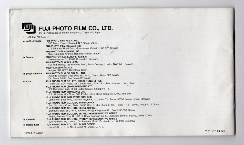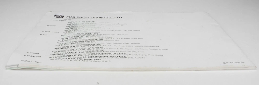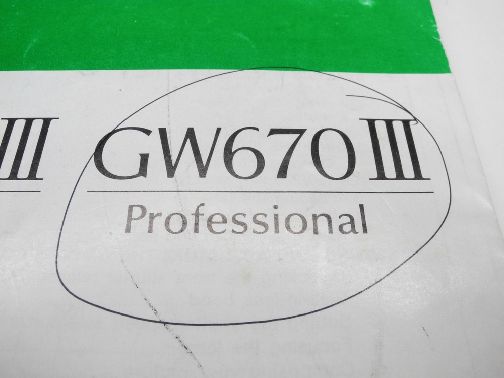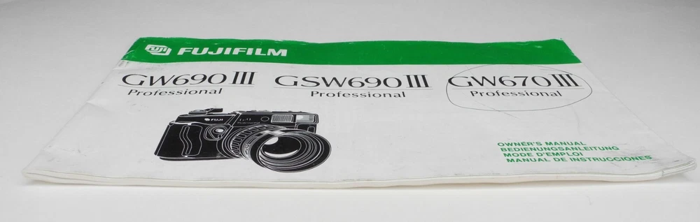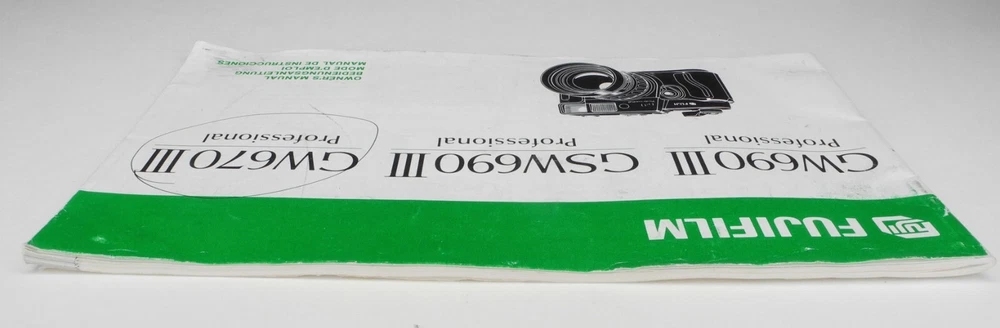 Fuji Fujifilm GW690 III GSW690 III GW670 III Professional Camera Owner's Manual Description: Condition: BGN This instruction book is in BGN condition with signs of noticeable wear. There is a fold out section on the front of the book that has some small tears along the folds. There is also some writing on the front cover. There are also some surface stains and wear on the front and back cover. The internal book is in better shape and content wise is fully intact. This instruction book is 46 total pages with sections in English, German, French and Spanish. Condition: LN "Like New" 99% -100% of NEW EX+ "Excellent Plus" Exceptionally nice. May have small signs of wear but visible only under close inspection. EX "Excellent" Shows moderate wear. May have up to two of the following signs of wear; small or light stain, writing, frayed page edges, small tear or a couple dog eared pages. There will be no missing pages. BGN "Bargain" Shows more than average wear. May have up to three of the following signs of wear; stained cover / pages, writing, frayed page edges, torn cover / pages or dog eared pages. There will be no missing pages. UG "Ugly" Very rough looking. Will have a few of the following dog ears, tears, stains, pages missing, writing, etc.