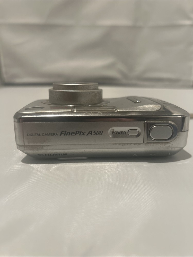 This is the Fujifilm FinePix A Series A500 digital camera in silver, featuring a 5.1 MP maximum resolution, 3x optical zoom, and 5x digital zoom. It includes features like direct print, date/time stamp, DPOF support, and PictBridge support. The camera uses AA batteries and weighs 8 oz.