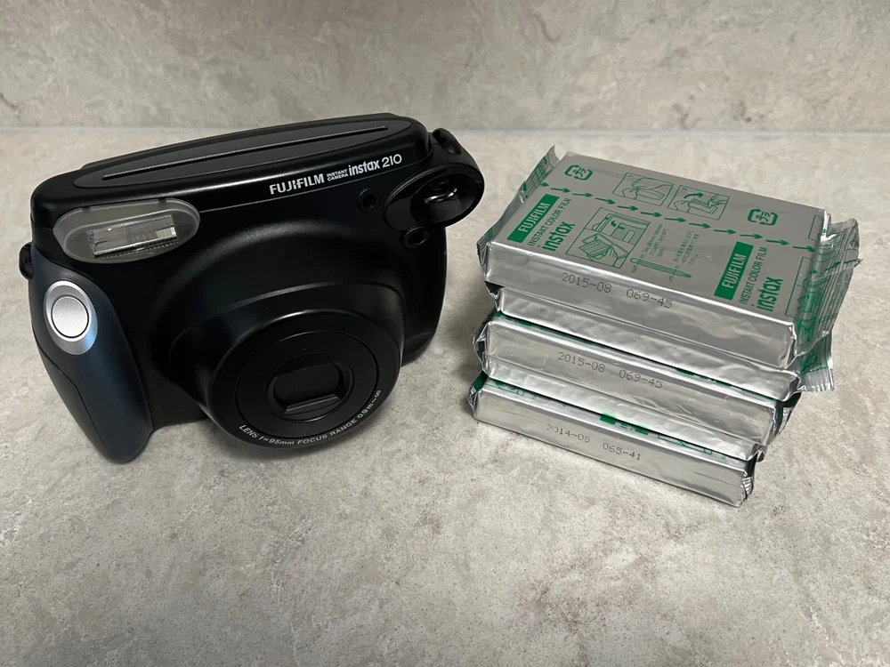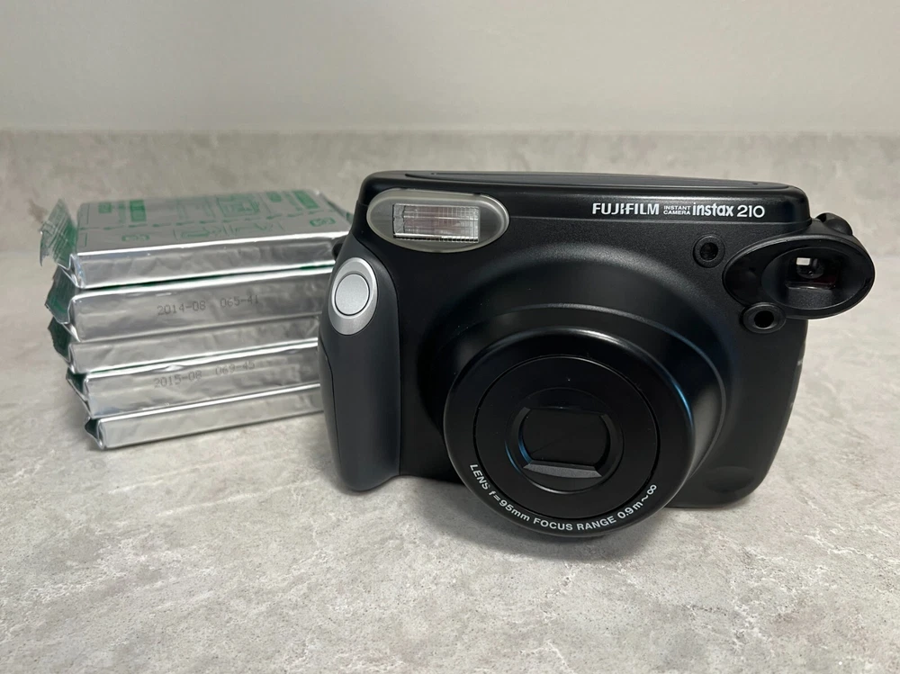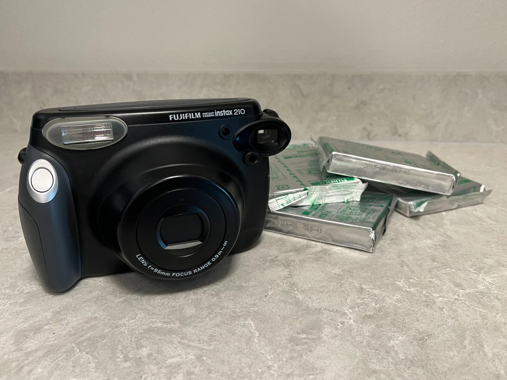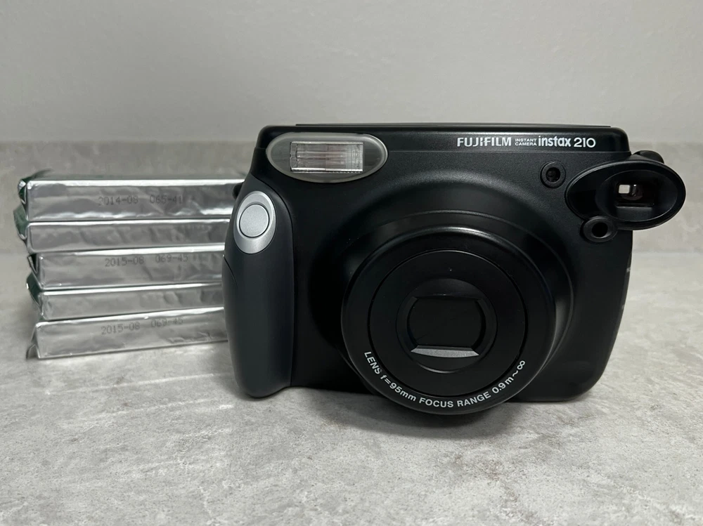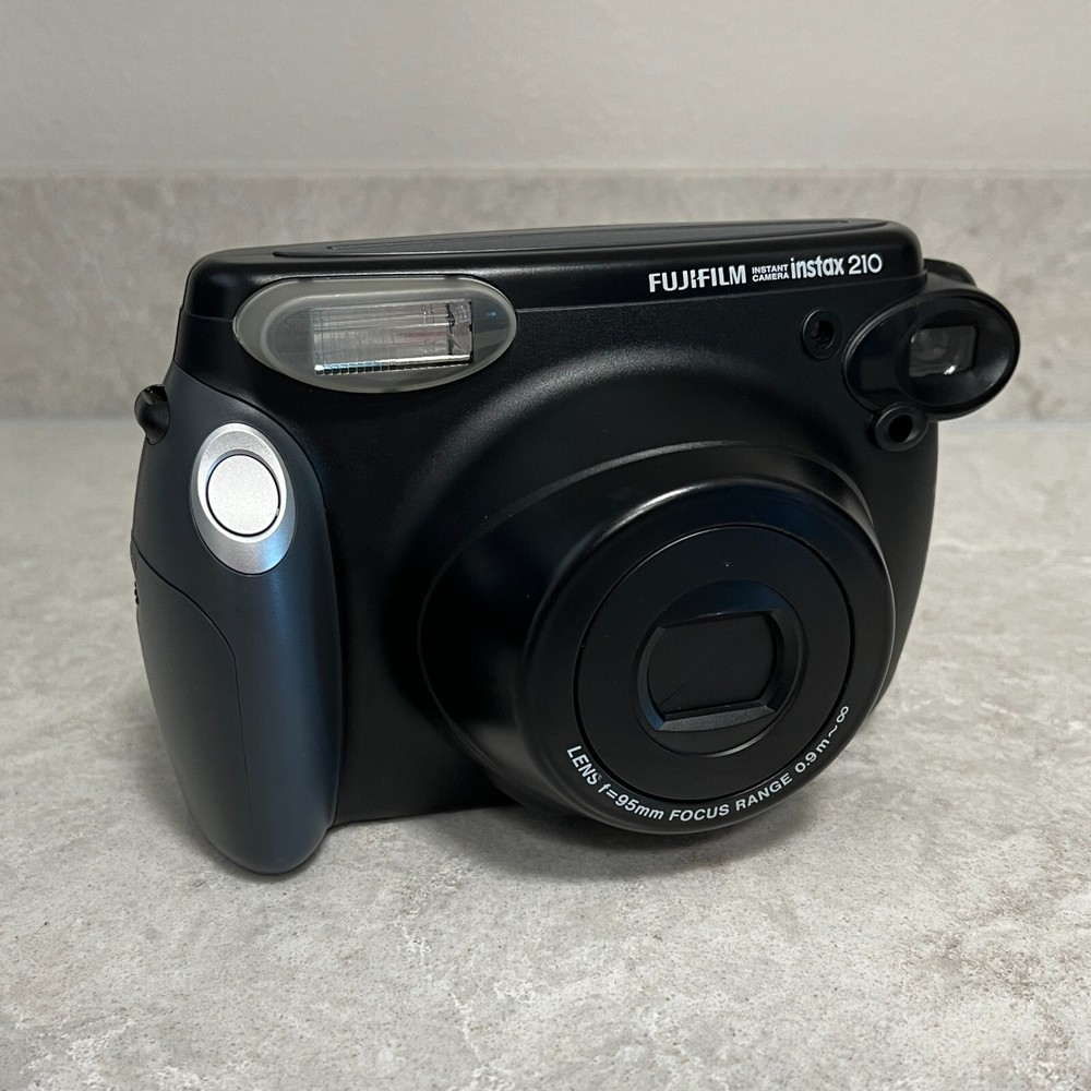 Fujifilm Instax 210 Polaroid Camera - TESTED & WORKING Excellent condition as pictured Camera dimensions: 7.5" long x 5" wide x 4" tall Photo dimensions: 4.25" wide x 3.5" tall Includes 5 packs of 10 sheets of photo paper. They are past their expiration date but they were stored properly so they still work, tested with a separate pack in the same lot.