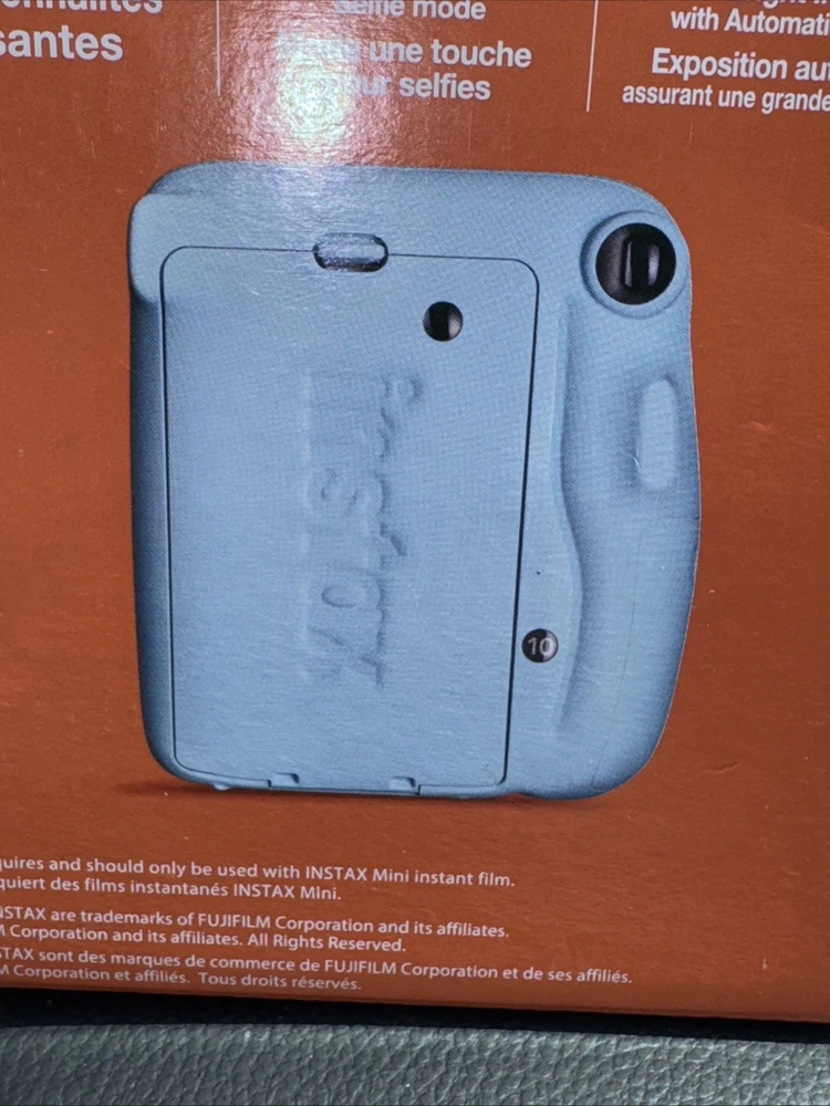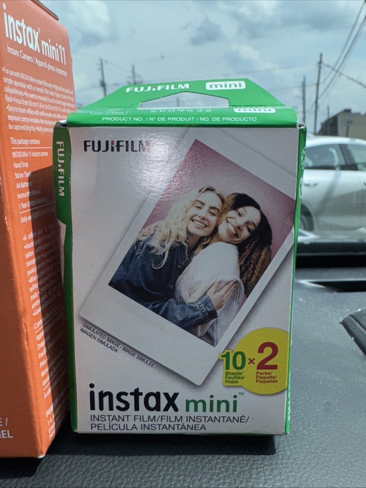 Film has never been opened! Camera has never been removed from the box! Fujifilm Insta mini 11 Sky blue Instant camera Film features, one touch bright images with automatic exposure You will receive a pack of Fujifilm that has 10 sheets per pack and you will receive two packs which gives you a total of 20 instant mini pictures Film expired 2/2025