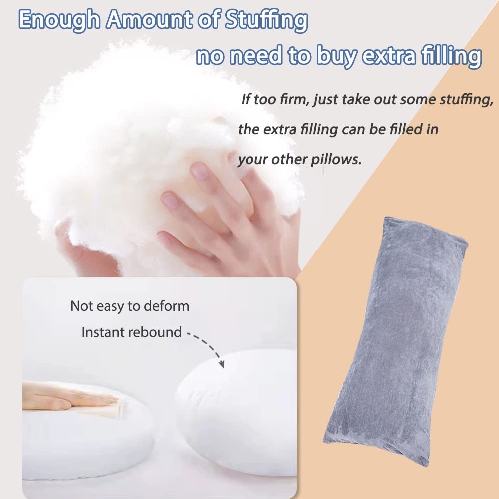 MULTIPURPOSE BODY PILLOW FOR SIDE, STOMACH SLEEPERS AND PREGNANCY Our supportive body pillow is designed to contour to your natural body curve, which will allow your back, hips, legs, knees and feet remain in correct alignment through sleeping whole night. It also functions as pregnancy pillow to keep you sleep in the best and comfy position. Use this versatile pillow to prop or snuggle while reading, watching TV, or playing video games, you will enjoy the accompany of this large hug pillow. HIGH QUALITY PILLOW STUFFING NOT EASY TO GO FLAT We choose high quality polyfill filling for this body pillow which is odorless and supportive, it will still remain fluffy and firm after long time use. CONTROL YOUR OWN COMFORT Simply remove pillowcase, machine wash, dry and put the pillow insert back, you will get a fresh and healthy pillow easily. If sleeping pillow is too high or low for you, zipper in the inner cover facilitates to adjust stuffing to your preferred height. BRAND NEW PRODCT AND QUALITY QUARANTEE All our products are air-tight sealed and you will receive brand new pillows. ANY ADULT, MEN AND WOMEN WILL ENJOY THE LUXURIOUS COMFORT OF THIS BODY PILLOW! Velvet Pillowcase Included: Body pillow comes with a soft, odorless and skin-friendly machine washable velvet body pillow cover, suitable to use both in cooling and warm days Body Pillow for Side Sleepers: Body pillows for adults aim to reduce strain on head, neck, spine, hips, knees and back. It helps promote proper spinal alignment and position you to sleep comfortably. A perfect hugging pillow to cuddle and snuggle for side and back sleepers Pregnancy Use: If pregnancy pillow takes too much space on your queen or king size bed, this long body pillow can be ideal replacement. It keeps expectant mothers sleep in the right position and achieve a restful sleep Bring Comfort to Your Home: Update and refresh your bedding space with an added level of comfort by this 20x54 inches decorative long pillow for bed. You can also choose separate pillow covers to match your existing bedroom decor style Premium Quality: High quality polyester fiber stuffing keeps this full body pillow fluffy and firm while providing plenty of head to toe support. It will keep its shape even after long time use