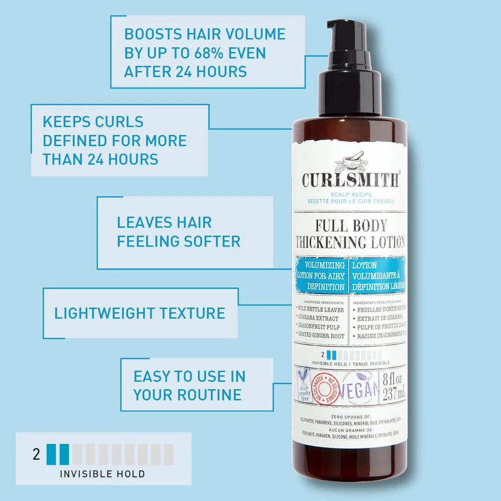 INSTANT VOLUME - Our lightweight thickening lotion helps give your hair instant volume for fuller looking hair with airy definition. Our unique formula creates natural movement and body leaving your hair feeling silky smooth and soft to touch. Can be used on all hair types and thickness - on fine hair for instant volume or medium/thick hair looking for extra definition. HOW THE HAPPENS - Apply on top of your usual leave-in conditioner or moisturiser, distributing through the lengths of your wet hair making sure to coat strands evenly. Can be followed with other stylers for extra hold if needed, diffuse or air dry as usual. WHAT MAKES US DIFFERENT - Inspired by generations of homemade hair remedies, blends fresh curl-loving foods with kitchen cupboard staples and rare natural ingredients to make premium products that really work. Healthy ingredients, professional results, no compromise. NO NASTIES - All our products have zero spoons of Sulphates, Silicones, Mineral Oils and Phtalates. Plus they're Curly Girl Friendly, they’re 100% Vegan and Cruelty Free. CURL JOURNEY - believes that curls don’t have to be complicated, which is why we’re on a mission to take the guesswork out. We’re here to help you on your curl journey whether you have the loosest of waves to the tightest of coils or anything in between.