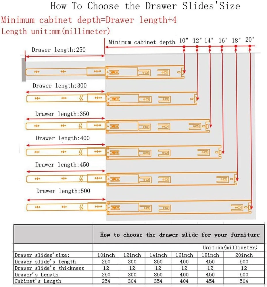 Made from high-grade cold rolled steel that is electron plated 100-Lbs max weight capacity Length: 12-inch (305mm) Smooth glide ball bearing drawer slides less noise at closing and opening Set includes 1 pair of slides and 12 screws Product Description Zengest Product philosophy The combination of practical and beautiful appearance is our constant pursuit Zengest drawer slide Features Solid steel bearing shaft, no noise during opening and closing. Slide material thicker, bearing 100 pounds, material plating products, will not rust. Internal rail separation is simple and easy to install. Use on bedroom furniture, sliding cabinet doors, office cabinets, and bathroom cabinets. Size selection: Slide length less than or equal to drawer depth minus 4 mm. Rustproof drawer slide Size selection Slide length less than or equal to drawer depth minus 4 mm. Zengest, worth your choice