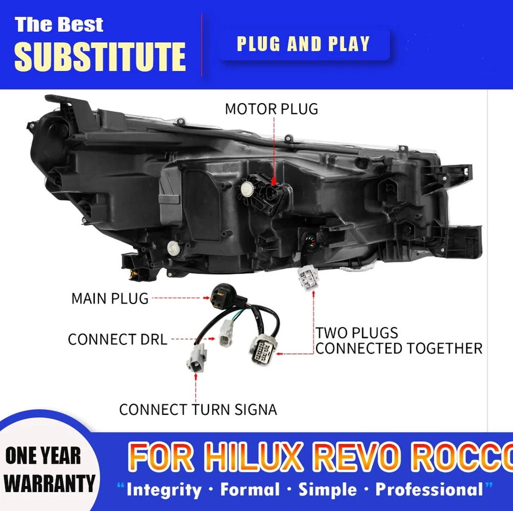 Full LED DRL Sequential Indicator HeadLights For Toyota Hilux Revo Rocco 2020-23 Features: 1. One pair: Left + Right head lights 2. Bulbs: All bulbs are built-in, no extra bulbs needed 3. Function: DRL+Turn Signal(Yellow)+High Beam+Low Beam lights 4. Easy installation: plug and play,same as original one to install 5. Assembly: all parts are included in the package,no need to buy extra bulbs or harness Fits: For Toyota Hilux Revo Rocco 2020-23 Specifications: Item type: Headlight assembly Material: High quality ABS+LED Features: Dynamic turn signal Headlight function: high beam, low light, turn signal, day running light Include: Yes Lamp type :LED Color processing: Transparent case/transparent lens Light color: as shown Installation position: Front, left, passenger side, right, driver's side This is an aftermarket replacement item, but it's not the real thing Package List: 2x Headlight assembly (Left+Right) Note: Color may vary slightly due to the color setting of each individual monitor. Installation instruction is NOT included, professional installation is highly recommended. Payment Delivery details Terms of sales About us Contact us Payment We accept PayPal,ebay payment. Please make sure your address is correct before you pay. Feedback will be left automatically after we receive your feedback. Please contact us before leaving a Negative feedback or Neutral feedback. We would try our best to help you solving any problem. Delivery details We Ship Worldwide. Item will be shipped out within 1-3 business day after full payment received. Delivery Time: USA ------------------------------- 7-15 Working Days by China Epacket delivery. Australia ------------------------ 7-12 Working Days by AUpost-eparcel from China. UK/ Canada -------------------- 10-20 Working Days Europe -------------------------- 10-25 Working Days Italy/ South America ------ 12-25 Working Days Terms of sales We offers 30-day refund, and 1 year manufactured warranty on all products, Warranty period starts from the date of purchase. After 30 days from the date of purchase, all return can only be replaced by same item, unless this item is out of stock at that moment,buyer need pay the shipping fee. * Warranty will be voided if the product is mishandled or physical damaged by customer. We will refuse back all the returns which are out of warranty. * We are not responsible for any kind of compatible issues, or problems related to any specific software or games. Return Policy Returns are permitted and must be initiated by the buyer within 30 days from the date of purchase. About us Contact us - Our Support Team is Here For You! Our goal is to earn 5 Star Positive Feedback on every sale! 1 or 2 Star DSR Ratings Destroy Our Company. We would appreciate the chance to correct any problems before posting anything other than positive feedback. We encourage our customers to contact in order to resolve any issues regarding the transaction before leave negative feedback on eBay. Please make sure to contact us before you leave feedback. Contact us Our Duty Time China Time USA(pacific time) Start End Start End Monday AM 9:00 PM 18:00 Sunday PM 17:00 Monday AM 2:00 Tuesday AM 9:00 PM 18:00 Monday PM 17:00 Tuesday AM 2:00 Wednesday AM 9:00 PM 18:00 Tuesday PM 17:00 Wednesday AM 2:00 Thursday AM 9:00 PM 18:00 Wednesday PM 17:00 Thursday AM 2:00 Friday AM 9:00 PM 18:00 Thursday PM 17:00 Friday AM 2:00 Saturday Out of Duty Friday Saturday Sunday Out of Duty Saturday Sunday Please leave us positive feedback upon satisfactory receipt of the item. We have a program that automatically replies as soon as you leave your feedback. We care about our valued customers, and will always try to help you. So if you have any problems, please e-mail us immediately. Please give us the opportunity to resolve a problem. We understand the concerns and frustrations you might have, and will try our best to resolve the issues. Please email us before leaving negative feedback . All communications are handled through Email. We strive to answer all emails as quickly as possible, but due to high email volume it may take time for us to reply. Thanks in advance for your patience. Due to some ISP SPAM filter settings, you may not be able to receive our email replies; if you have problems receiving our emails, you may need to use a different email account to contact us. Brand Unbranded Lighting Technology LED Type Headlight Assembly Features DOT-Certified Housing Color Black Placement on Vehicle Left, Right, Front Lens Color Clear Bulb Shape Code Built in LED Manufacturer Part Number For Toyota Hilux Revo Rocco 2020-23 OE/OEM Part Number For Toyota Hilux Revo Rocco 2020-23 Mounting Style Screws Manufacturer Warranty 1 Year Universal Fitment No Finish Textured Interchange Part Number For Toyota Hilux Headlights Model For Toyota Hilux Headlights UPC Does not apply EAN Does not apply