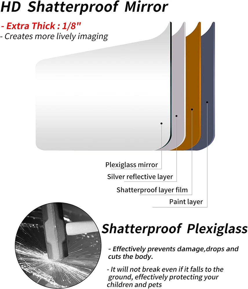 Store New Arrivals Add to Favorite View Feedback Contact Full Length Wall Mirror Tiles,Glassless Mirror for Kids,Acrylic Extra Thick... Description Item model number 4Pcs 10"x10" Style 不拘一格 Number of Items 4 Country of Origin China Theme 人物 Number of Pieces 4 Room Type Bathroom, Bedroom, Living Room, Home Office, Nursery Assembly Required No Product Dimensions 40"L x 10"W Material Acrylic Frame Material Plastic Finish Type Acrylic Specific Uses For Product Dressing, 化妆品, Camping, Workout, Dance Frame Type Unframed Item Weight 1.04 pounds Surface Recommendation Plastic Special Feature 防碎 Mounting Type Door Mount,Wall Mount Color Silver Shape Rectangular Size 4 Pack (10"x10" x 0.125”) (Acrylic Material): Made of acrylic non-glass shatterproof,bendable,will not be damaged if accidentally dropped on the ground,not a real glass mirror,perfect for your kids and pets to play safely.awesome DIY mirrors,you can use your imagination to arranging mirror sheets into any shape to decorate the wall (Super Thick):Thickness: 0.125", approx 40"L x 10"W, (4 Pcs 10"x10"), because our thickness is 0.125" thick,the others are only 0.07", so the definition is very high, the image is clear and undistorted (Applicable Scenes):Our acrylic mirror with reflective effect can be applied for nice decorations, making the interior space more spacious.suitable for bedrooms,living rooms,dinning room,bathrooms,dressing rooms,children bedroom,gyms,classroom,offices,etc.you can use this to enlarge your space or illuminate the dark walls to make your home look different and more attractive (Easy Installation):Package coming with powerful double sided foam tape. It can be easily installed on smooth walls, latex paint walls, light-hole tiled wall furniture or wooden doors,after installation please tear off the protective film on the surface.but not for wallpaper, blistering wall, ash-falling wall, moistured wall (Note): Before the first use, tear off a layer of protective film (if the protective film is not torn off, the mirror surface will be blurred),only clean the mirror with a soft cloth and warm water,please not to touch or wipe the mirror surface with your hands Unbreakable Full Body Mirror Cheap,Wall Mounted Mirror,Extra Thick 0.125",40"x10" 4Pcs 10"x10",Made Of Shatterproof Plexiglass Acrylic,Long Mirrors For Bedroom Closet,Workout For Home Gym Mirror ABOUT US We offer the best prices around on high quality products. Our E-store includes media such as books, movies, music and games while offering electronics, toys, sporting apparel, clothing, tools, general home, garden items and more. SHIPPING We are always working hard to ensure your package arrives as soon as possible. Please understand that some factors like weather, high postal traffic, and the performance of shipping companies are outside of our control. We offer free shipping to the lower 48 states and ship within 2 business days of payment, usually sooner. We do not accept P.O. Boxes. Please provide a physical address. For shipping outside of the continental USA, we only use eBay's Global Shipping Program.The item is shipped to KY and then sent to the rest of the world. International customers are responsible for all duties and taxes. Continue to check out in order to calculate costs for shipping the item to your country. Messages regarding eBay's Global Shipping Program MUST be directed at eBay EXCLUSIVELY. CUSTOMER SATISFACTION We try our very best to make sure every customer is completely satisfied. If there's a problem, message us! We're happy to help.