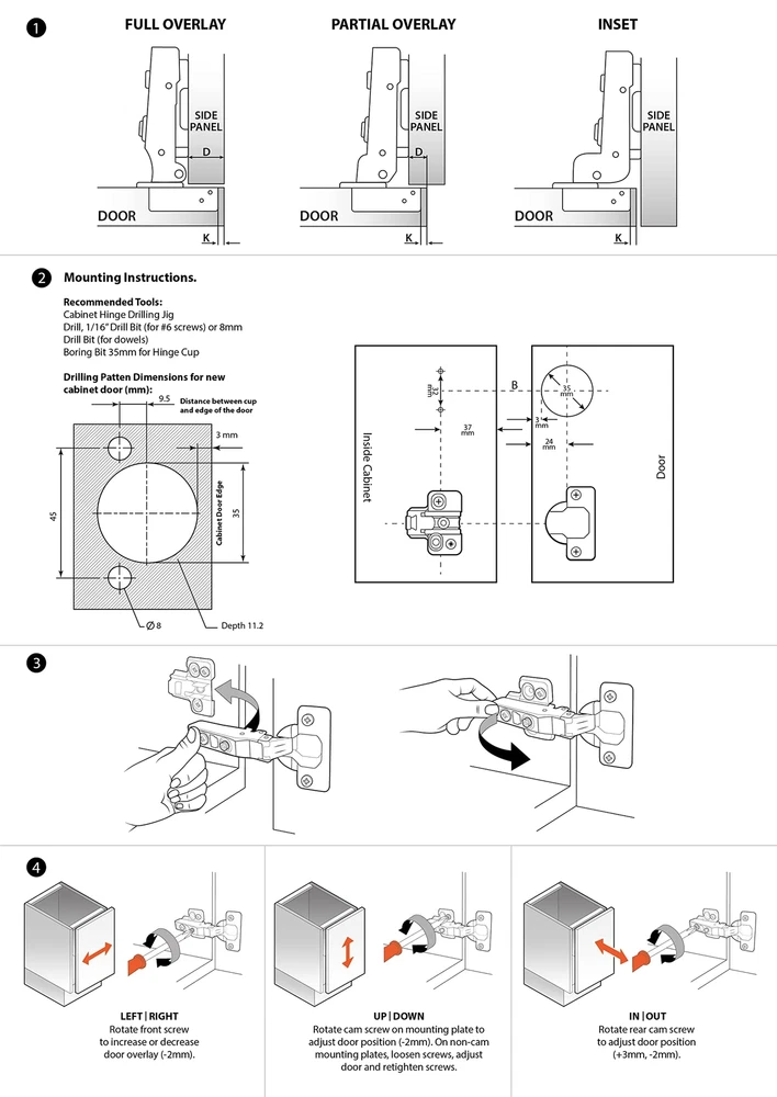 closing full overlay kitchen drawers door cabinets concealed faceframe inset doors hinged shower bathroom insert closet home improvement hardware stainless steel small self brushed nickel damper hidden locking black slow drawer adapter amazon face HTML DESCRIPTION: Frameless Soft Close Hinges: Cabinet Hinges provide long-lasting durability, a soft close damper, and the reinforced strength to outlast even the roughest kitchens or bathrooms. 3 Way Adjustment Structure The cabinet hinges have 3 way adjustments, which is better than a 2 way adjustment in normal. Then ,it means you could: Adjust Up and Down Adjust Left and Right Adjust Front and Back They would give countless adjustment chances to you until you are satisfied! Excellent damper When you open a door and leave it, it stays back and forth. You’ve probably been shocked by the door's creaking noise. Luckily, the cabinet hinges are equipped with an excellent damper. So it would provide: Super smooth operation Suitable closing speed which could protect your hands Silent open and close, provide a comfortable home environment Product Details: Frameless Cabinet Hinges Self, Soft-Closing Design with Built-In Damper Angle Opening: 105° 35mm Bore (Hinge Cup) Available Quantities: 10, 20, 40, or 50 Include Matching Screws Slow Close Cabinet Hinges: Our soft close hinges for cabinet doors feature a built-in soft-close damper that prevents door from slamming shut to protect fingers & reduce noise making peacefulness for families with small children, senior adults, or pets 30 Years of Lifespan: These heavy-duty concealed cabinet door hinges are crafted with strong and durable steel to ensure they open and close up to 50,000 times for a lifetime of reliable use. Ideal for your living spaces supporting modern cabinetry Precise Placement: Our full overlay cabinet hinges are designed with 3-D adjustments and Clip-on-plate for a faster, more efficient installation & removal, making them the best choice for DIY home use as well as for contractors finishing custom jobs Improved Accessibility: These frameless cabinet hinges are designed with 35mm bore (hinge cup) and a 105° wider opening angle to make it easier to access pots, pans, dishware, toiletries. Ideal for kitchens, bathrooms, and other spaces supporting modern cabinetry. Frameless Concealed Hinges for Cabinets Door: Hidden inside the cabinet for a sleek, sophisticated, and modern look. Perfect for bath and kitchen cabinet doors, offering a clean exterior with smooth, functional operation. Great for contemporary design