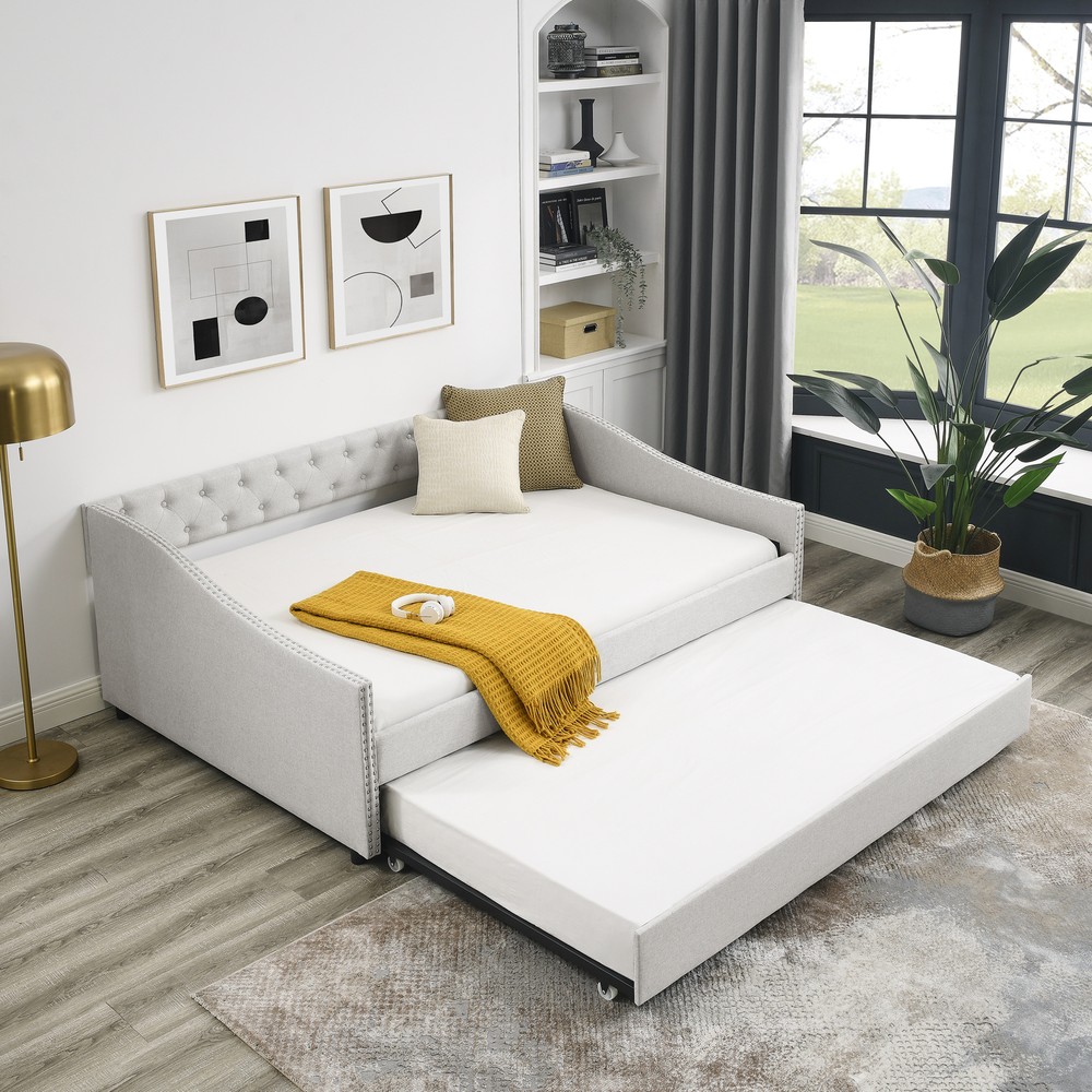 Absolutely love this daybed—it’s both stylish and practical! The tufted upholstery and nailhead trim give it a chic mid-century vibe that elevates any space. The trundle is a game-changer for extra sleeping space without sacrificing style. Sturdy frame ensures durability, and the waved arms add a touch of elegance. Perfect for lounging or hosting guests!