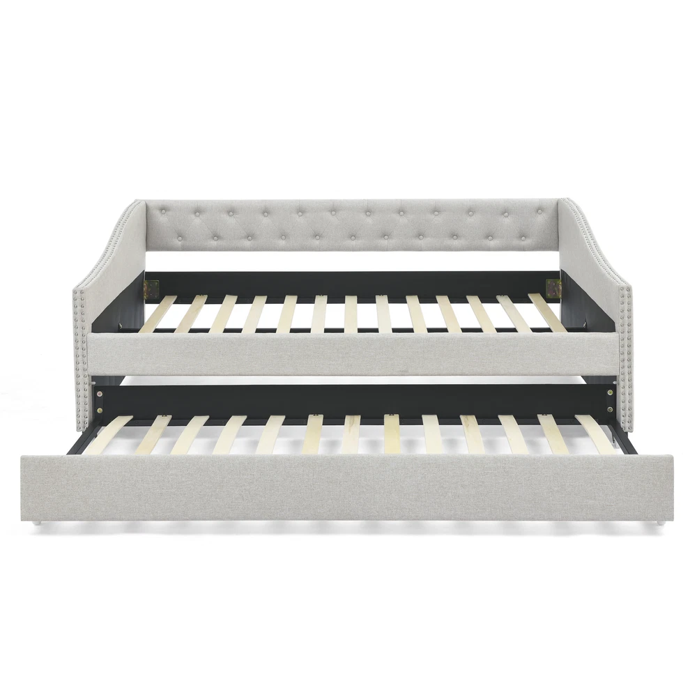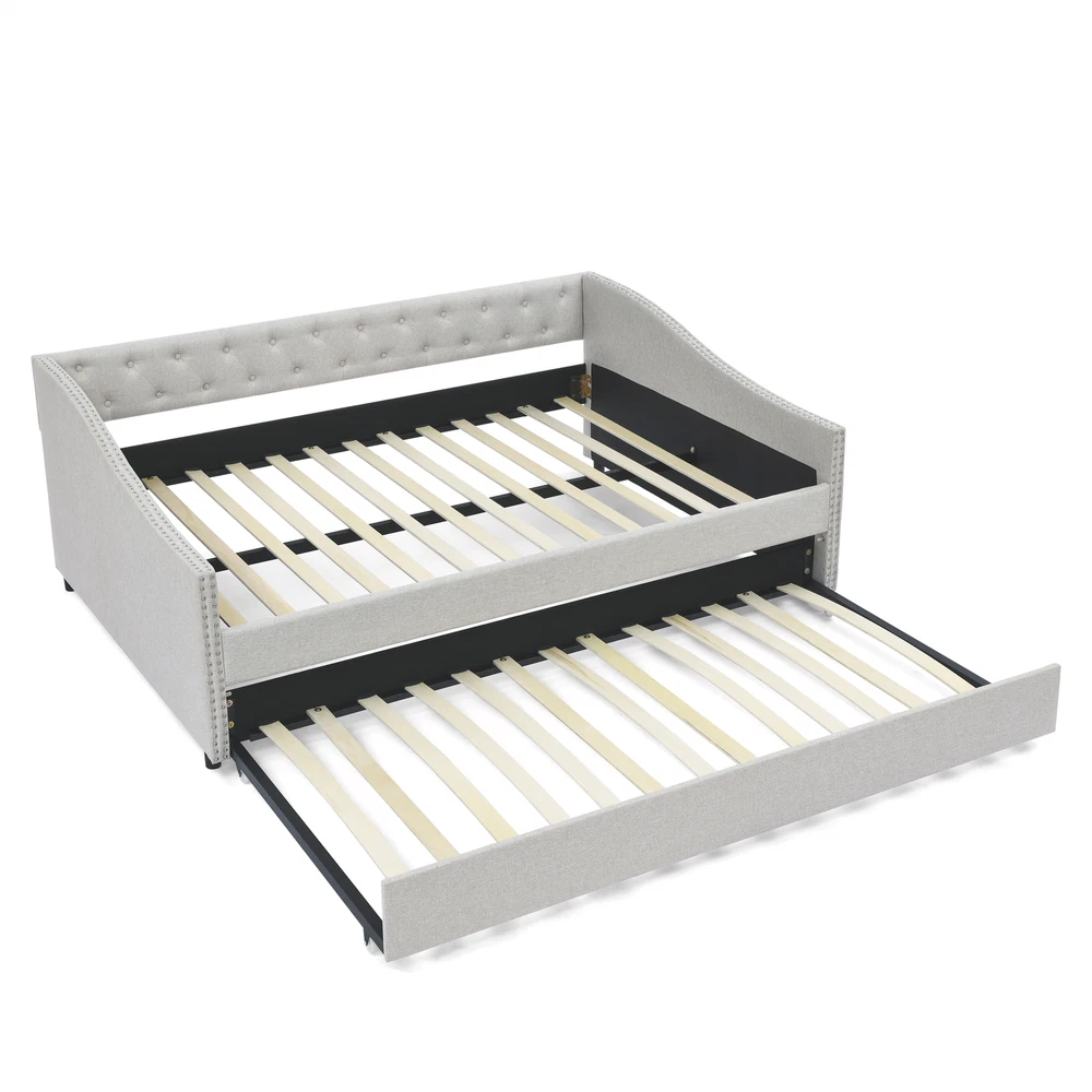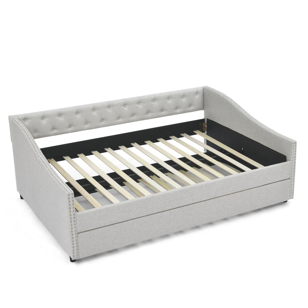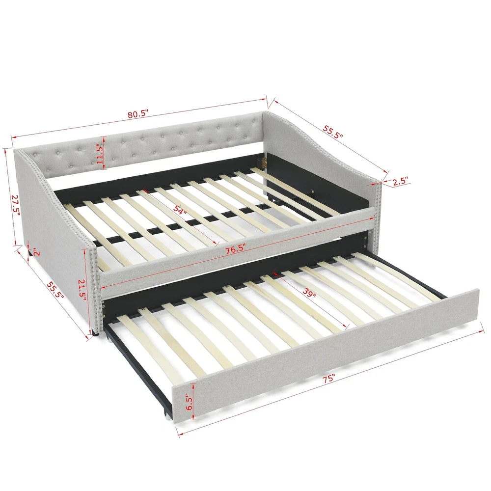 [Stunning Look] This mid-century - inspired daybed features a button tufted back which creates an elegant look. The waved shape arms decorated with nailhead trimming blends chic details with classic style. This daybed lends a sophisticated air to your home. [Functional Trundle] This exceptional piece of living room furniture is manufactured to meet your needs, allowing the cozy bed to not only afford a comfortable seating experience but also one trundle under the bed provide more sleeping space. [Reinforced Frame] The frame of this daybed with drawers is crafted from a combination of eucalyptus wood and MDF board to effortlessly hold up to 500lbs. [Comfortable Experience] Foam padded sides and back that provide optimal back support and comfort.This ful... Full Size Daybed with Twin Size Trundle Upholstered Tufted Sofa Bed, with Button on Back and Copper Nail on Waved Shape Arms,Beige (80.5"x55.5"x27.5") [Stunning Look] This mid-century - inspired daybed features a button tufted back which creates an elegant look. The waved shape arms decorated with nailhead trimming blends chic details with classic style. This daybed lends a sophisticated air to your home. [Functional Trundle] This exceptional piece of living room furniture is manufactured to meet your needs, allowing the cozy bed to not only afford a comfortable seating experience but also one trundle under the bed provide more sleeping space. [Reinforced Frame] The frame of this daybed with drawers is crafted from a combination of eucalyptus wood and MDF board to effortlessly hold up to 500lbs. [Comfortable Experience] Foam padded sides and back that provide optimal back support and comfort.This full-size daybed provides you with a great seating experience that ergonomically supports your back and arms. Meanwhile gorgeous soft fabric ensures you can keep cool for extended periods. [Storage Function] Pull-out drawers provide more storage space for cloths, pillows, toys and so on. [Overall size] 80.5''x55.5''x27.5''. Daybed Size:75x54 inches Trundle size :75x39 inches No Matress Included. Maximum Weight Capacity:500 lbs. Item Specifics Brand Unbranded Type sofa Color Beige Upholstery Fabric Polyester Item Length 81.3 in Item Width 12.8 in Item Height 7.3 in About us Dear buyer, Thank you for visiting my store! Our warehouses are located in many regions around the United States. According to the customer's delivery address. Use USPS/UPS/DHL logistics transportation service. Prioritize the best quality logistics solutions to transport packages. Ensure package delivery time, At the same time. Have any after-sales problems, Feel free to contact us. At your service Payment PayPal is our preferred method of payments it's the quickest, easiest and most secure way to pay for your goods or services online. PayPal offers buyer and seller protection should there be a problem. If you do not have a PayPal account, to get started and buy your first item with us is very easy. Simply click on the 'Buy It Now' button and follow the eBay checkout steps. Select PayPal as the payment method you then will be given the chance to enter your card details in to PayPal's secure checkout in order to pay for your order. Shipping 1. Your purchase is shipped directly to you as soon as we have received your cleared payment. 2. Normally all of parcels would be shipped within 3days(From Monday to Saturday). 3. We will send information on eBay or email if the parcel was delayed due to our holiday. 4. We provide three kinds of shipping for choice. Shipping way depend on delivery address. Returns If an unit is received defective, of course we take it back or replace it. If the unit is received as expected, we must charge for our expenses if you want to send it back. We have to charge for the work of handling, retesting and restocking. DESCRIPTION PAYMENT SHIPPING RETURN POLICY CONTACT US Shop Category Store Home Other Hot Item 8 cu. ft. Dual-Wheel Wheelbarrow, Pro-Grade Poly Bucket, Steel Handles, Dual 16 USD 223.90 5.5 cu. ft. Heaped Poly Smart Plastic Garden Cart USD 70.98 6 cu. ft. Steel Tub Wheelbarrow with Wooden Handles and Pneumatic Tire USD 113.90 Co-op Cycles DRT 1.1 Mountain Bike USD 419.29 Flextreme 5/8 in. Dia x 50 ft. Black Performance Rubber Garden Hose USD 46.70 Delivery New List Item Convertible Combination Sofa Sofa L-Shaped Sofa with Storage Cabinet Footstool, USD 380.92 Amonia 5-piece Dining Set, Turned-Leg Dining Table with 4 Tufted Chairs USD 749.26 Amonia 5-piece Dining Set, Turned-Leg Dining Table with 4 Tufted Chairs USD 749.26 Rustic Style Antique White 1pc SOFA TABLE Open Bottom Shelf Plank Style Table To USD 358.70 Dark Cherry 1pc Sofa Table Open Bottom Shelf Glass Insert Top Cocktail Table Liv USD 395.15 Help & Info Payment Policy Shipping Policy Return Policy FAQ About Us Full Size Daybed with Twin Size Trundle Upholstered Tufted Sofa Bed, with Button on Back and Copper Nail on Waved Shape Arms,Beige (80.5"x55.5"x27.5") [Stunning Look] This mid-century - inspired daybed features a button tufted back which creates an elegant look. The waved shape arms decorated with nailhead trimming blends chic details with classic style. This daybed lends a sophisticated air to your home. [Functional Trundle] This exceptional piece of living room furniture is manufactured to meet your needs, allowing the cozy bed to not only afford a comfortable seating experience but also one trundle under the bed provide more sleeping space. [Reinforced Frame] The frame of this daybed with drawers is crafted from a combination of eucalyptus wood and MDF board to effortlessly hold up to 500lbs. [Comfortable Experience] Foam padded sides and back that provide optimal back support and comfort.This full-size daybed provides you with a great seating experience that ergonomically supports your back and arms. Meanwhile gorgeous soft fabric ensures you can keep cool for extended periods. [Storage Function] Pull-out drawers provide more storage space for cloths, pillows, toys and so 