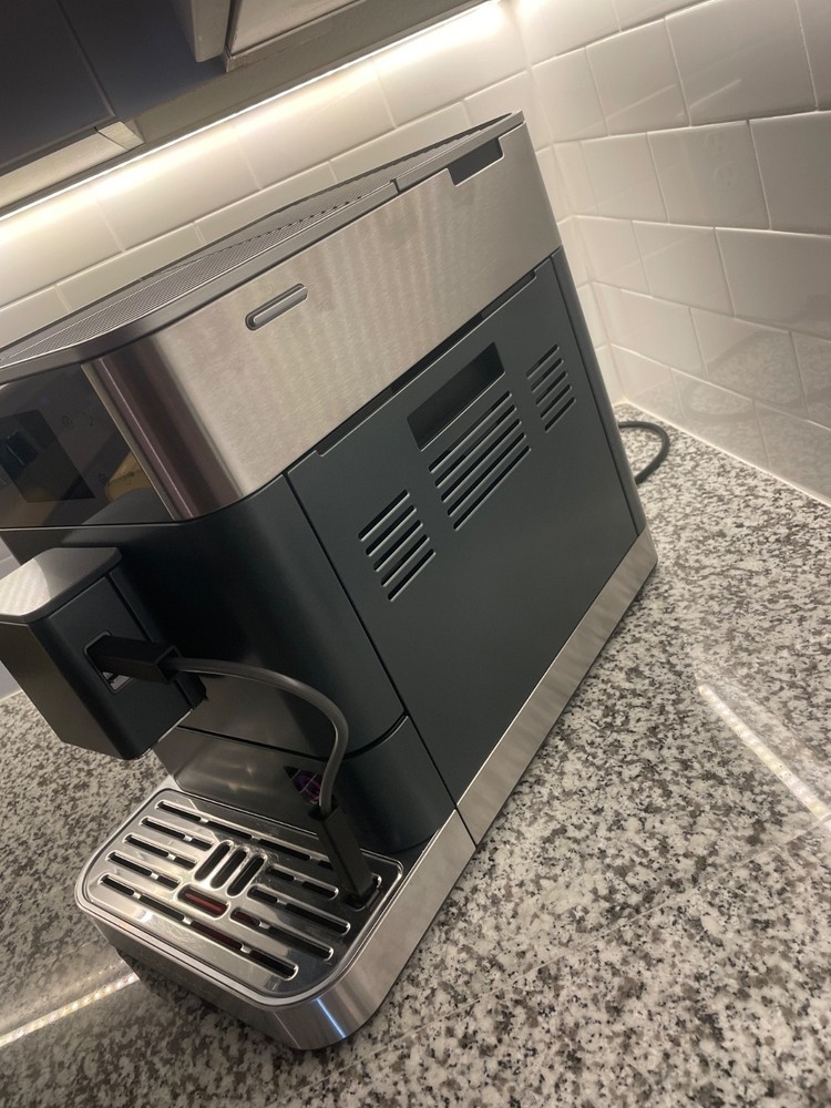 The KitchenAid KF7 fully automatic espresso machine is a versatile and convenient appliance for making a variety of coffee beverages such as espresso, latte macchiato, and cappuccino. With features like a built-in grinder, frother, programmable controls, and adjustable coffee spouts, this machine offers convenience and precision in every cup. The machine also includes useful components like a self-cleaning mode, water level indicator, and removable drip tray, making it easy to use and maintain. Perfect for coffee enthusiasts looking for a high-quality and efficient espresso machine for their home. Has only been used once for testing. Works great but I want a manual machine. Comes with a warranty.