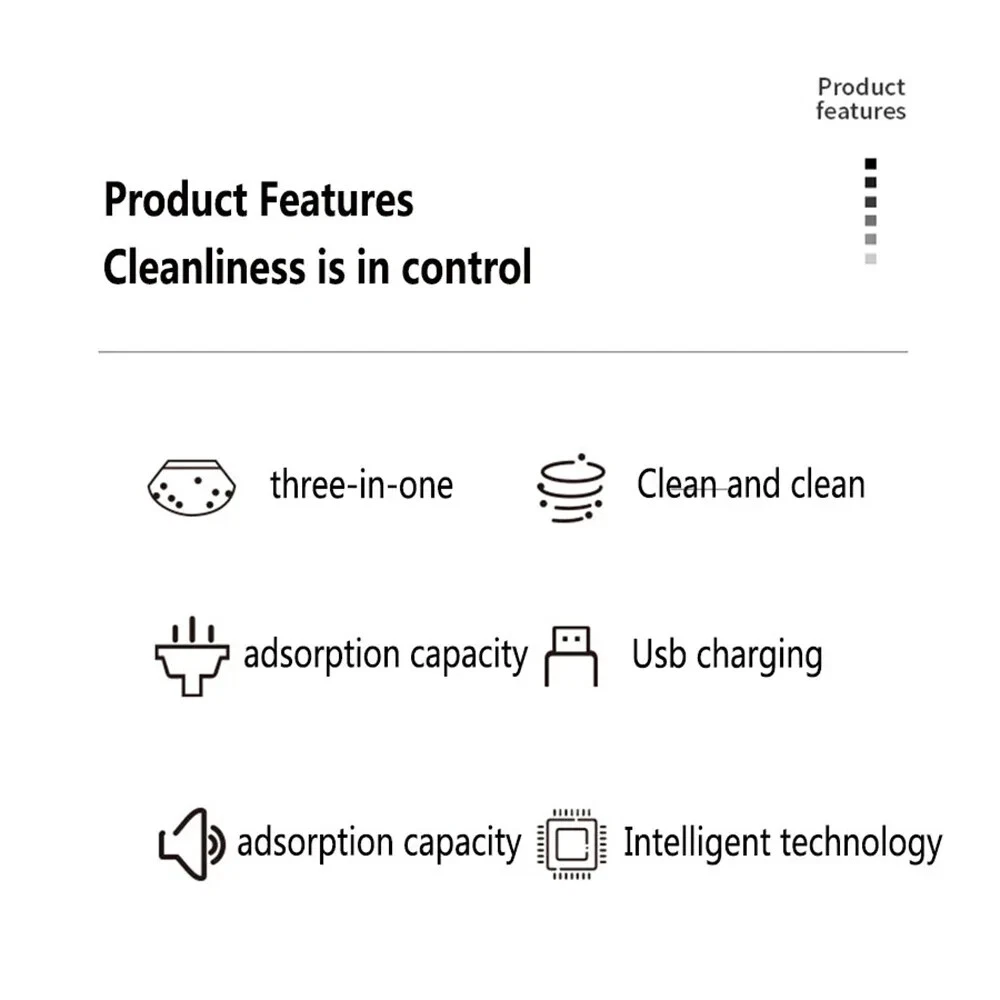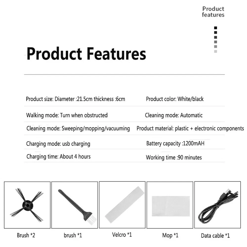 Fully automatic smart sweeper three-in-one USB vacuum cleaner wet and dry cleaning machine household appliances Product Description: Sweeping machine style: intelligent robot Sweeping machine function: all-in-one machine for sweeping, suction and dragging Colors: White, Black Cleaning route: random Operation mode: mechanical Power mode: USB Timing function: no timing Switch type: touch Use environment: household Rated voltage: 3.7V Rated power: 4.5W Applicable area: less than 70 square meters Capacity: 200ML Suction: 1000~1499Pa Battery life: 0-60 minutes Whether with a remote control: No LCD display: no Is there a scheduled appointment function: No Whether there is a virtual wall: no Collision Protection: Mechanical Collision Whether to charge automatically: No Motor type: common motor