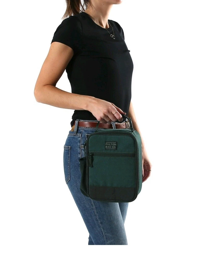 The Fulton Bag Co. Upright Lunch Bag in Dark Emerald is a stylish and compact lunch bag measuring 9 inches in height and 6.5 inches in width. This product is designed for carrying your meals and snacks while on the go, with a dark emerald green color that adds a touch of sophistication to your lunchtime routine.