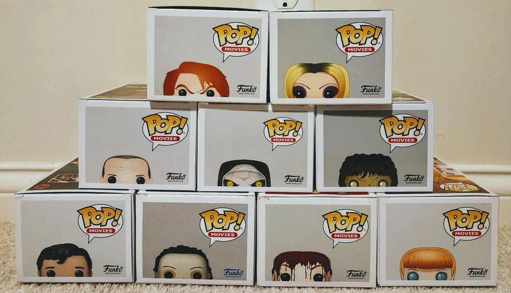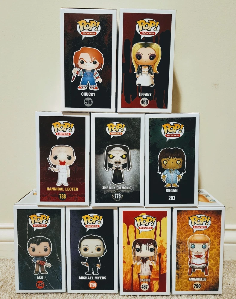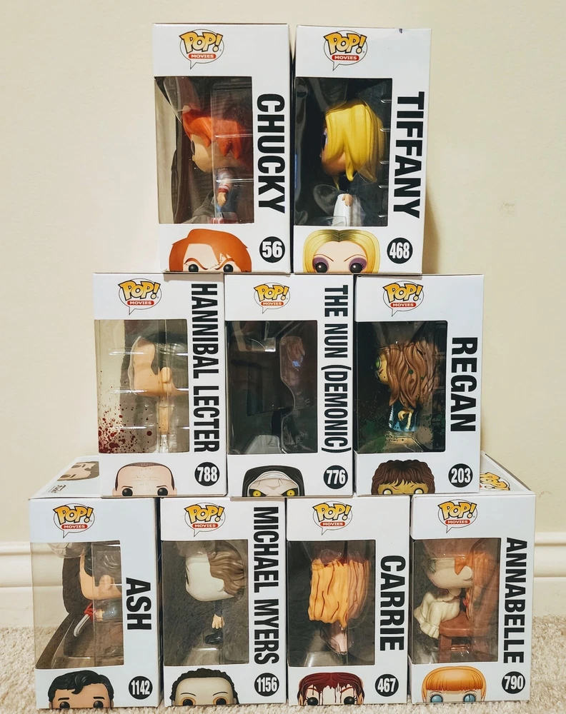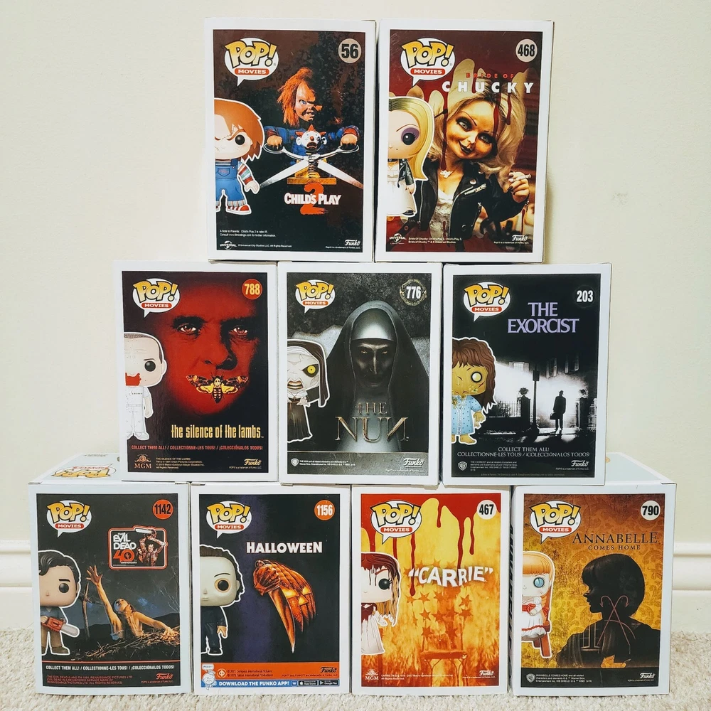 This Funko Pop Movies: Horror set includes 9 collectible figures with various conditions. The set features popular horror movie characters such as Tiffany, Regan, Hannibal Lecter, Chucky, Ash, Michael Myers, The Nun, Annabelle, and Carrie. The figures come in a box that is damaged but still includes protectors. The set is perfect for horror movie fans who enjoy collecting unique and rare items. The Funko Pop! figures are highly detailed and come with multiple features, making them a great addition to any collection. Get your hands on this must-have horror collection today!
