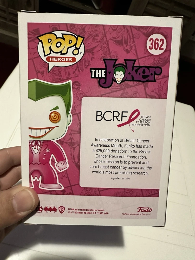 Brand New, box has minor wear from sitting in storage. 9/10 box condition, my opinion, see pictures for clarity. Will ship with care. Funko Pop! The Joker (Cancer Awareness) #362