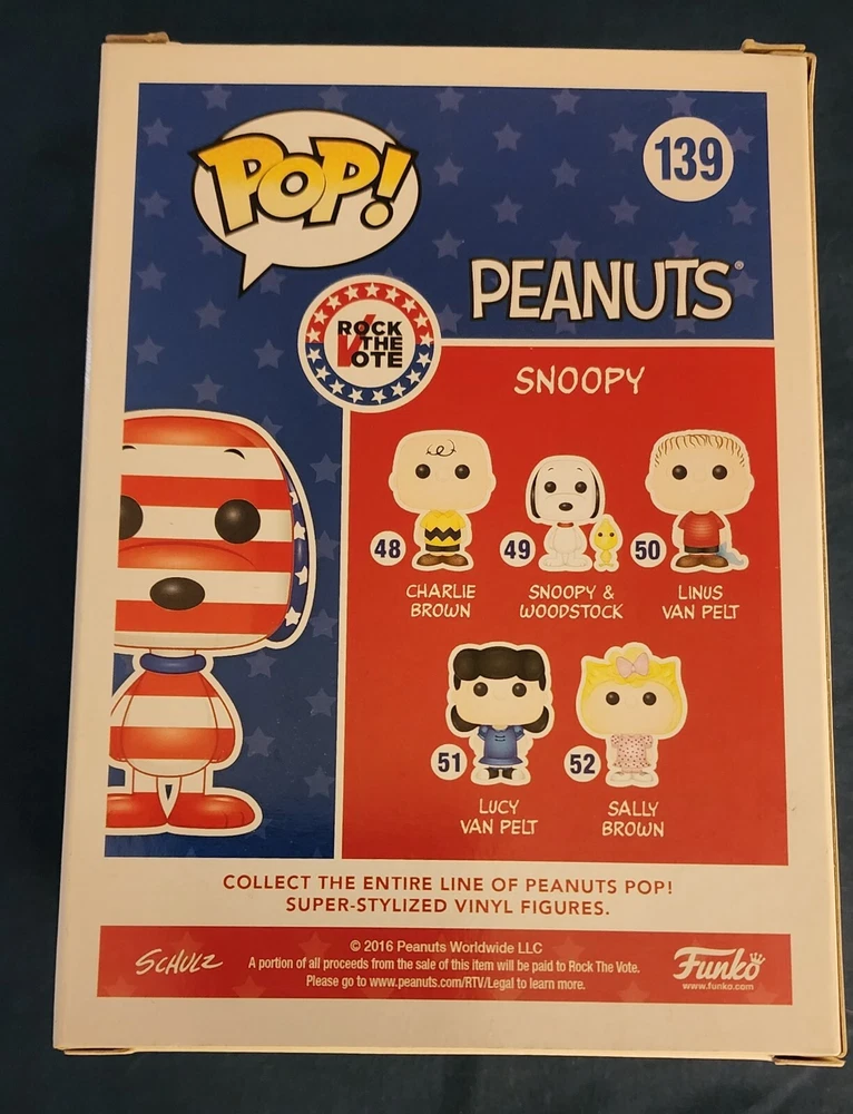 This Funko Pop vinyl figure features Snoopy from the beloved Peanuts comic strip. This limited edition figure was released in 2016 and featured exclusively at the San Diego Comic Con. The figure is part of the "Rock the Vote" collection and is a must-have for any Peanuts or comic fan. The Funko Pop model is designed with attention to detail and accurately captures the essence of Snoopy's character. It is a great addition to any collection of collectible figures and bobbleheads. With its exclusive status and unique design, this Funko Pop is a rare find that any fan would be proud to own. 100% of this sale benefits a dog rescue organization, thanks for looking!