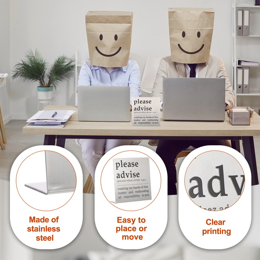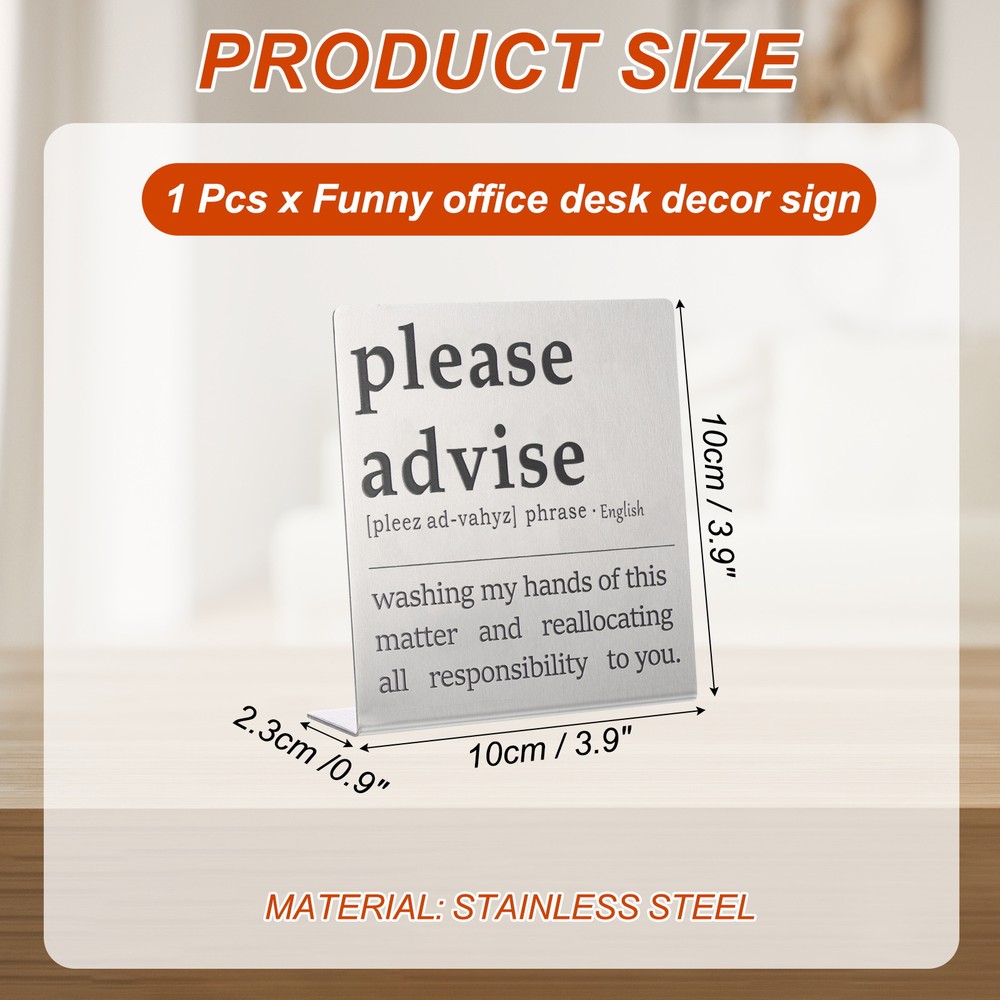 Document MULTIPURPOSE - Funny desk decoration signs use humorous sentences to inspire smile and liven up the office atmosphere, bringing personality and fun to any workspace. Perfect for birthdays, events, home, and office decorationWHAT YOU GET - 1 x Funny office desk decor sign. And their sizes are: 10cm x 2.3cm x 10cm / 3.9inch x 0.9inch x 3.9inch(L*W*H); Material: Stainless steel; Color: Silver; Style: please adviseRELIABLE MATERIAL - The funny desk decoration sign is made of stainless steel, which is strong and not easy to deform, waterproof and rust-proof, and durable. It is small in size and easy to place or move on the desk, and it does not take up too much space. The interesting title content has both decorative effects and brings fun.WIDELY USED - Funny office desk decor sign has a wide range of applications. It can be placed on the desk to decorate and bring fun to busy coworkers. It can be placed on bookshelves and wall cabinets to decorate the corners of the home. It can also be given to friends, colleague as interesting gifts.KINDLY NOTE - Please pay attention to the style and size of the title before purchasing Funny Desk Sign, Funny Nameplate, Silver (please Advise) MULTIPURPOSE - Funny desk decoration signs use humorous sentences to inspire smile and liven up the office atmosphere, bringing personality and fun to any workspace. Perfect for birthdays, events, home, and office decoration WHAT YOU GET - 1 x Funny office desk decor sign. And their sizes are: 10cm x 2.3cm x 10cm / 3.9inch x 0.9inch x 3.9inch(L*W*H); Material: Stainless steel; Color: Silver; Style: please advise RELIABLE MATERIAL - The funny desk decoration sign is made of stainless steel, which is strong and not easy to deform, waterproof and rust-proof, and durable. It is small in size and easy to place or move on the desk, and it does not take up too much space. The interesting title content has both decorative effects and brings fun. WIDELY USED - Funny office desk decor sign has a wide range of applications. It can be placed on the desk to decorate and bring fun to busy coworkers. It can be placed on bookshelves and wall cabinets to decorate the corners of the home. It can also be given to friends, colleague as interesting gifts. KINDLY NOTE - Please pay attention to the style and size of the title before purchasing Hot Item Payment 1.We accept eBay payment . 2.Payment must be received within 7 business days of auction closing. Shipping 1.We ship to your eBay or Paypal address. Please make sure your eBay and Paypal address is correct before you pay. 2.Items will be shipped within 1-3 business day when we received payment. 3.Delivery time depends on destination and other factors. Description Policy Funny Desk Sign, Funny Nameplate, Silver (please Advise) MULTIPURPOSE - Funny desk decoration signs use humorous sentences to inspire smile and liven up the office atmosphere, bringing personality and fun to any workspace. Perfect for birthdays, events, home, and office decoration WHAT YOU GET - 1 x Funny office desk decor sign. And their sizes are: 10cm x 2.3cm x 10cm / 3.9inch x 0.9inch x 3.9inch(L*W*H); Material: Stainless steel; Color: Silver; Style: please advise RELIABLE MATERIAL - The funny desk decoration sign is made of stainless steel, which is strong and not easy to deform, waterproof and rust-proof, and durable. It is small in size and easy to place or move on the desk, and it does not take up too much space. The interesting title content has both decorative effects and brings fun. WIDELY USED - Funny office desk decor sign has a wide range of applications. It can be placed on the desk to decorate and bring fun to busy coworkers. It can be placed on bookshelves and wall cabinets to decorate the corners of the home. It can also be given to friends, colleague as interesting gifts. KINDLY NOTE - Please pay attention to the style and size of the title before purchasing Hot Item Payment 1.We accept eBay payment . 2.Payment must be received within 7 business days of auction closing. Shipping 1.We ship to your eBay or Paypal address. Please make sure your eBay and Paypal address is correct before you pay. 2.Items will be shipped within 1-3 business day when we received payment. 3.Delivery time depends on destination and other factors.