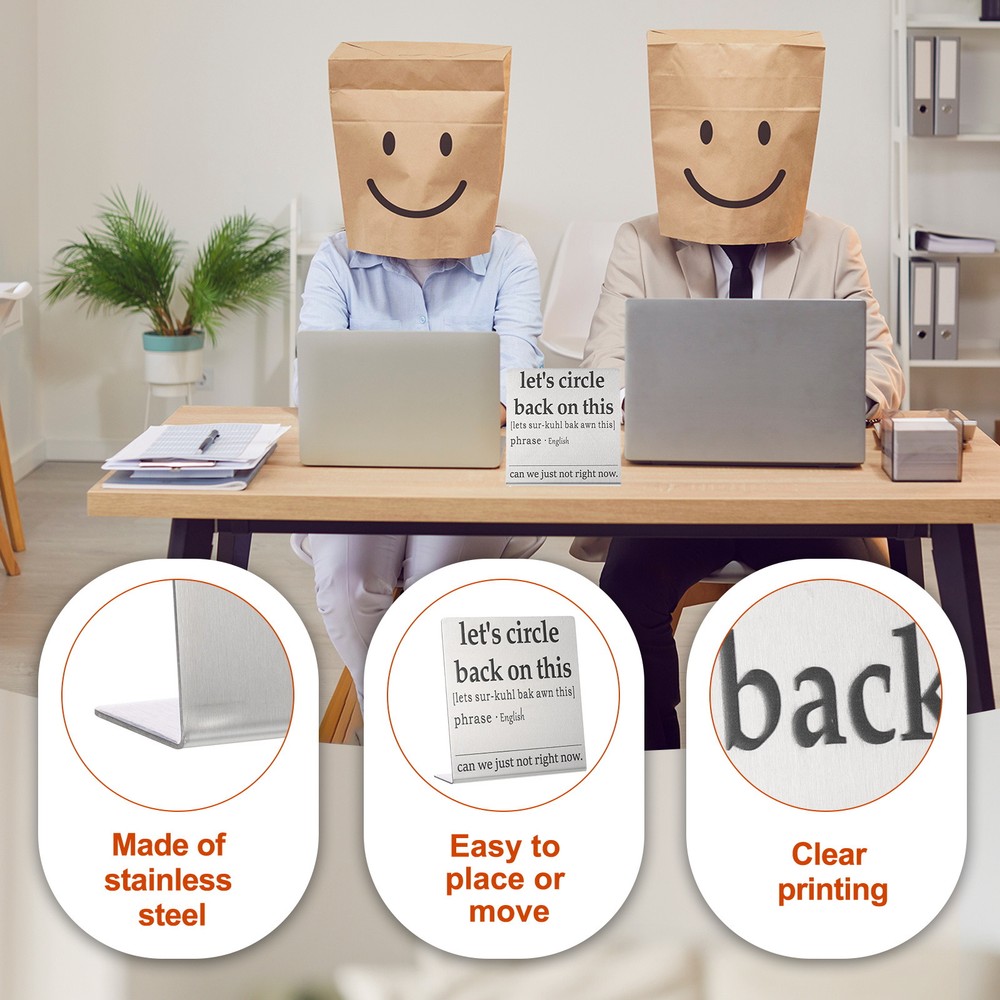 Document MULTIPURPOSE - Funny desk decoration signs use humorous sentences to inspire smile and liven up the office atmosphere, bringing personality and fun to any workspace. Perfect for birthdays, events, home, and office decorationWHAT YOU GET - 1 x Funny office desk decor sign. And their sizes are: 10cm x 2.3cm x 10cm / 3.9inch x 0.9inch x 3.9inch(L*W*H); Material: Stainless steel; Color: Silver; Style: let's circle back on thisRELIABLE MATERIAL - The funny desk decoration sign is made of stainless steel, which is strong and not easy to deform, waterproof and rust-proof, and durable. It is small in size and easy to place or move on the desk, and it does not take up too much space. The interesting title content has both decorative effects and brings fun.WIDELY USED - Funny office desk decor sign has a wide range of applications. It can be placed on the desk to decorate and bring fun to busy coworkers. It can be placed on bookshelves and wall cabinets to decorate the corners of the home. It can also be given to friends, colleague as interesting gifts.KINDLY NOTE - Please pay attention to the style and size of the title before purchasing Funny Desk Sign, Funny Nameplate, Silver (let's Circle Back on This) MULTIPURPOSE - Funny desk decoration signs use humorous sentences to inspire smile and liven up the office atmosphere, bringing personality and fun to any workspace. Perfect for birthdays, events, home, and office decoration WHAT YOU GET - 1 x Funny office desk decor sign. And their sizes are: 10cm x 2.3cm x 10cm / 3.9inch x 0.9inch x 3.9inch(L*W*H); Material: Stainless steel; Color: Silver; Style: let's circle back on this RELIABLE MATERIAL - The funny desk decoration sign is made of stainless steel, which is strong and not easy to deform, waterproof and rust-proof, and durable. It is small in size and easy to place or move on the desk, and it does not take up too much space. The interesting title content has both decorative effects and brings fun. WIDELY USED - Funny office desk decor sign has a wide range of applications. It can be placed on the desk to decorate and bring fun to busy coworkers. It can be placed on bookshelves and wall cabinets to decorate the corners of the home. It can also be given to friends, colleague as interesting gifts. KINDLY NOTE - Please pay attention to the style and size of the title before purchasing Hot Item Payment 1.We accept eBay payment . 2.Payment must be received within 7 business days of auction closing. Shipping 1.We ship to your eBay or Paypal address. Please make sure your eBay and Paypal address is correct before you pay. 2.Items will be shipped within 1-3 business day when we received payment. 3.Delivery time depends on destination and other factors. Description Policy Funny Desk Sign, Funny Nameplate, Silver (let's Circle Back on This) MULTIPURPOSE - Funny desk decoration signs use humorous sentences to inspire smile and liven up the office atmosphere, bringing personality and fun to any workspace. Perfect for birthdays, events, home, and office decoration WHAT YOU GET - 1 x Funny office desk decor sign. And their sizes are: 10cm x 2.3cm x 10cm / 3.9inch x 0.9inch x 3.9inch(L*W*H); Material: Stainless steel; Color: Silver; Style: let's circle back on this RELIABLE MATERIAL - The funny desk decoration sign is made of stainless steel, which is strong and not easy to deform, waterproof and rust-proof, and durable. It is small in size and easy to place or move on the desk, and it does not take up too much space. The interesting title content has both decorative effects and brings fun. WIDELY USED - Funny office desk decor sign has a wide range of applications. It can be placed on the desk to decorate and bring fun to busy coworkers. It can be placed on bookshelves and wall cabinets to decorate the corners of the home. It can also be given to friends, colleague as interesting gifts. KINDLY NOTE - Please pay attention to the style and size of the title before purchasing Hot Item Payment 1.We accept eBay payment . 2.Payment must be received within 7 business days of auction closing. Shipping 1.We ship to your eBay or Paypal address. Please make sure your eBay and Paypal address is correct before you pay. 2.Items will be shipped within 1-3 business day when we received payment. 3.Delivery time depends on destination and other factors.